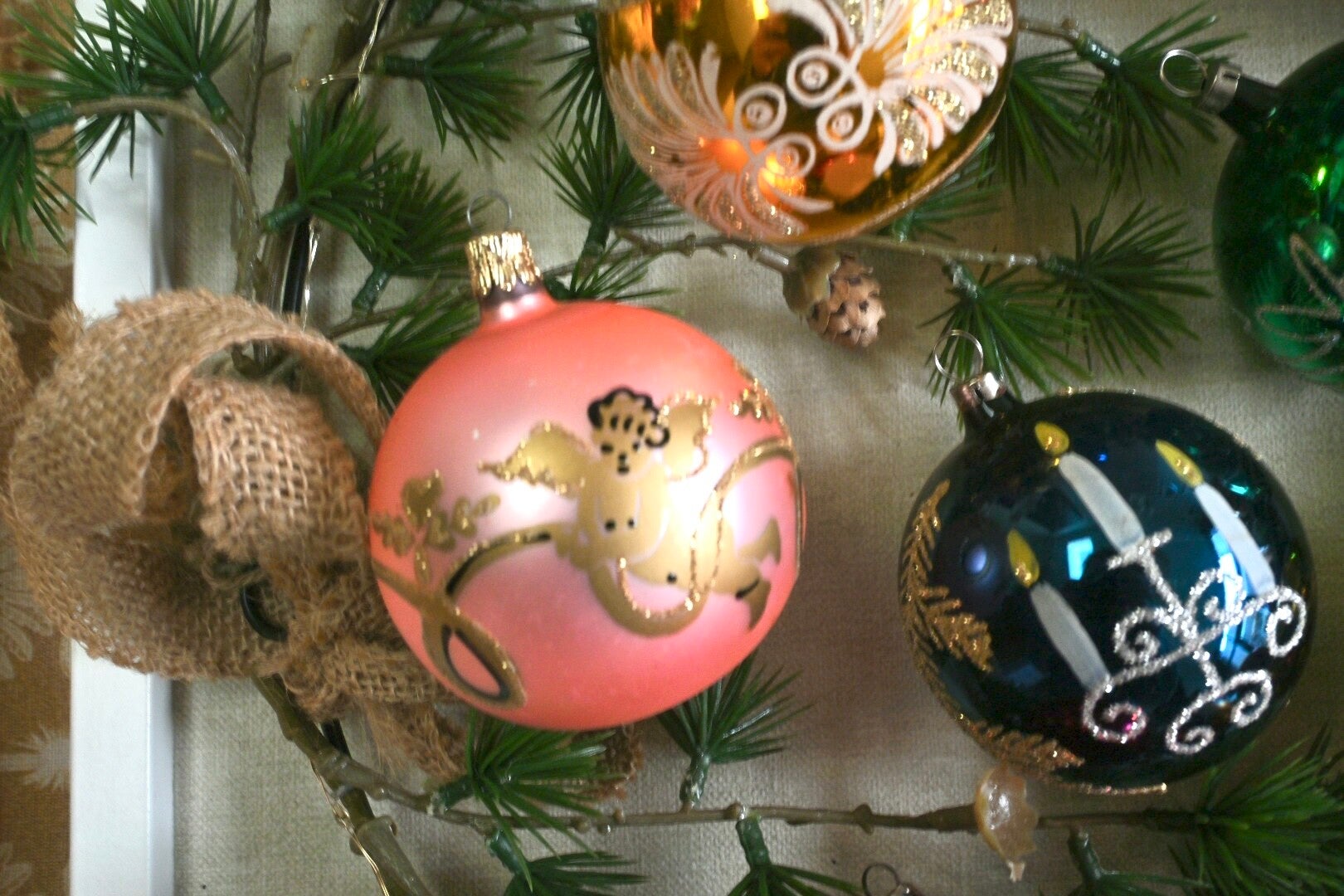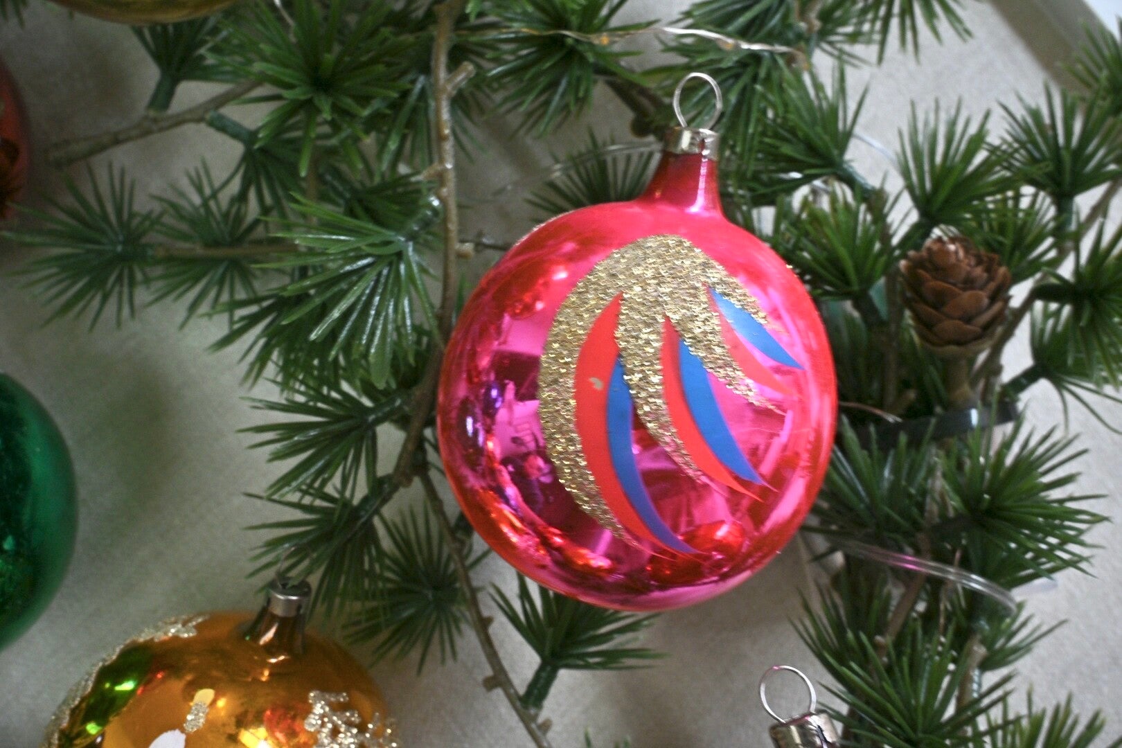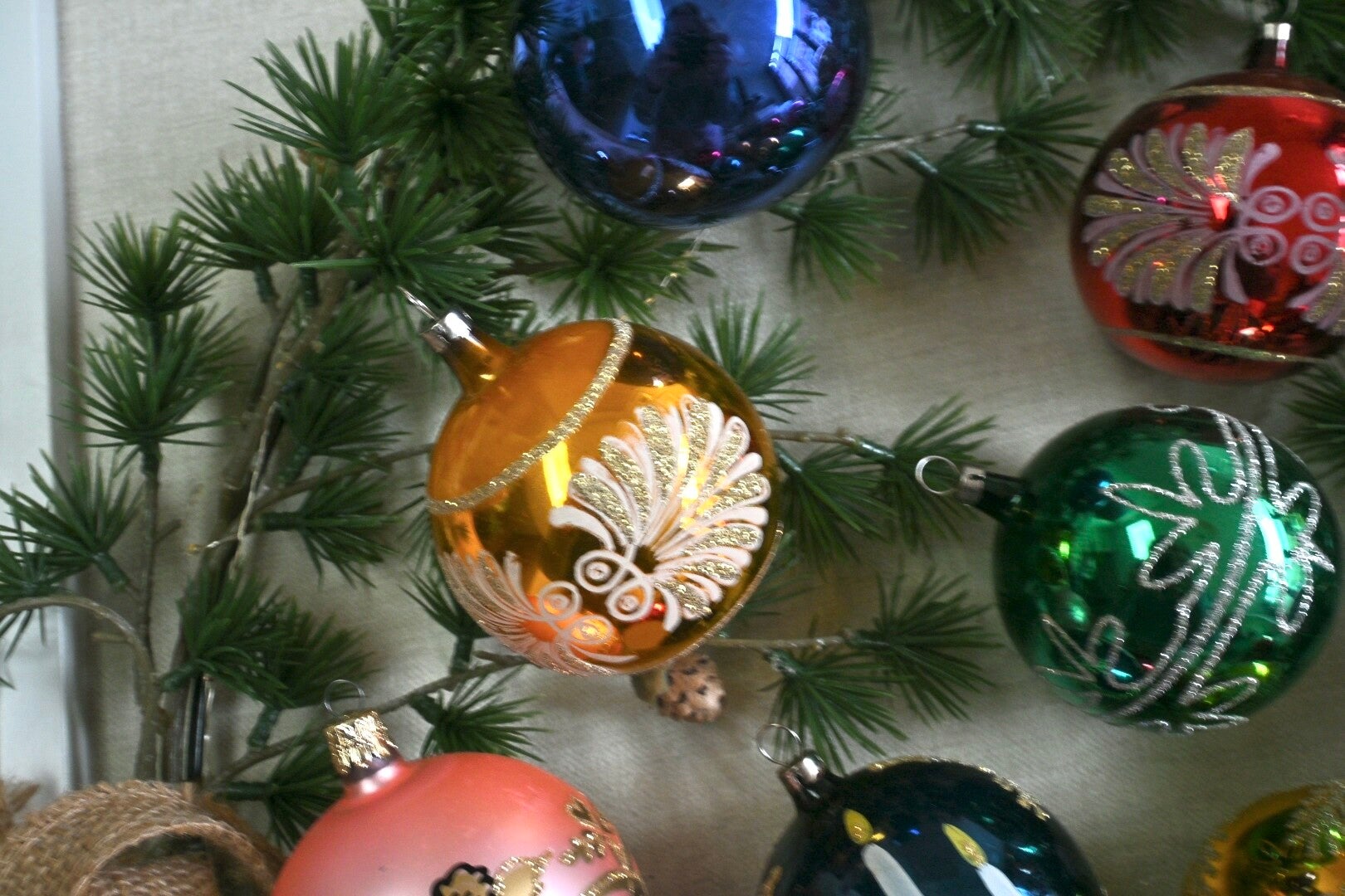 Complete doos met grote antieke gekleurde kerstballen. De kerstballen verkeren nog in een mooie staat gezien de leeftijd. In totaal zijn het 12 kerstballen incl. doos.