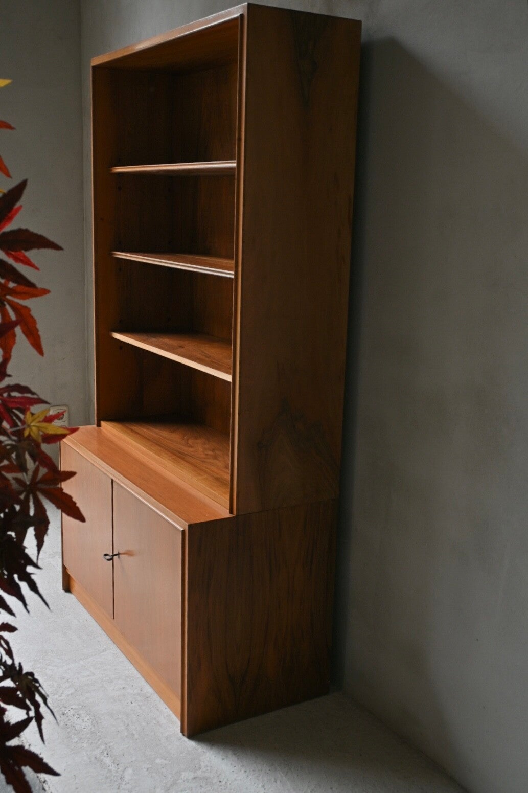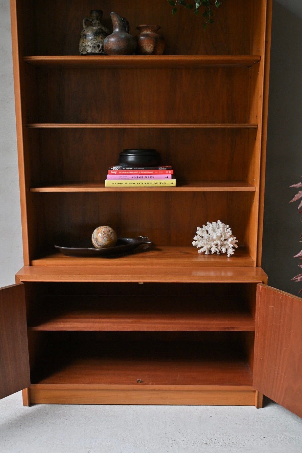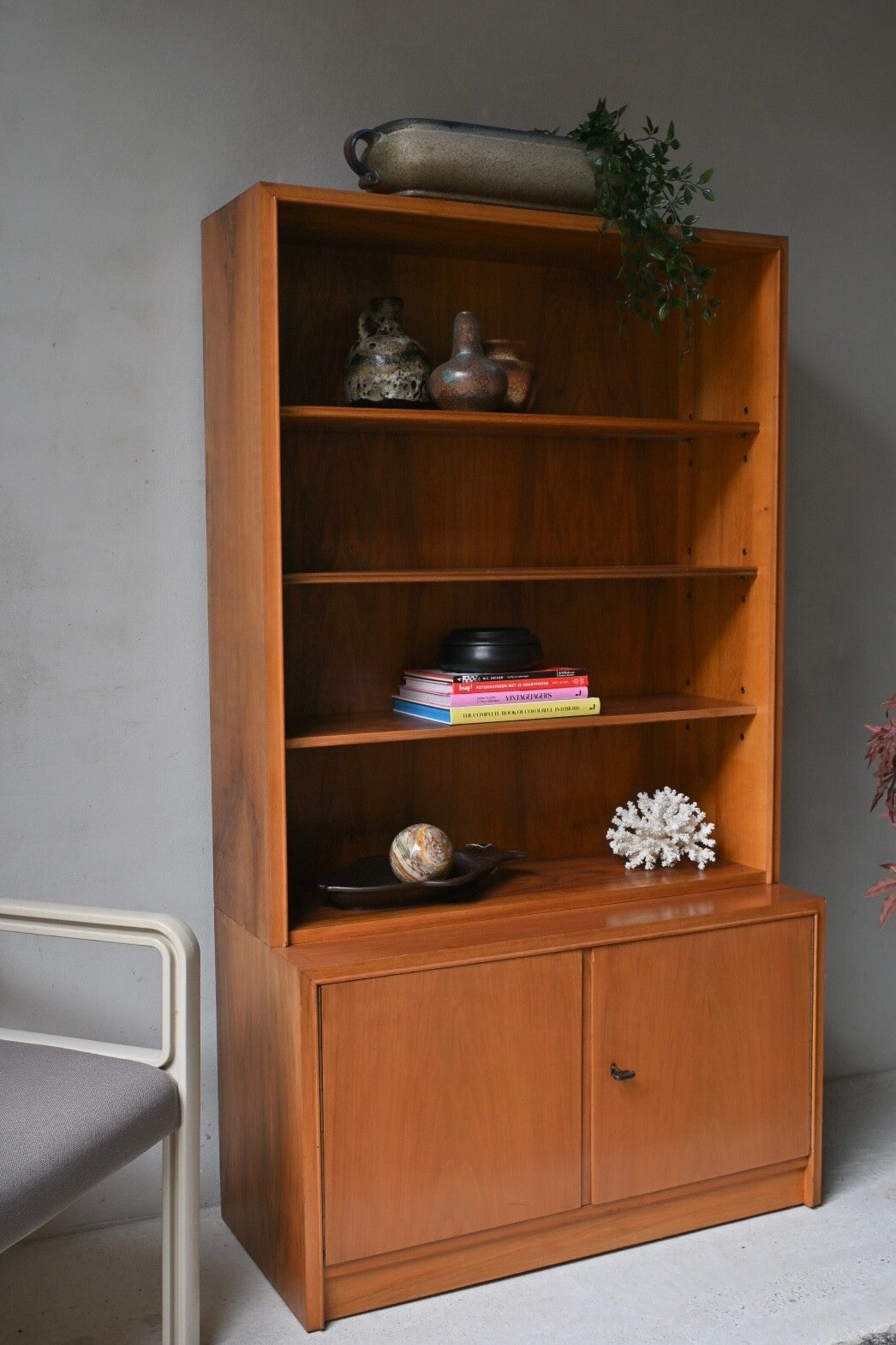Een hele toffe kast met een echte mid-century uitstraling tevens biedt de kast veel opbergruimte. De onderkast is voorzien van 2 deuren met daarachter legplanken. De bovenkast heeft drie open legplanken.