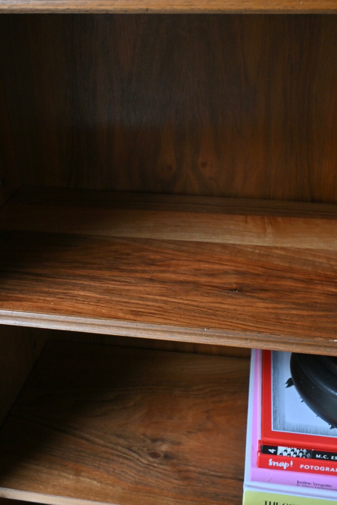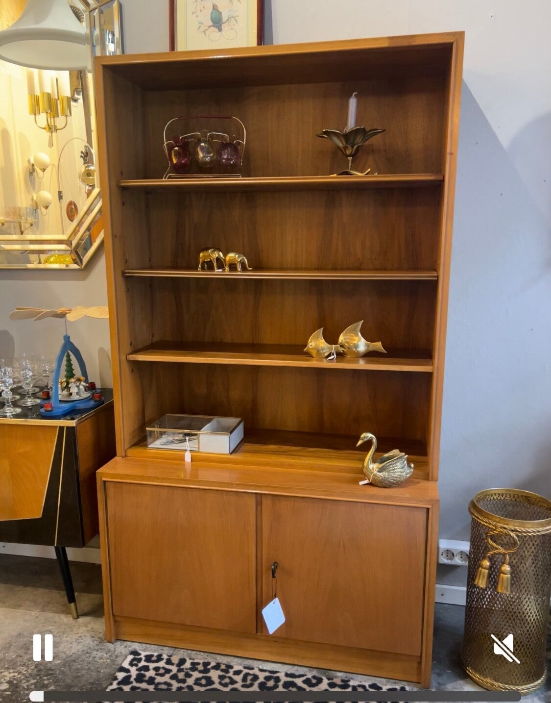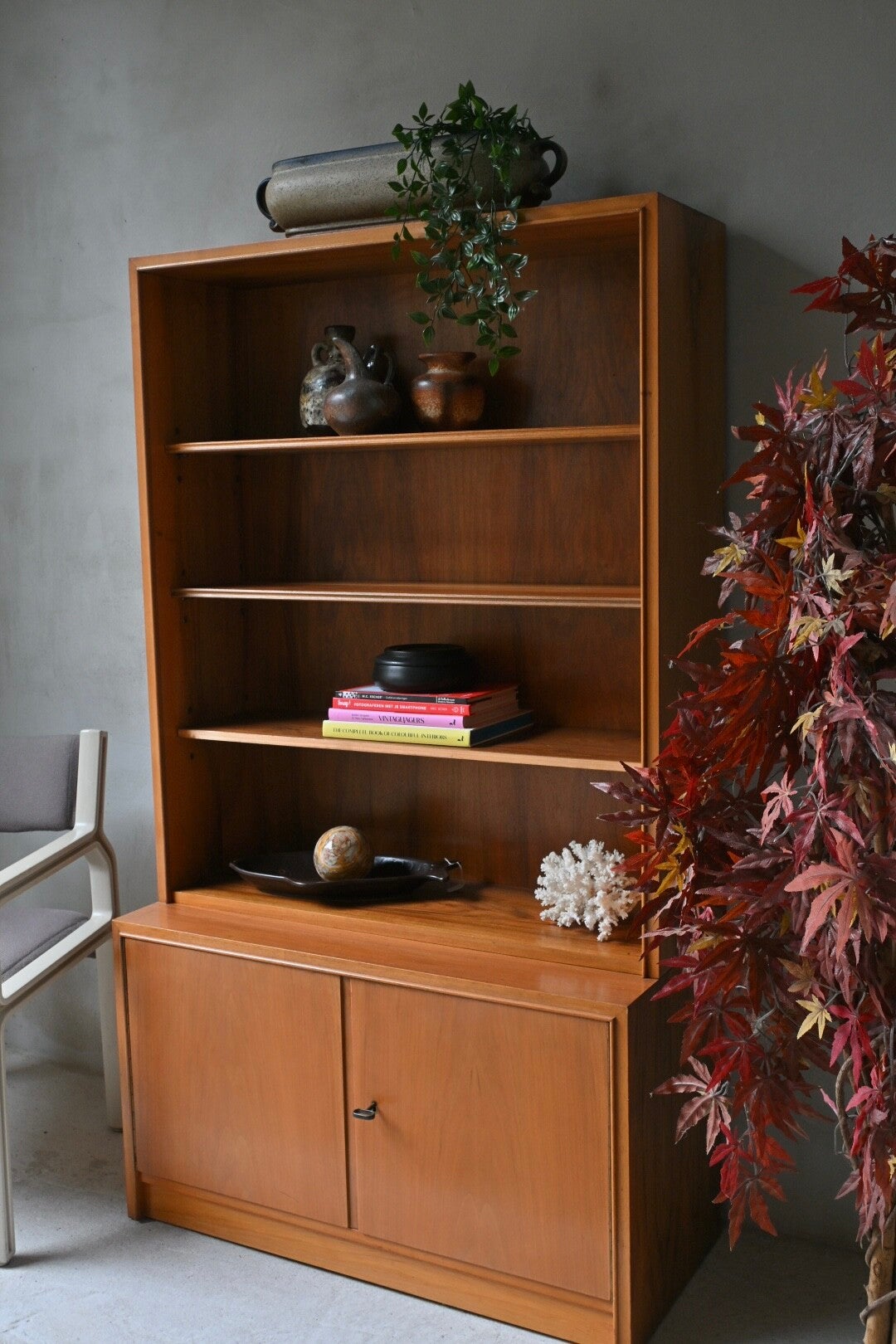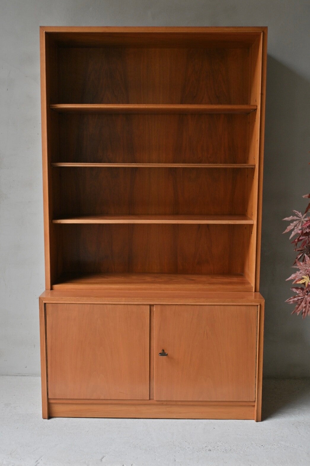 Een hele toffe kast met een echte mid-century uitstraling tevens biedt de kast veel opbergruimte. De onderkast is voorzien van 2 deuren met daarachter legplanken. De bovenkast heeft drie open legplanken.