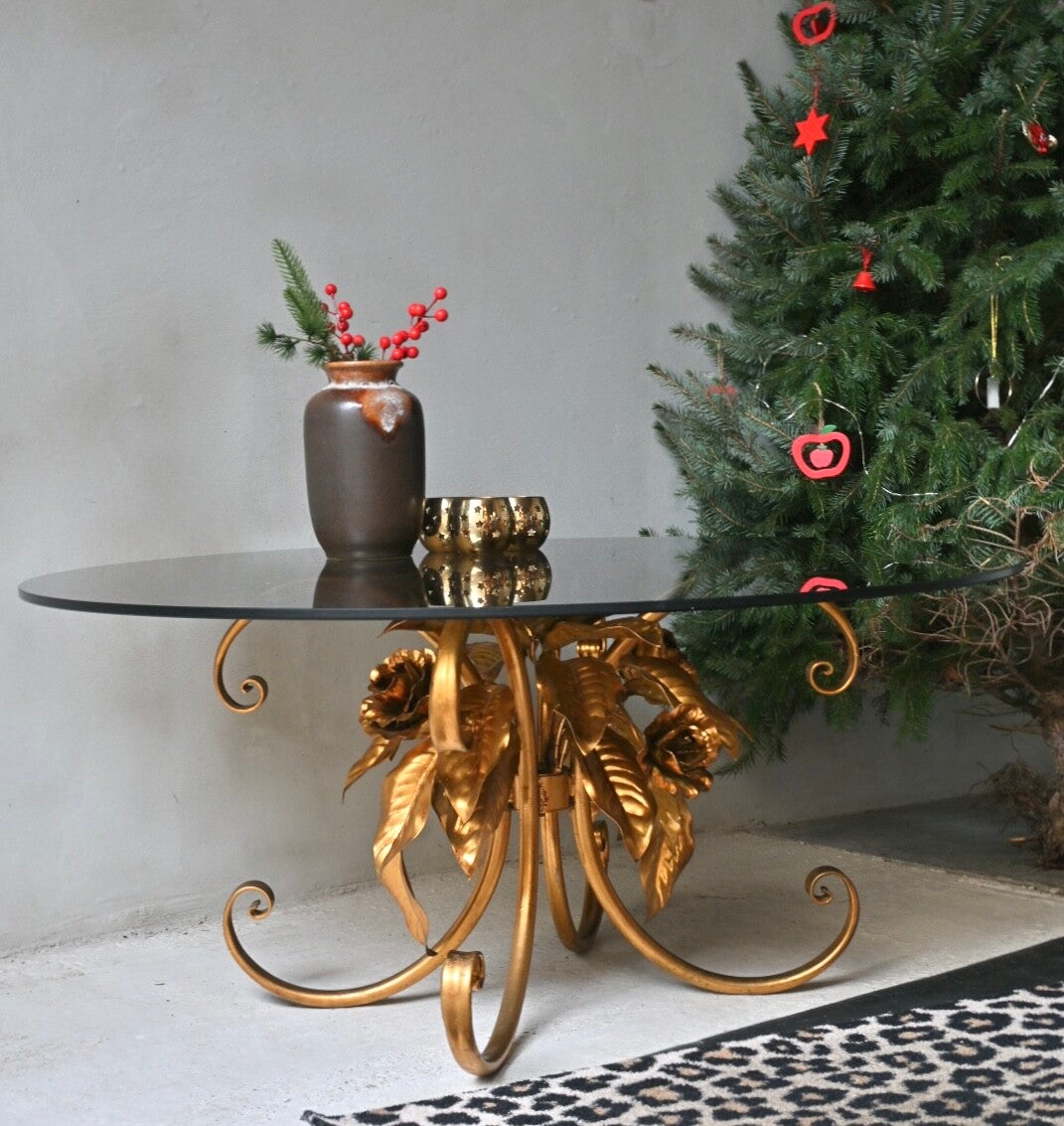 De combinatie van het warme goud met de strakke ronde rookglazen plaat geven deze bijzettafel een luxe uitstraling. Het onderstel heeft een prachtige vormgeving van een boeket rozen. Verkeert in een hele goede staat. De glazen plaat lijkt zelfs als nieuw