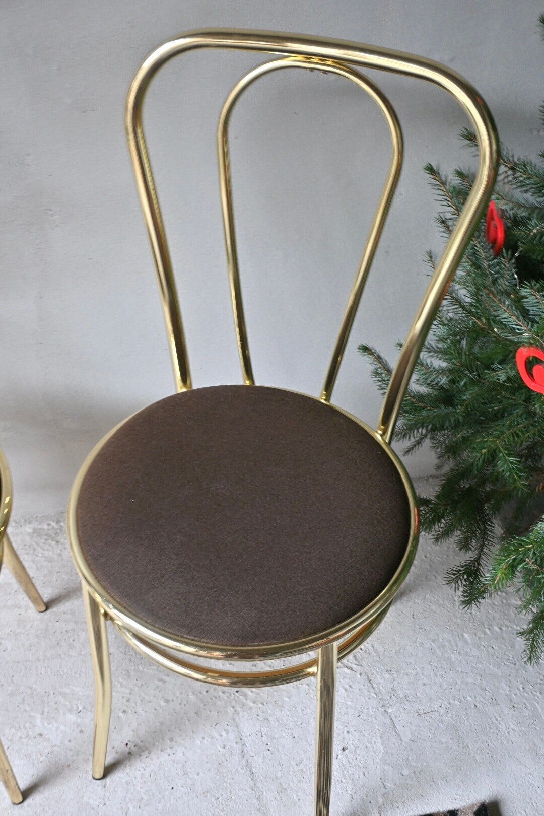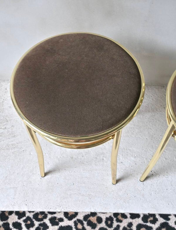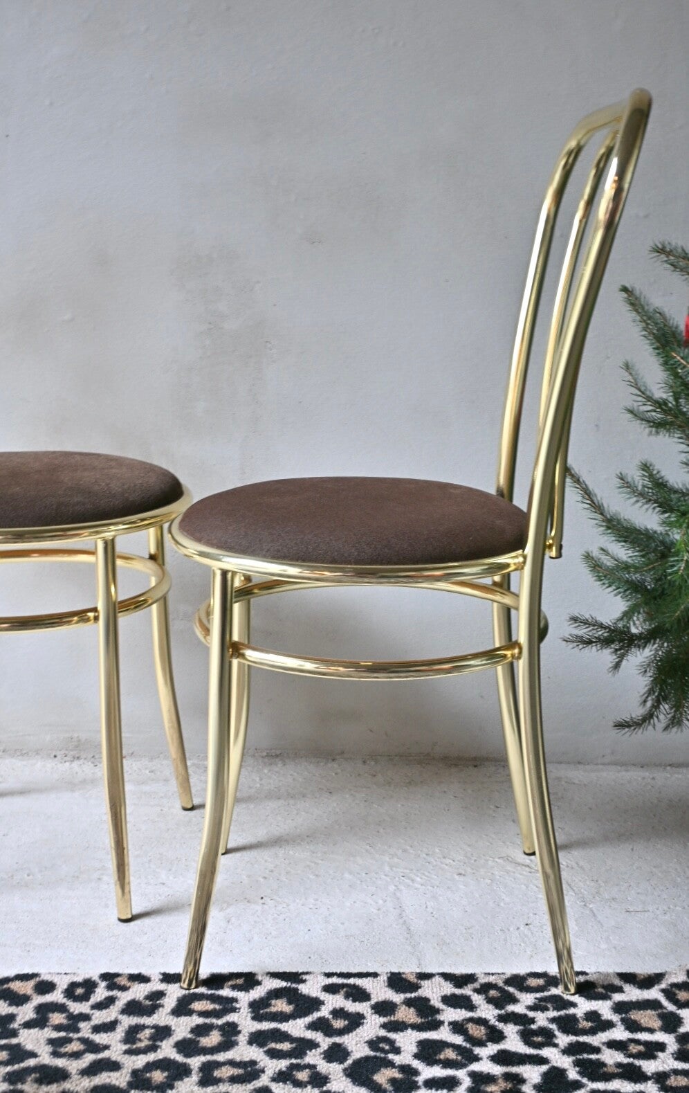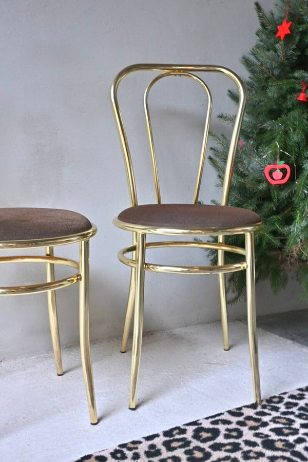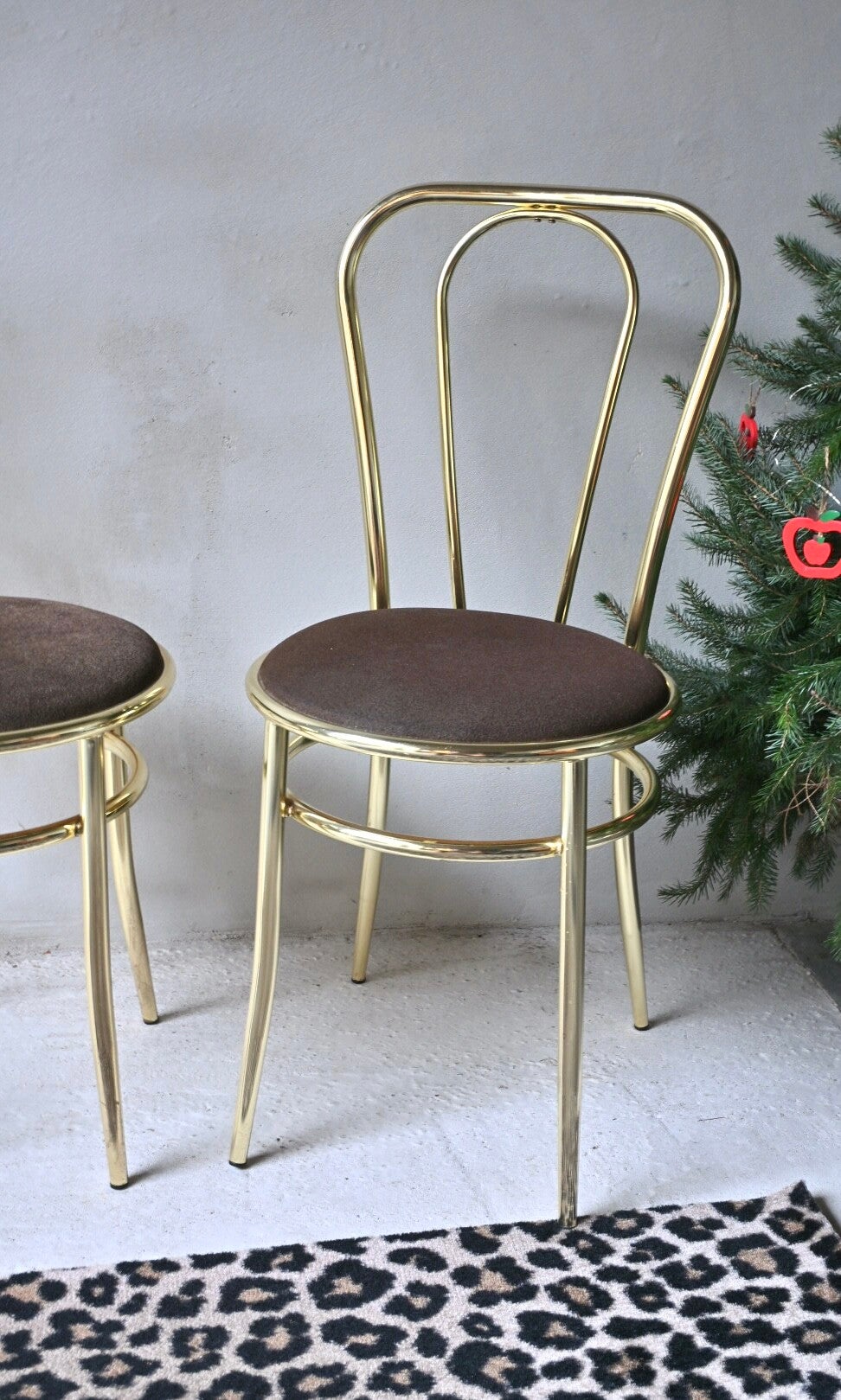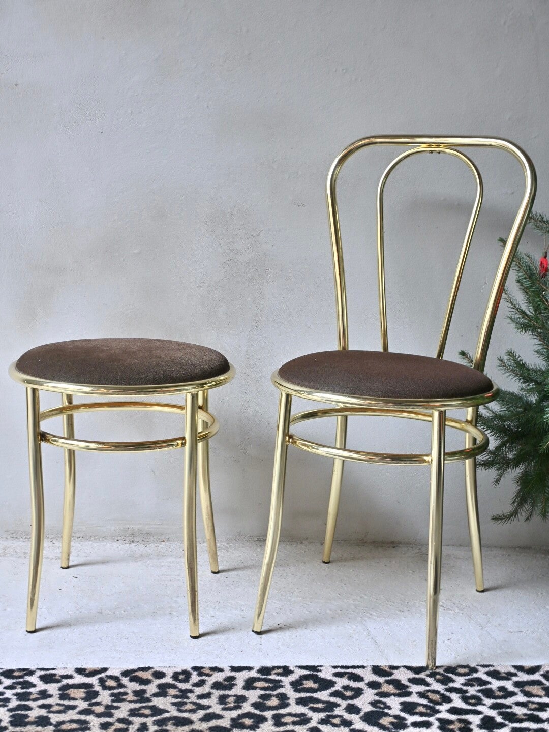 Mooie set Hollywood regency metalen goudkleurige stoel en bijpassende kruk met bruine bekleding.Verkeren beide nog in een mooie staat.Stoel:Dia:42cmHoogte:87Zithoogte:46 cm