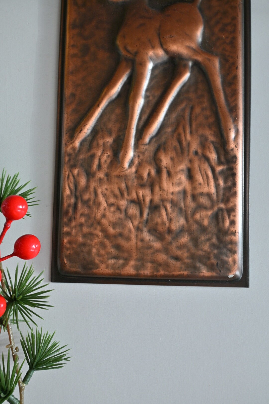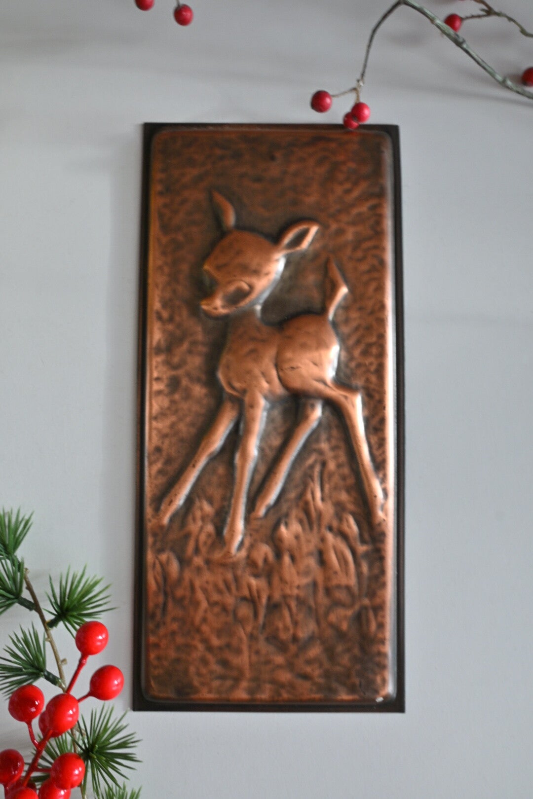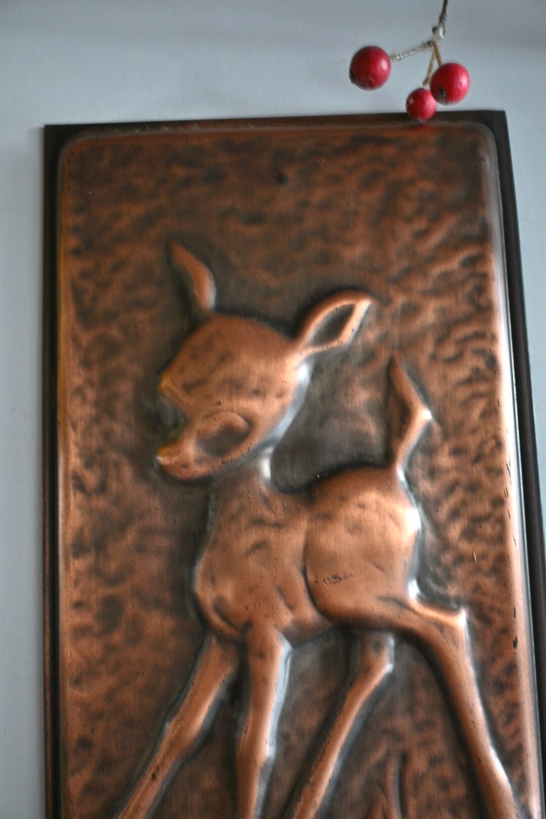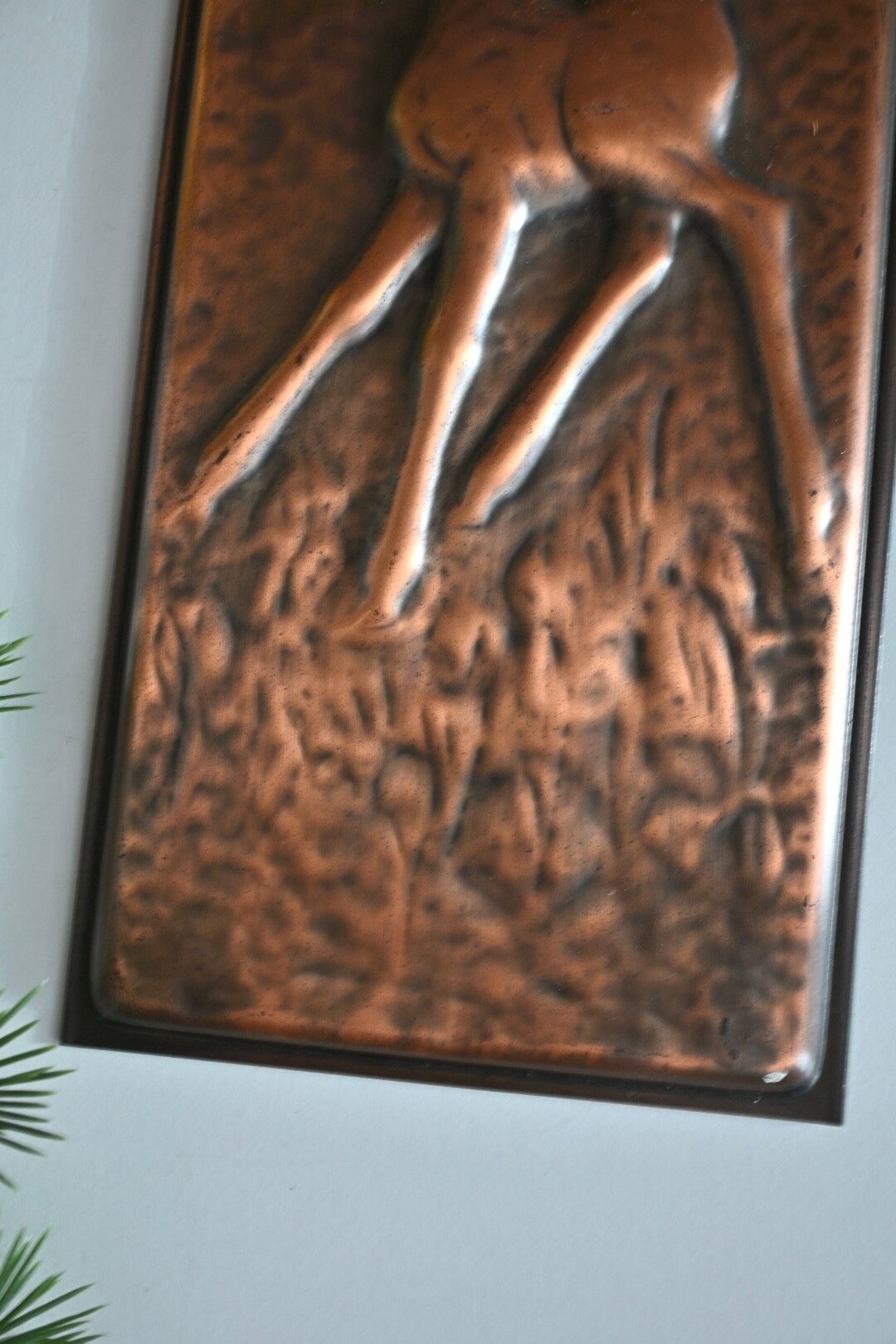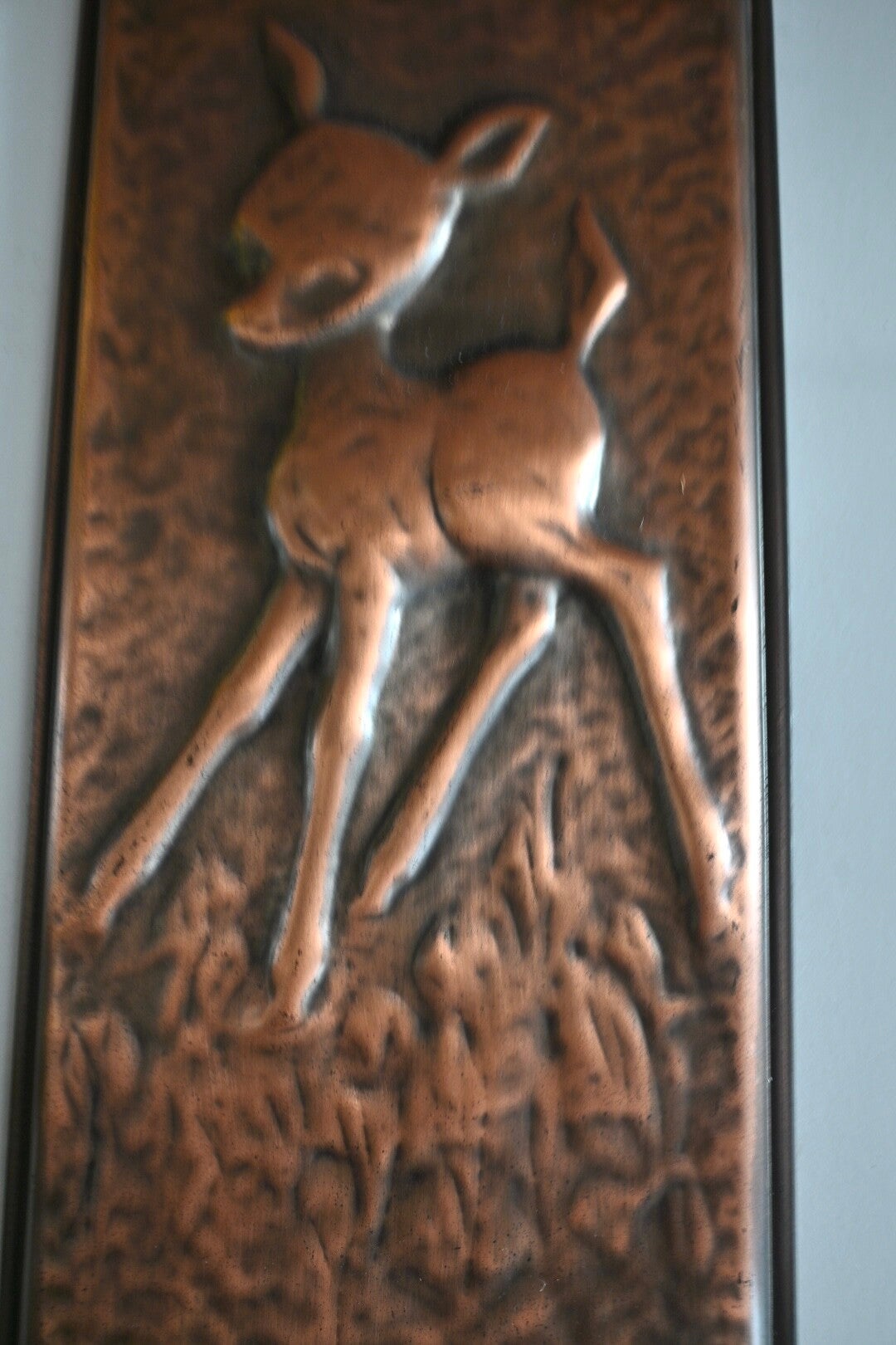Super leuke vintage wandplaat van koper met een reliëf van een jong hert/Bambi. Verkeert nog in een goede staat!