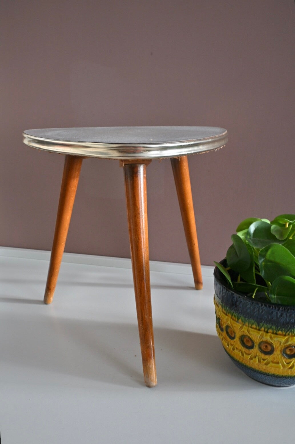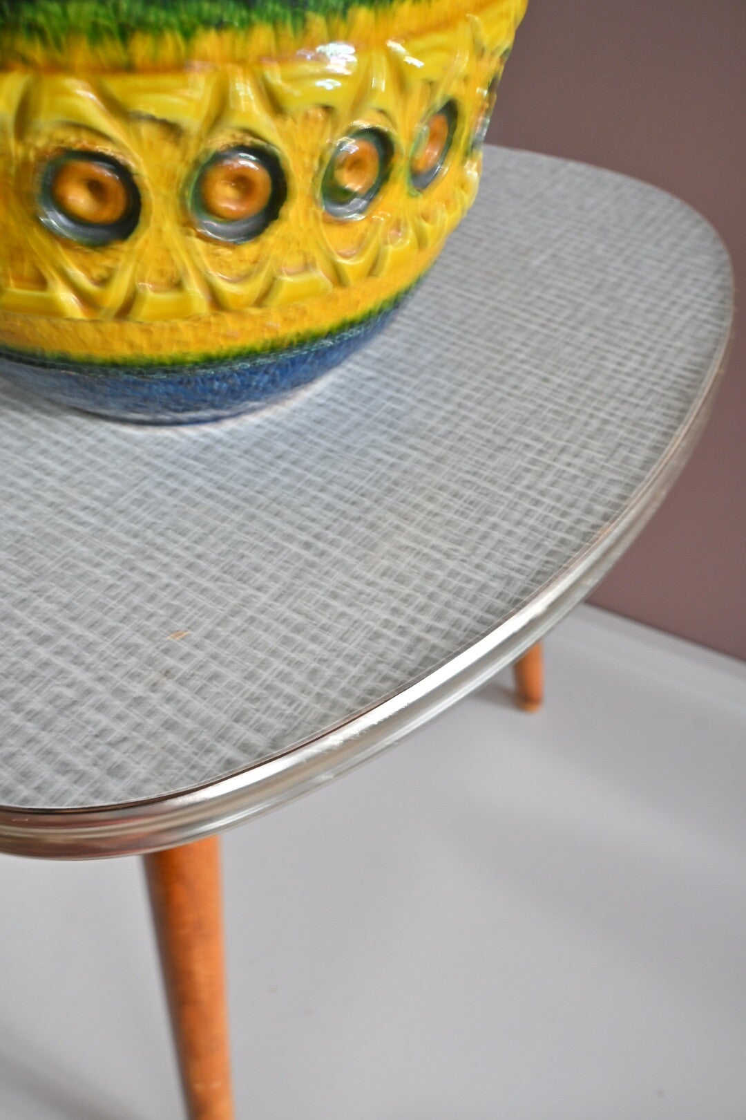 Mooi vintage plantentafeltje met formicablad, het tafeltje heeft een grijs/wit blad en een zilverkleurige trim. Verkeert nog in een goede staat.