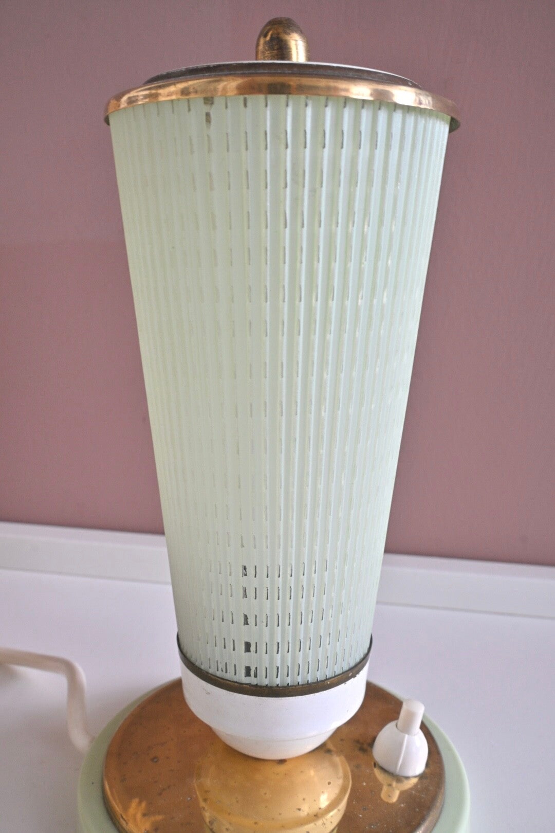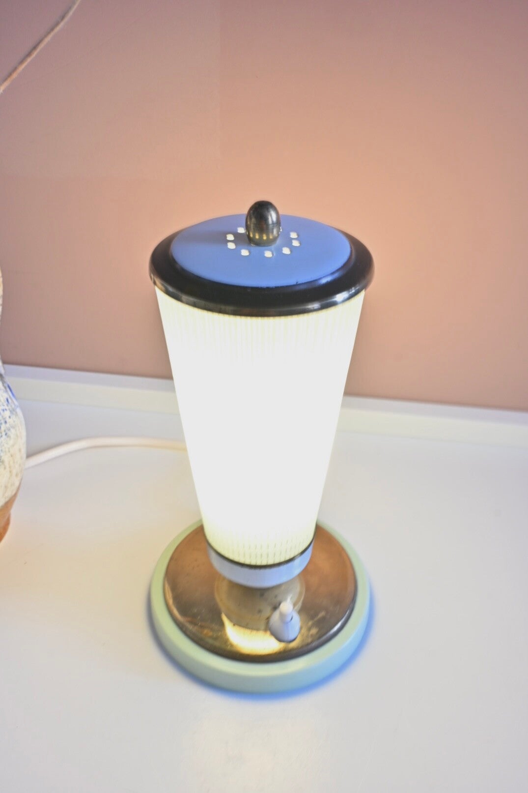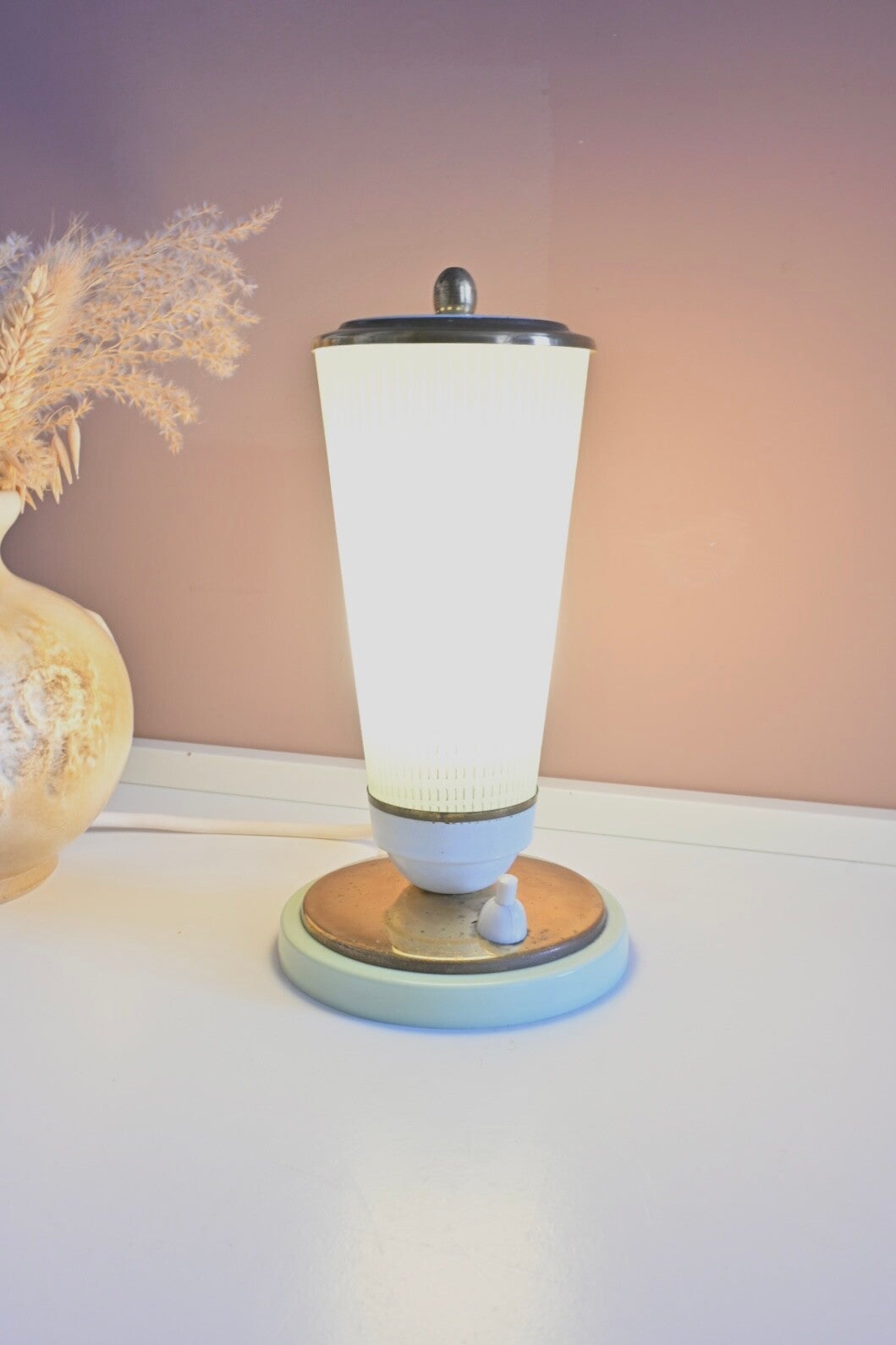 Bijzondere glazen tafellamp uit de jaren 60, afkomstig uit west Duitsland, stijl Bauhaus.De lamp gaat aan en uit d.m.v het schakelaartje op de lamp. De lamp verkeert nog in een goede werkende staat.H:21,5cm Dia voet:11cm Dia lamp: 8cm