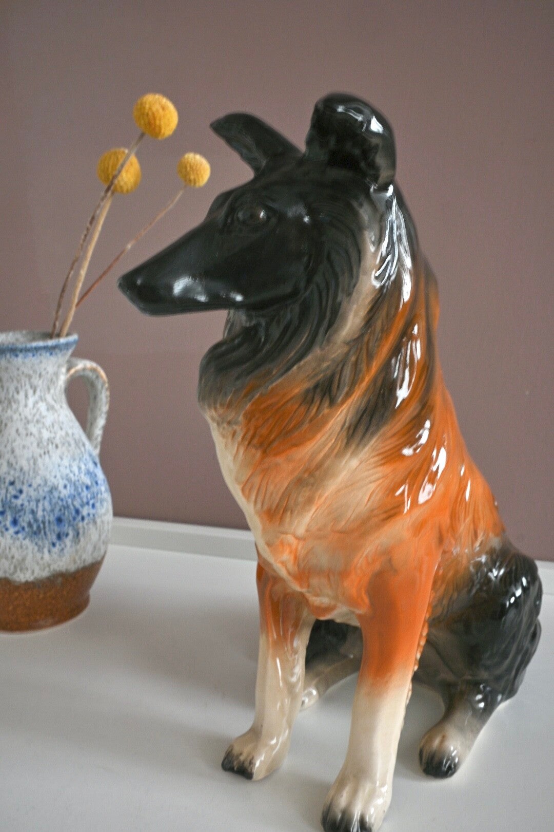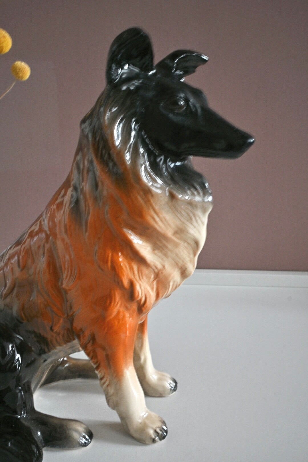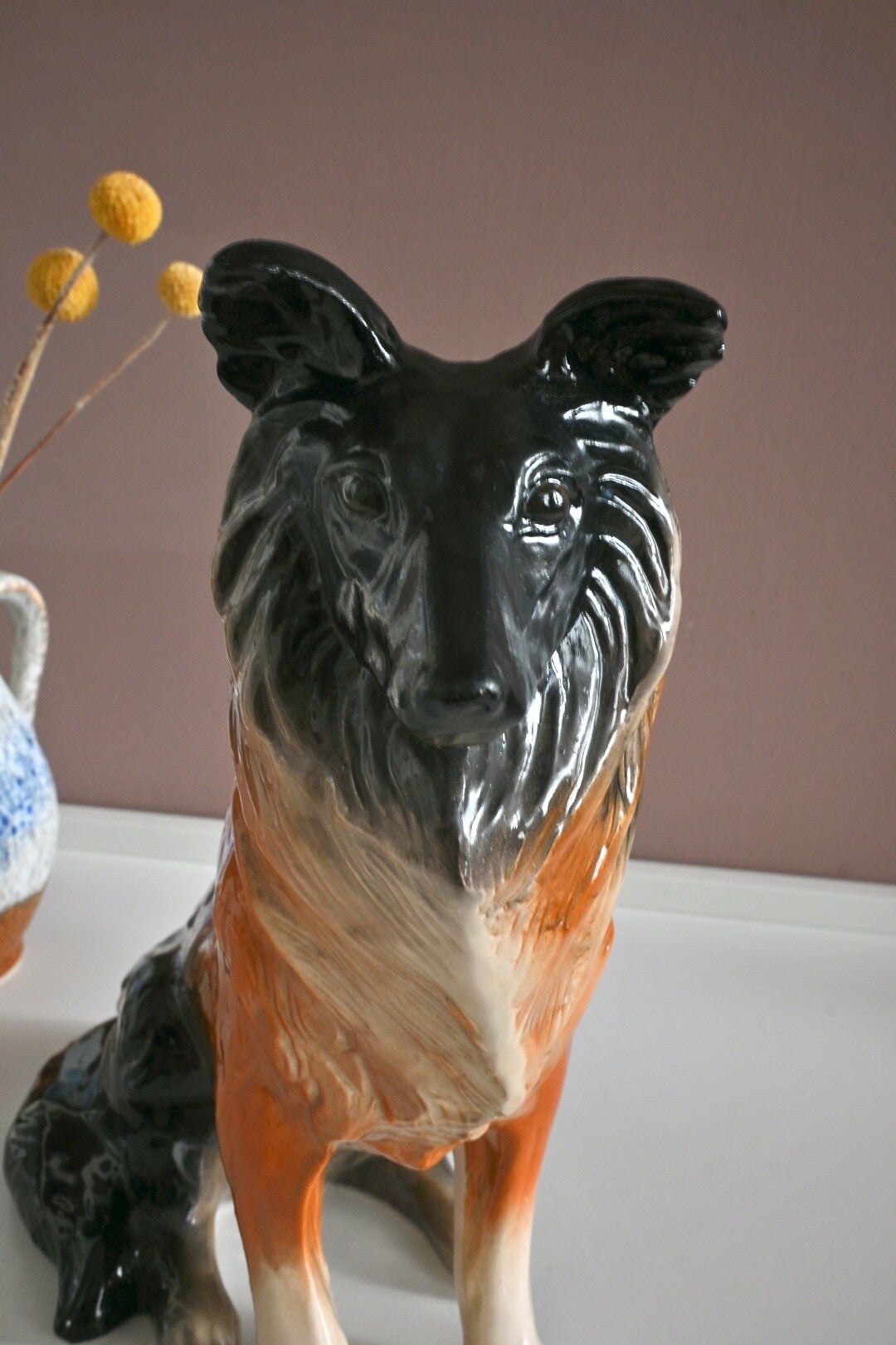 Decoratief Jema Holland beeld van een Collie, het beeld is gemaakt van hoogwaardig keramiek met verfijnde details. Mooi geglazuurd in zwart, oranje/bruin en wit.Verkeert nog in een goede staat, geen chips o.i.d.
