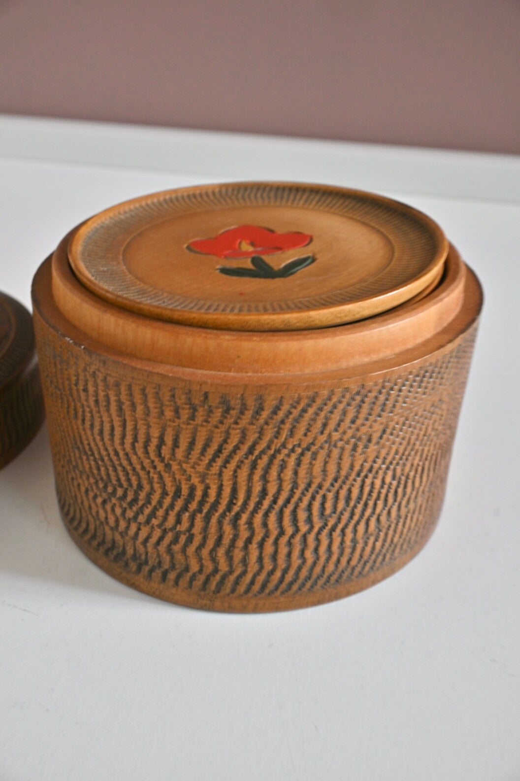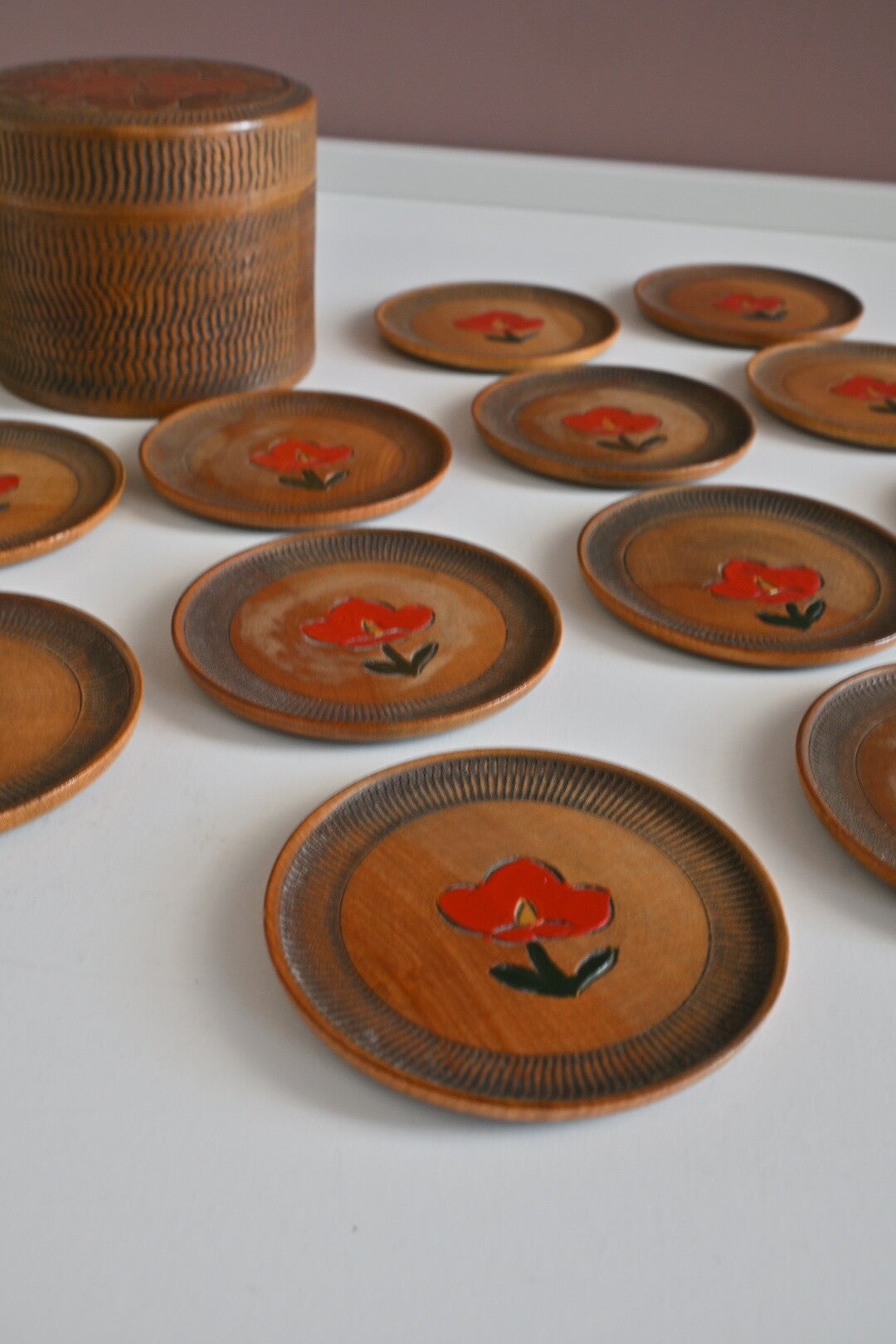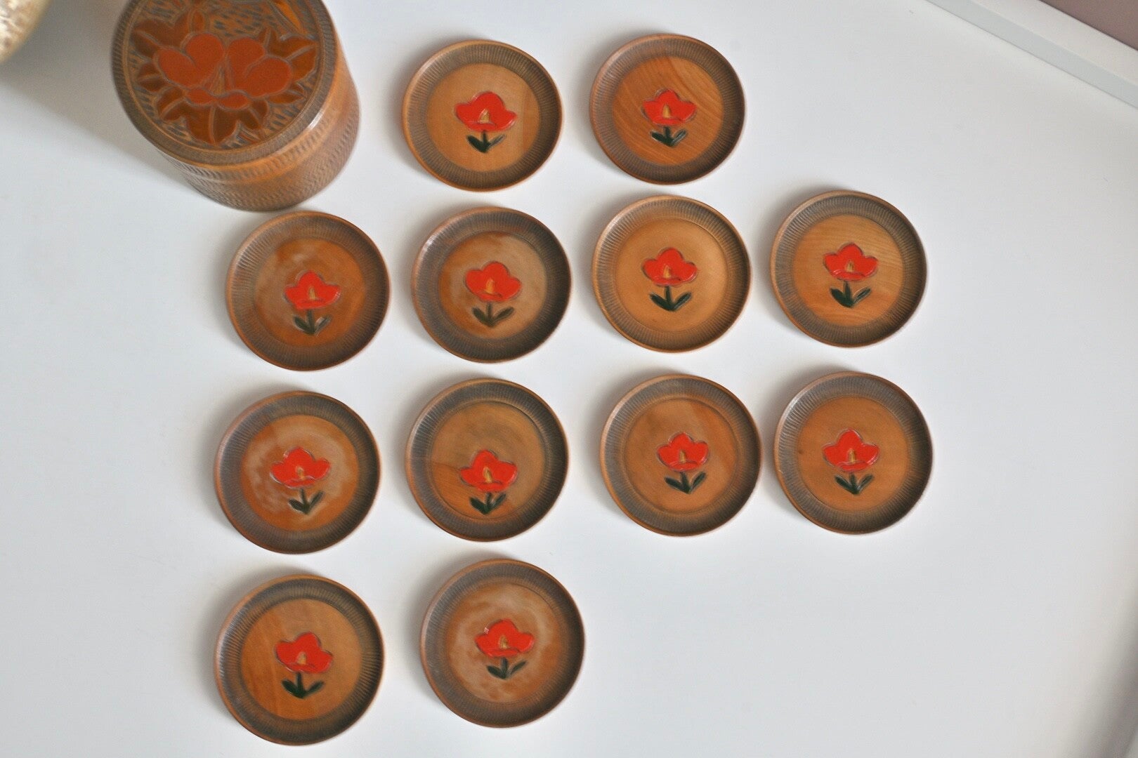 Amsterdamse school stijl 12 onderzetters in dekseldoos. De onderzetters zijn gemaakt van thermisch behandeld hout. De onderzetters en het deksel van de doos zijn voorzien van een bloemmotief. Doos Dia: 9cm H:7cmOnderzetters Dia: 7,5cm