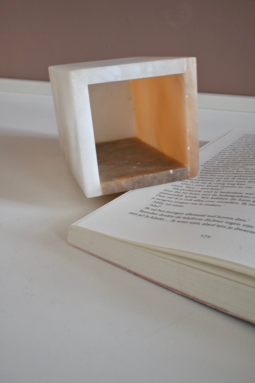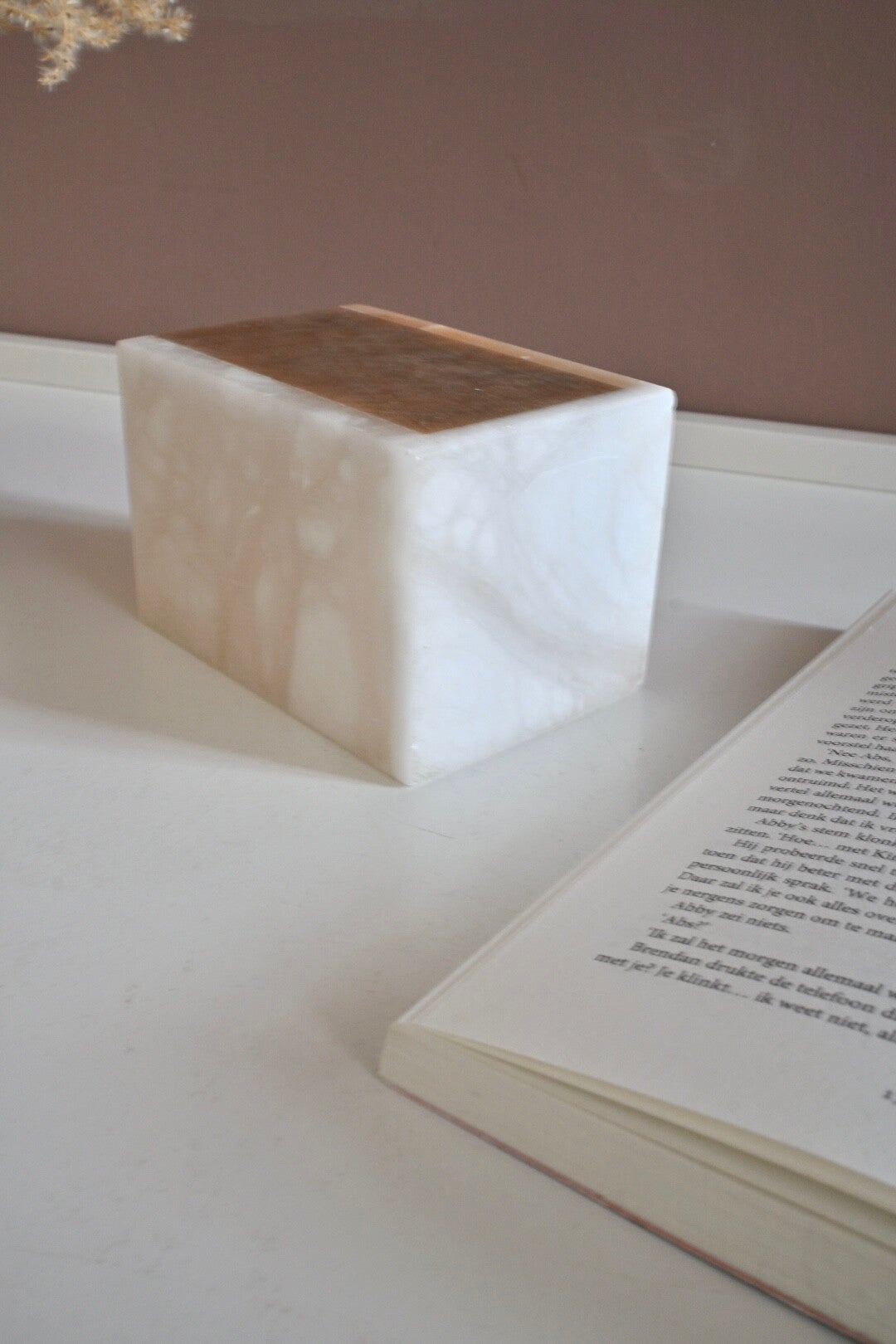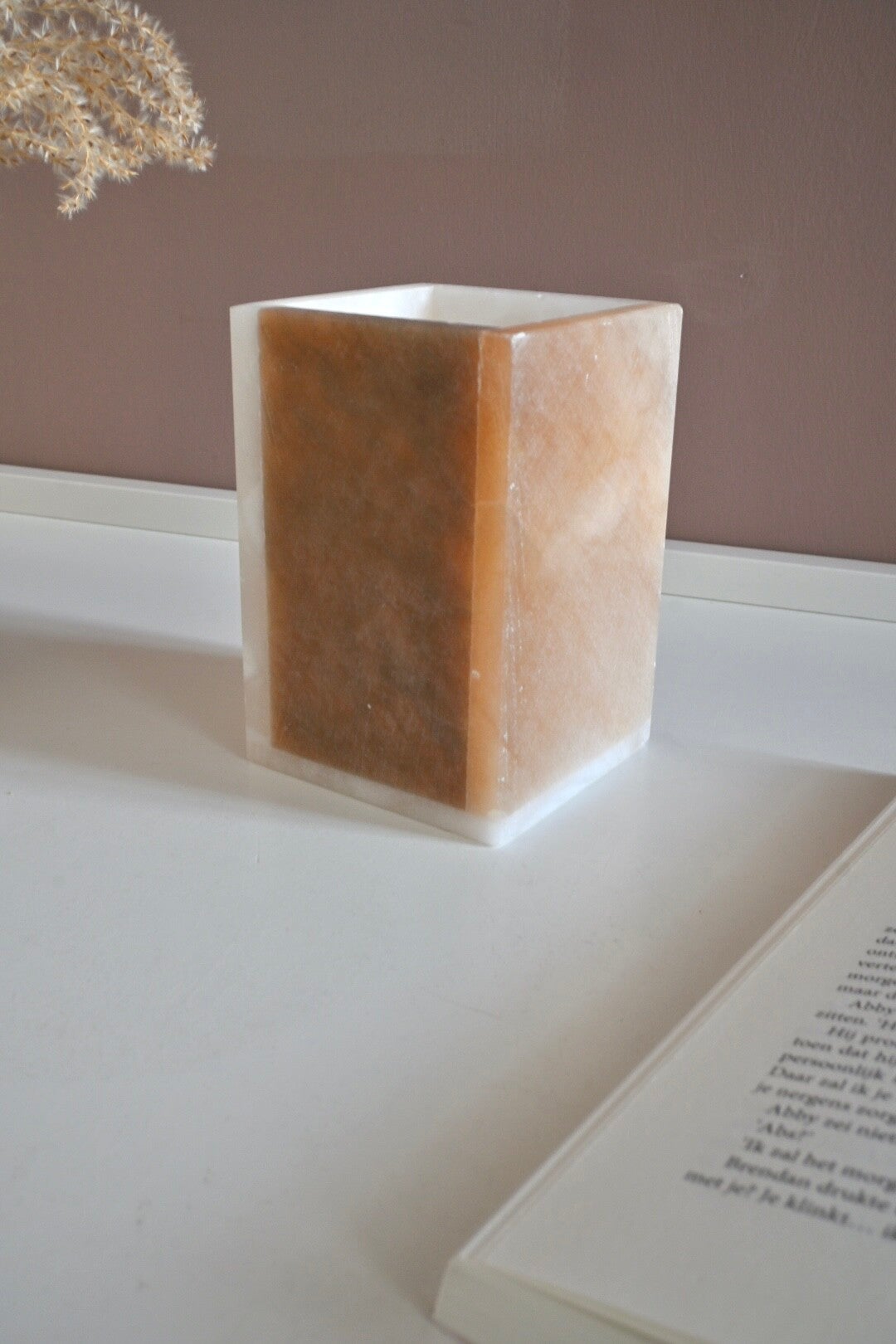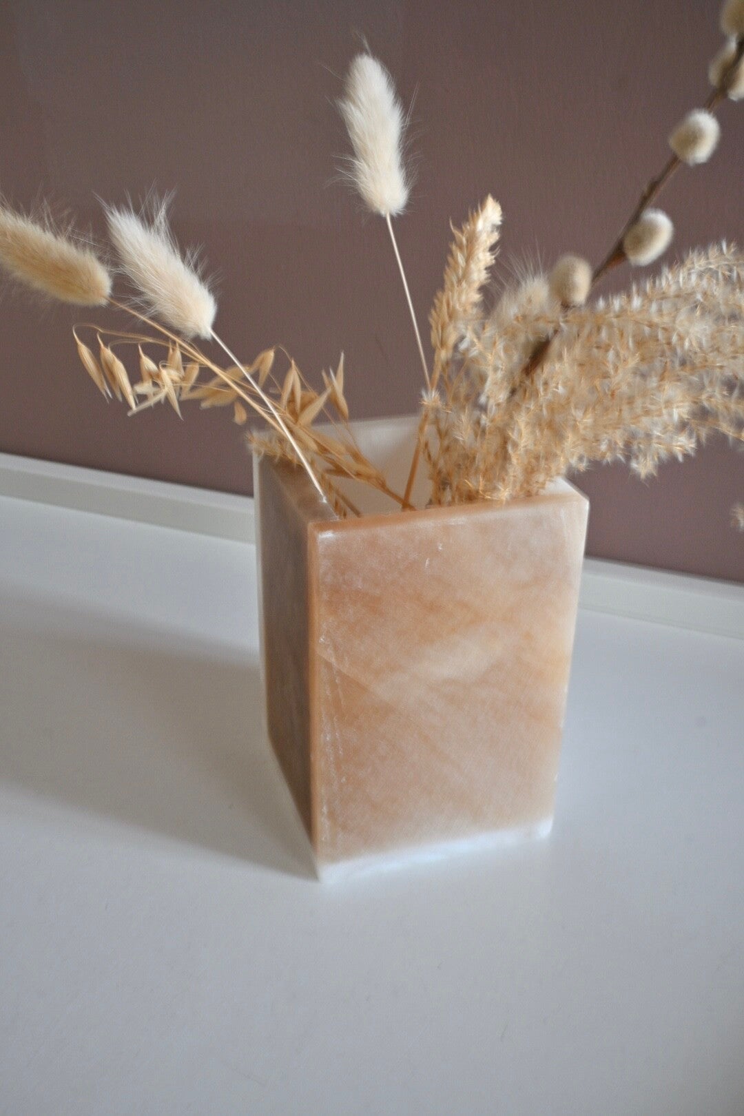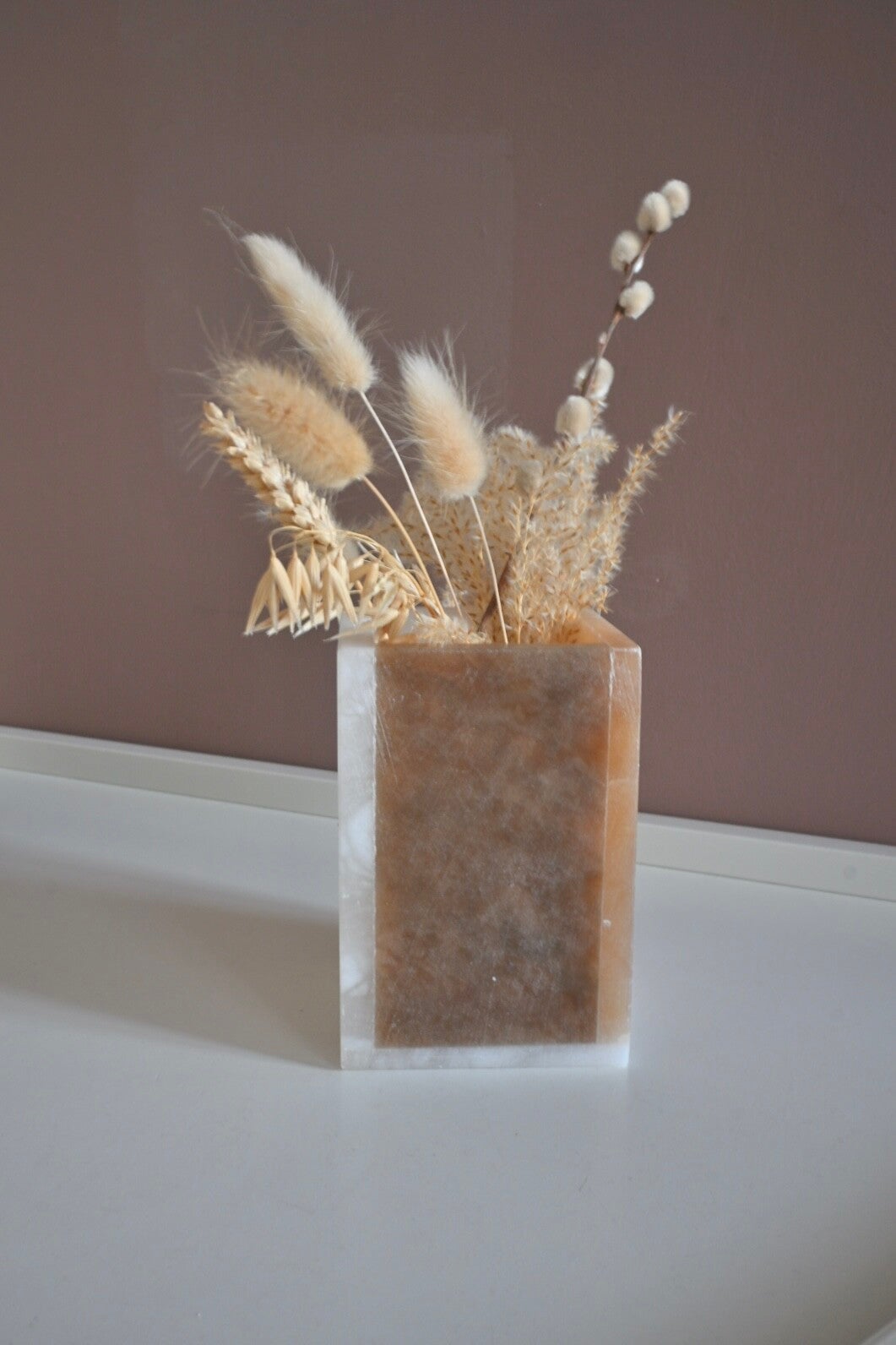 Bijzondere marmeren vaas in 3 kleuren, wit/lichtbruin/donkerbruin.Leuk bv met wat droogbloemen erin.Verkeert nog in een goede staat, paar kleine beschadigingen zie foto’s maar valt niet zo op.H:12cm Dia:8cm