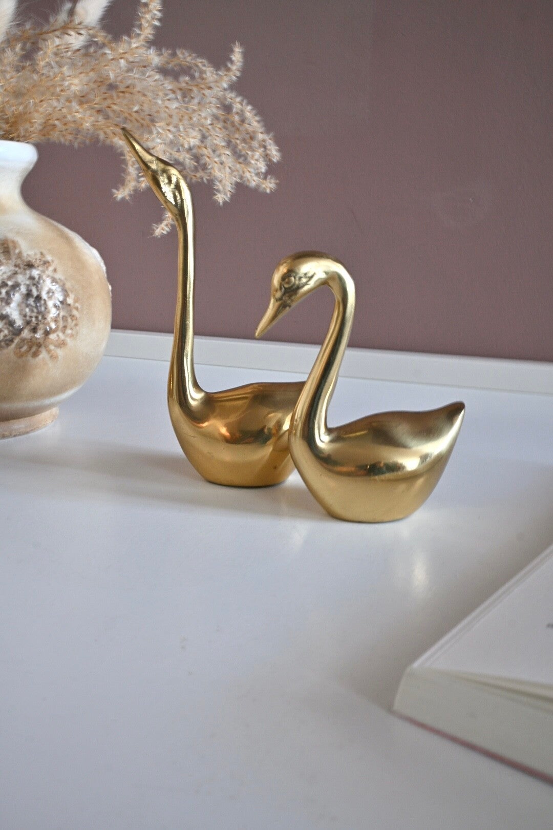 Mooie messing zwanen koppel. Zwanen staan voor eeuwige trouw. De zwanen verkeren nog in een mooie staat.Groot H:15 B:4 D:7,5Klein H:10 B:4 D:7