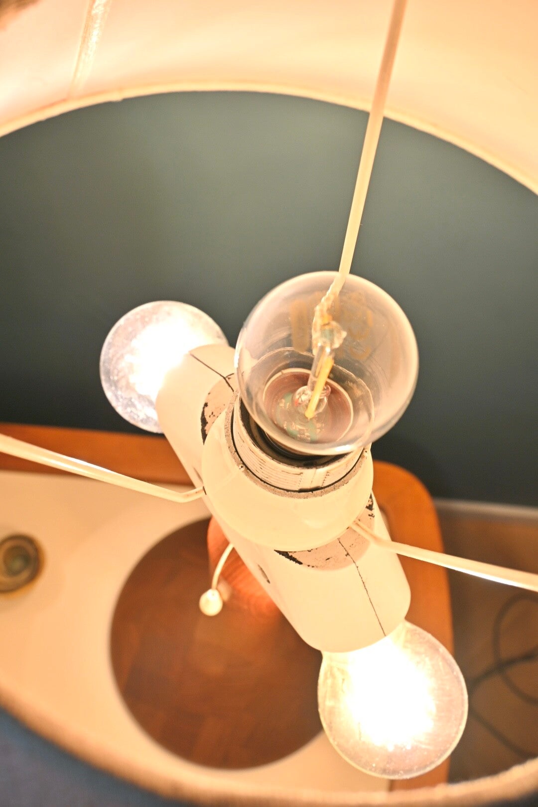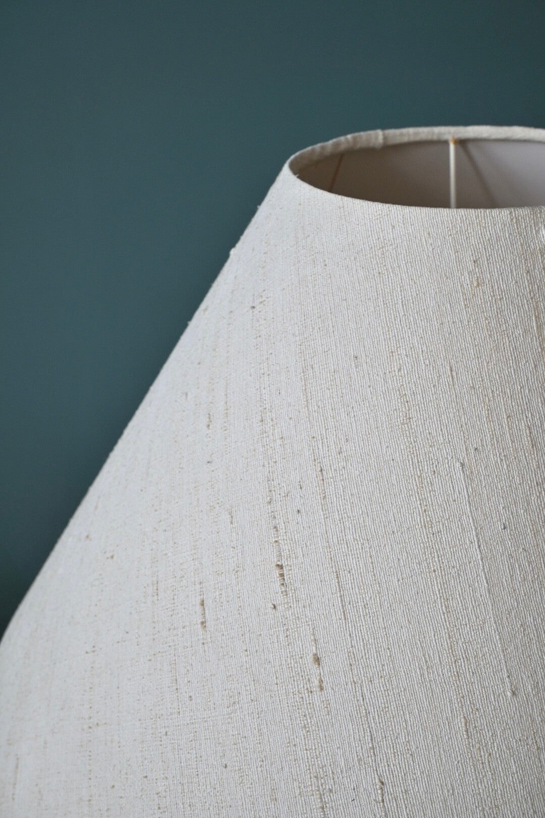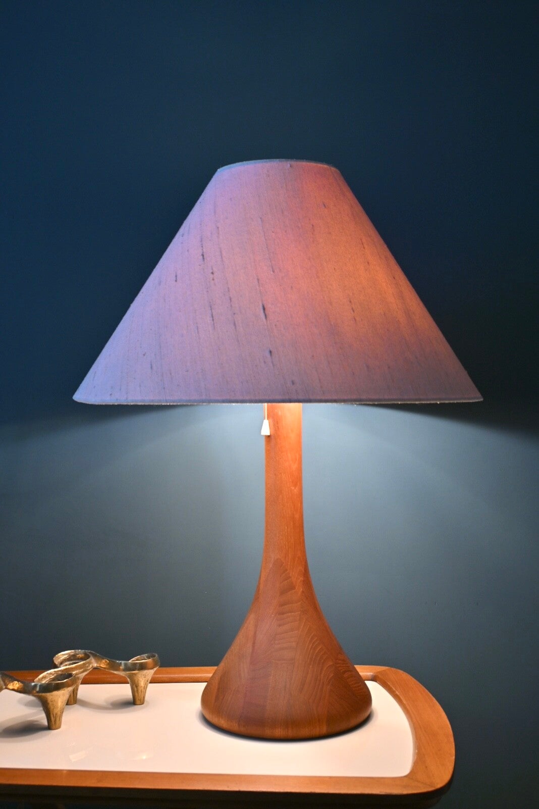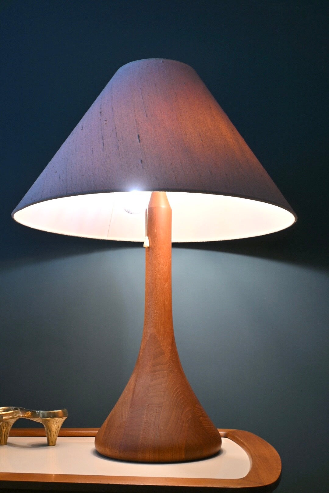 Deens design tafellamp ontworpen in de jaren zeventig. De lamp heeft een organisch gevormde massief teakhouten voet kenmerkend voor het Deens design. Er passen 3 gloeilampen in. De lamp wordt bediend met een trekschakelaar. Er zijn 3 lichtstanden mogelijk, afhankelijk van of je één, twee of drie keer aan de schakelaar trekt. De lamp is voorzien van een conische beige linnen kap welke nog in een hele mooie staat is, een klein scheurtje aan de binnenzijde van de kap maar dat zie je van de buitenzijde niet.