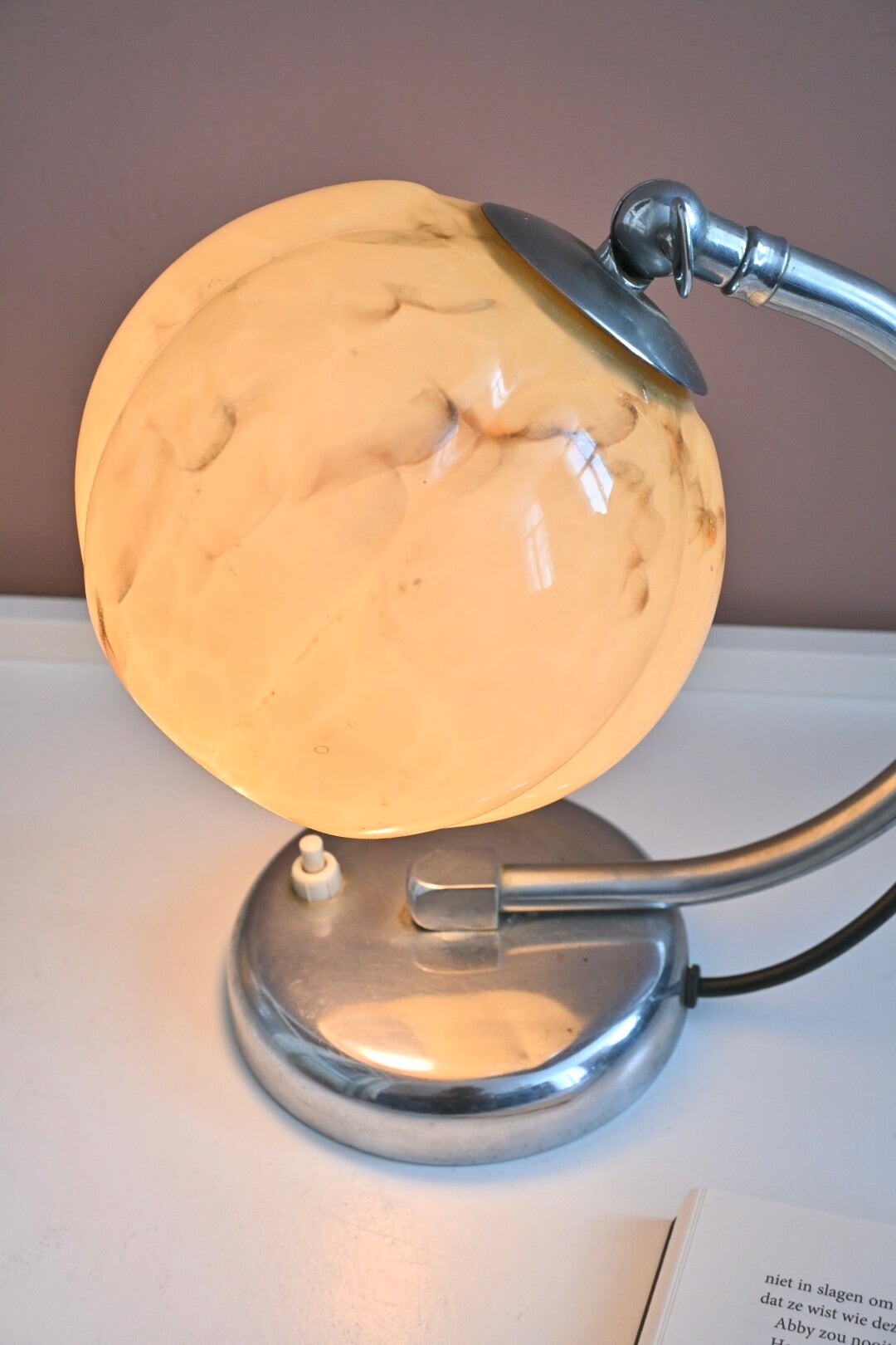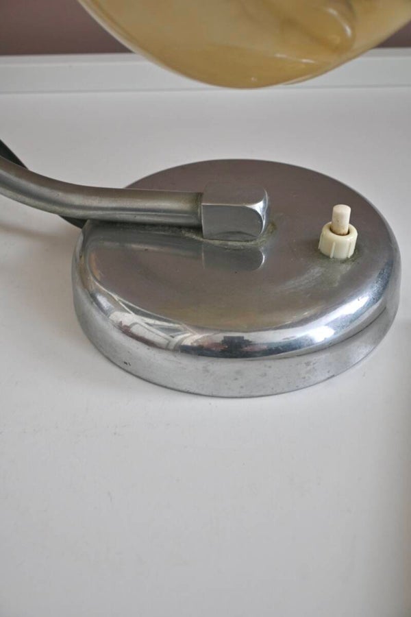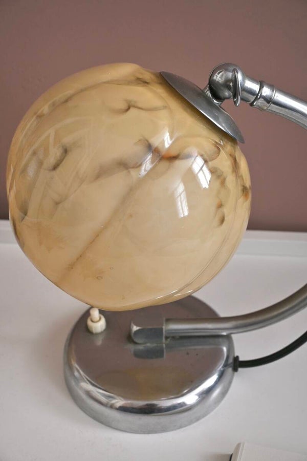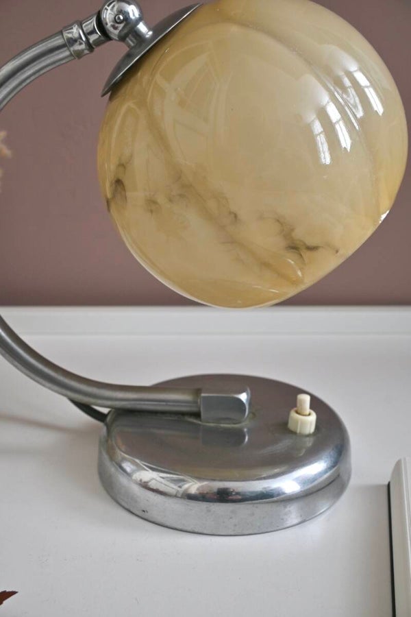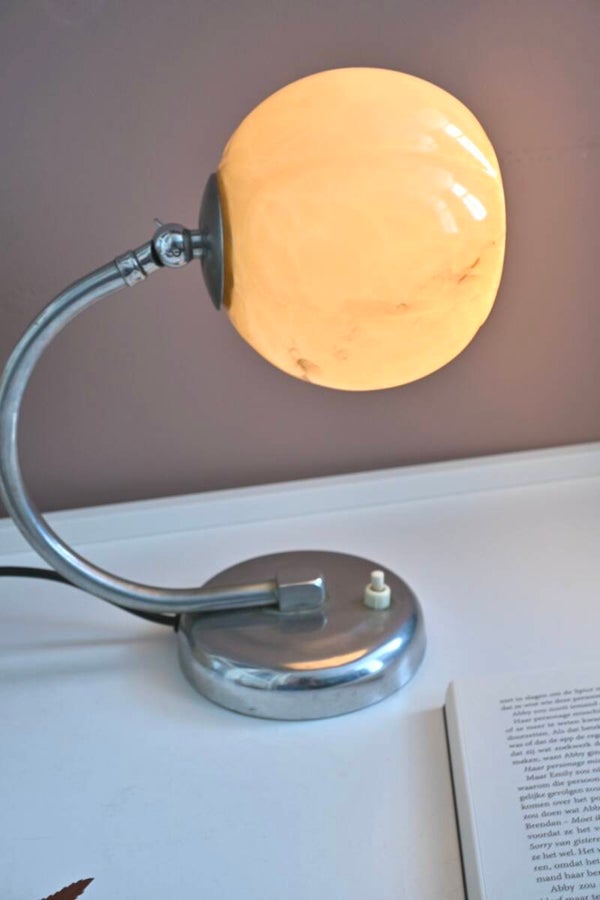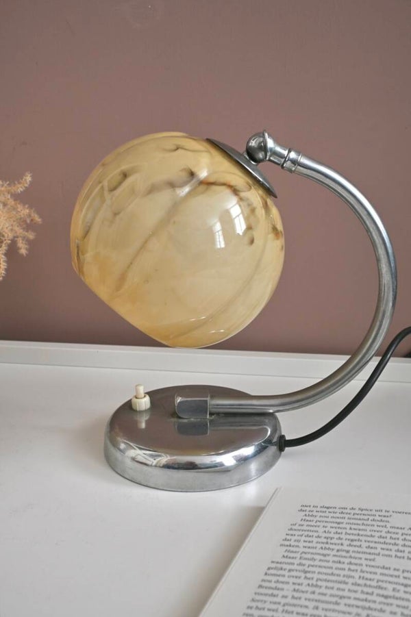 Mooie Art Deco tafellampje uit de jaren '20 of '30, met een gebogen chroomkleurige arm en een kap van gemarmerd glas.