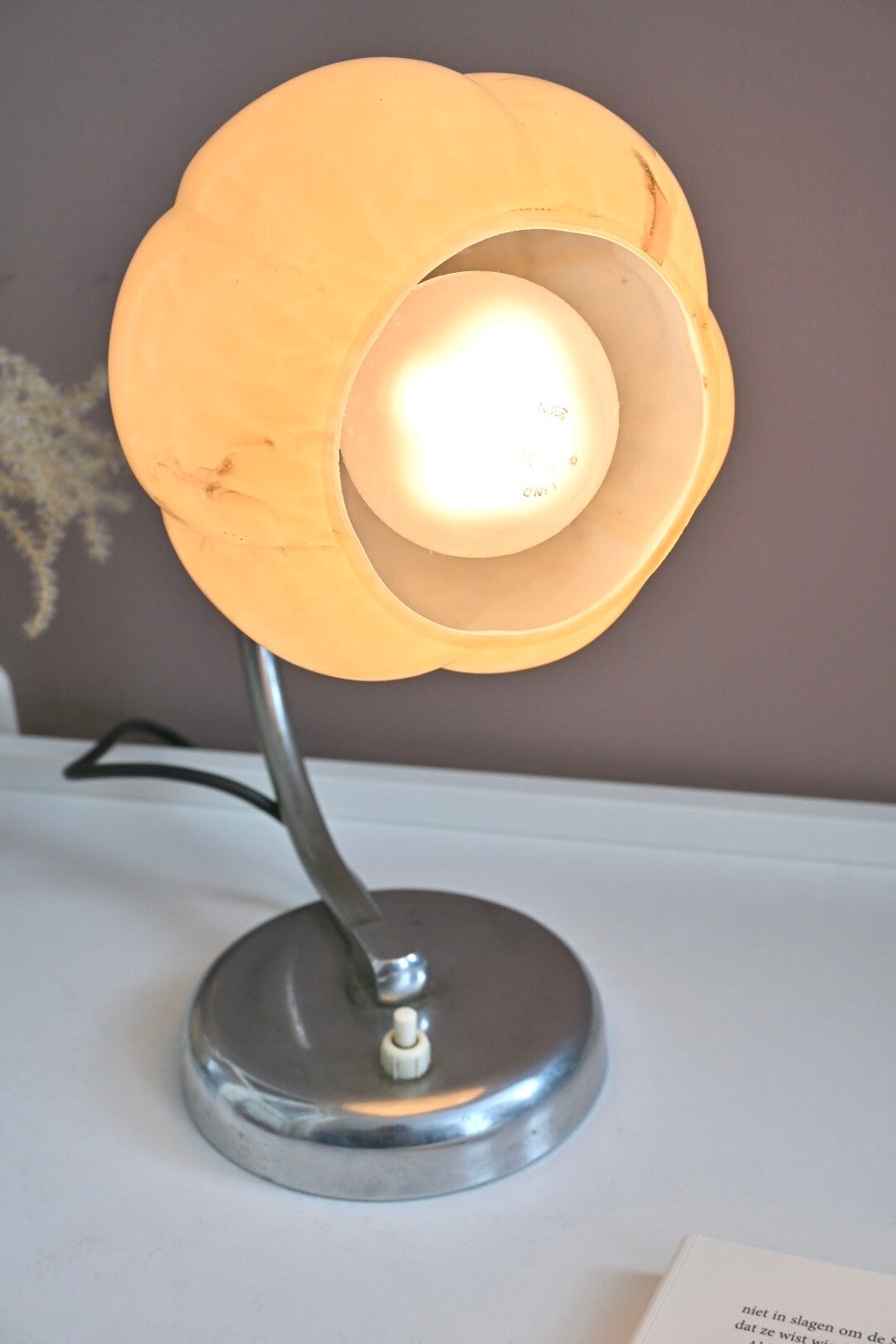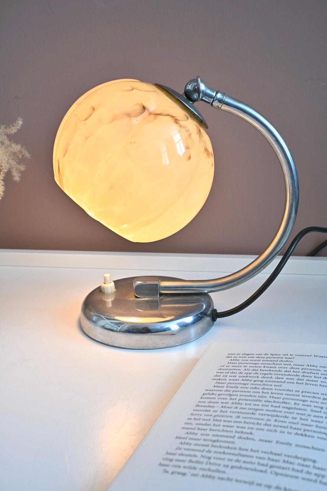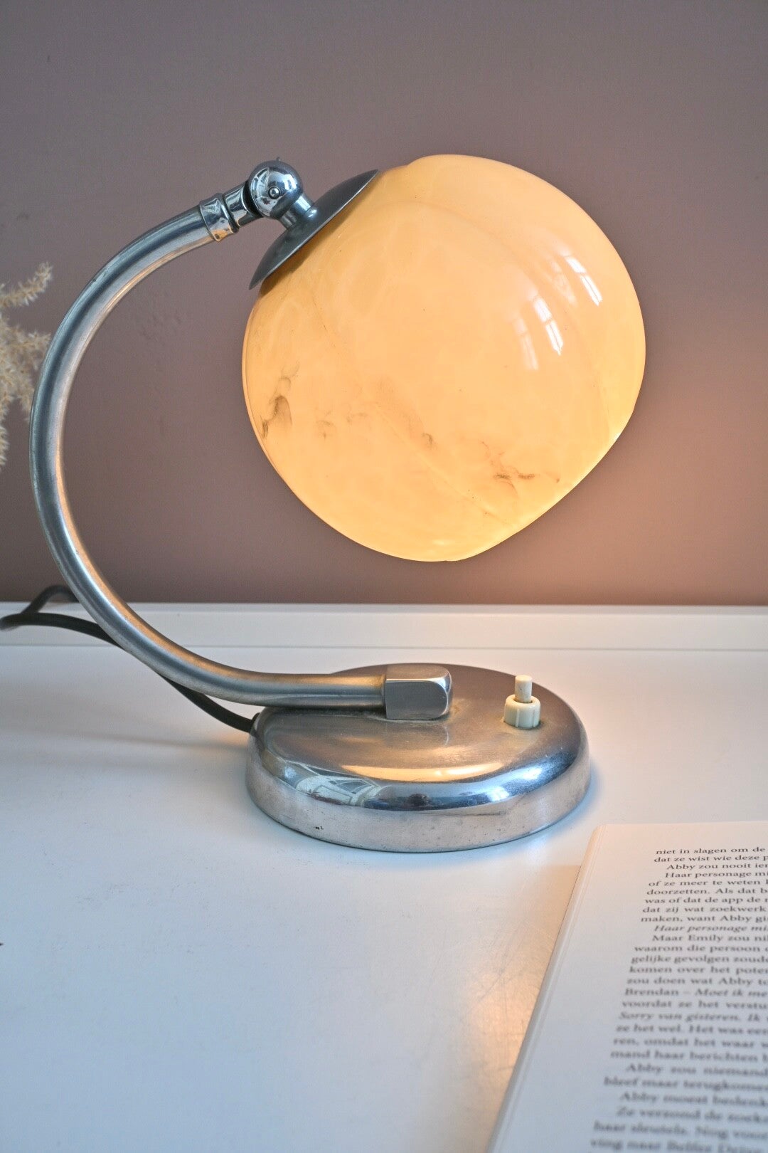 Mooie Art Deco tafellampje uit de jaren '20 of '30, met een gebogen chroomkleurige arm en een kap van gemarmerd glas.