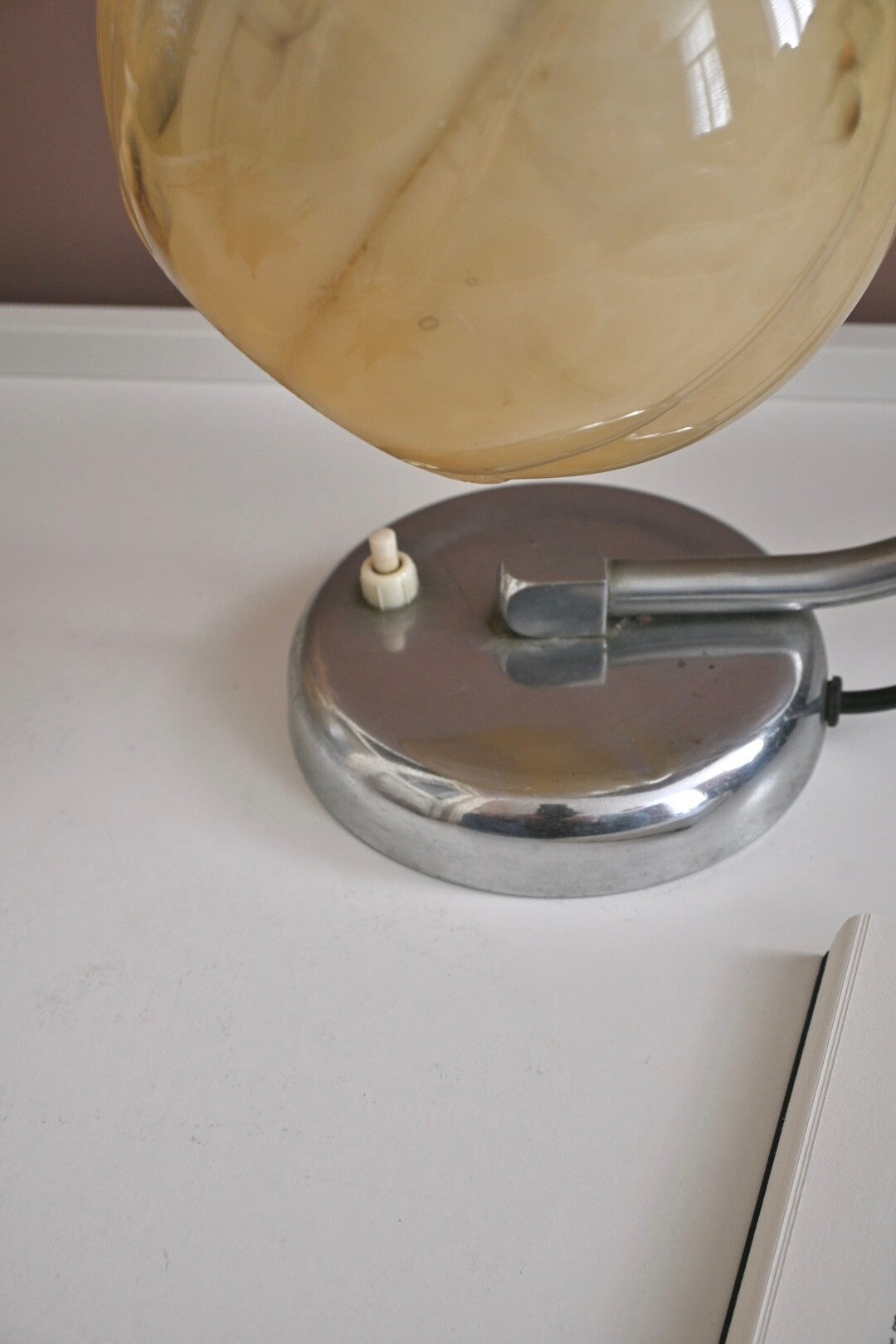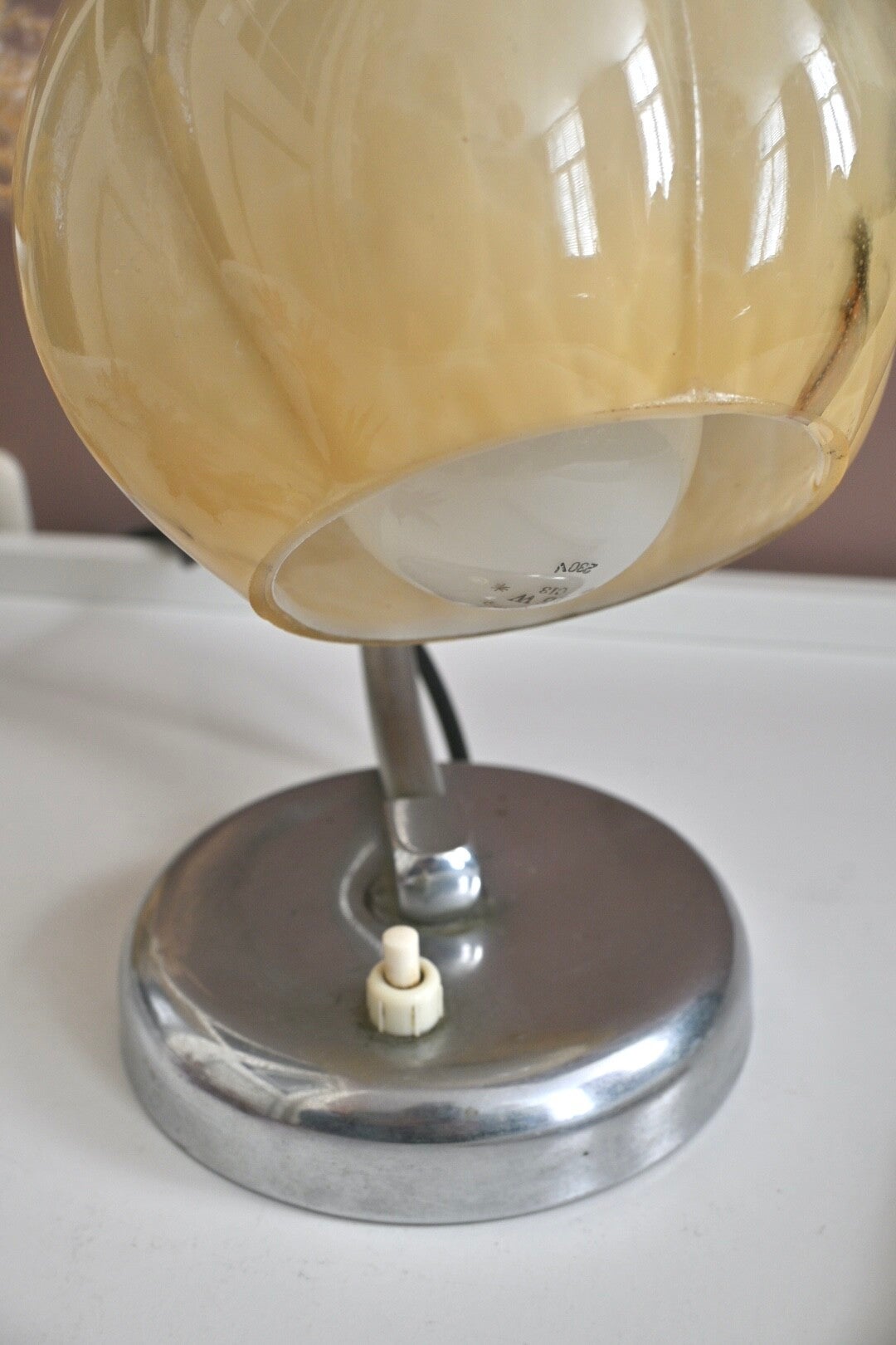 De lamp heeft een metalen voet en een bakelieten aan/uit-knopje.