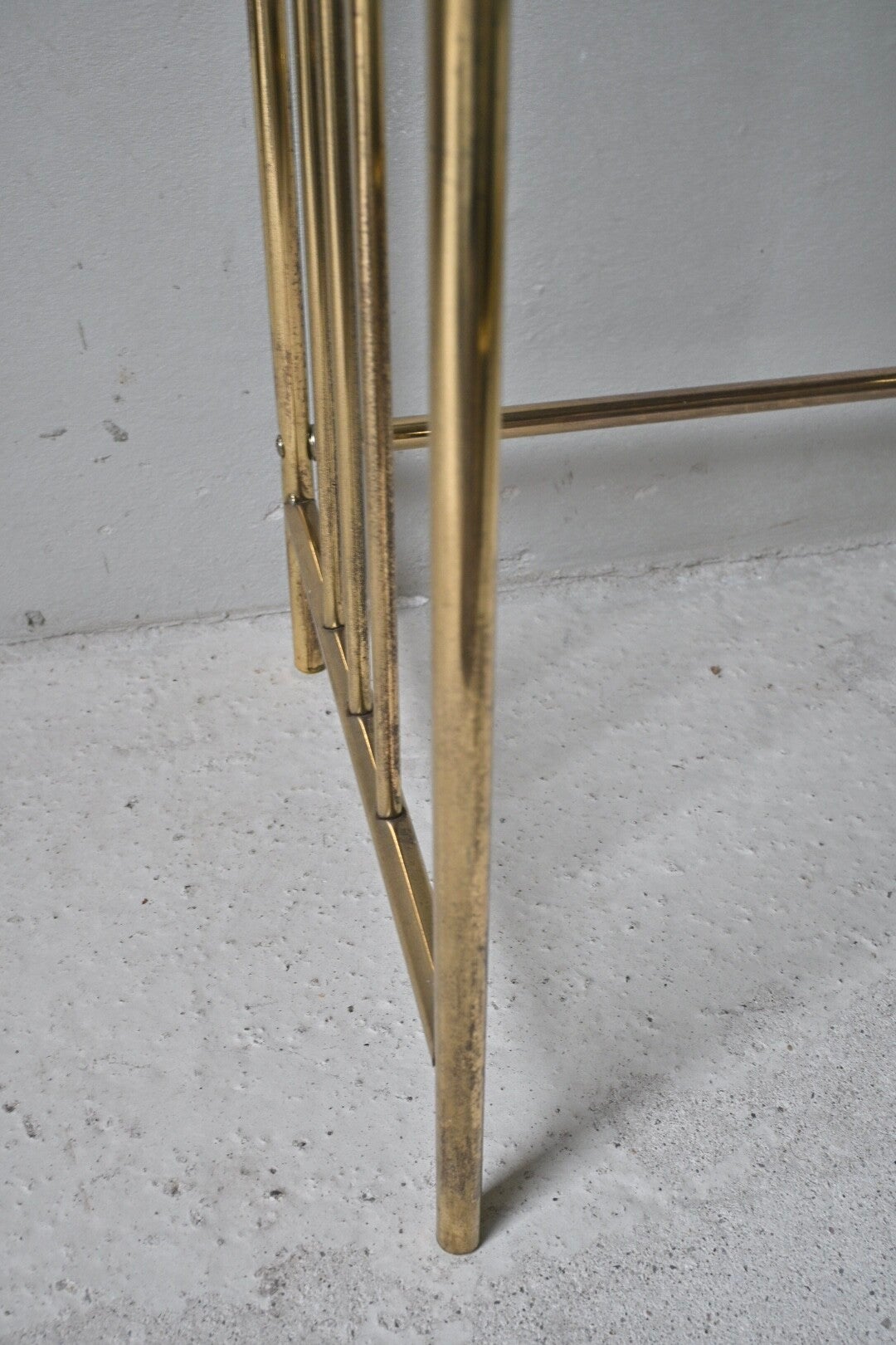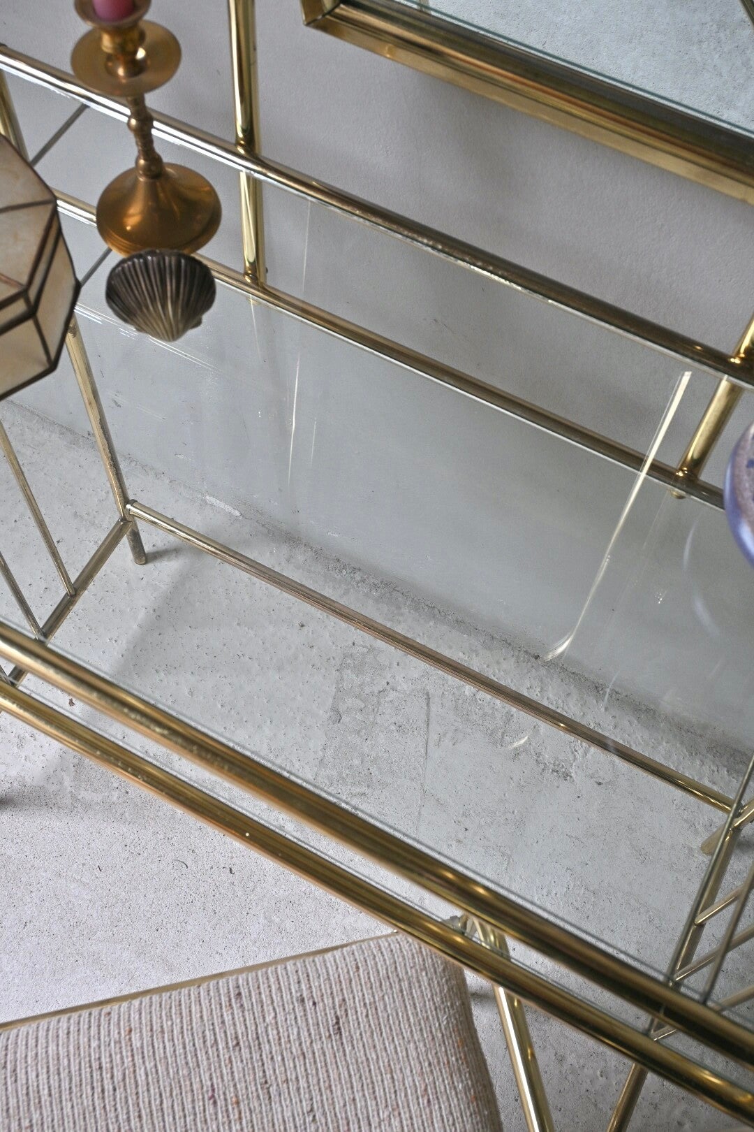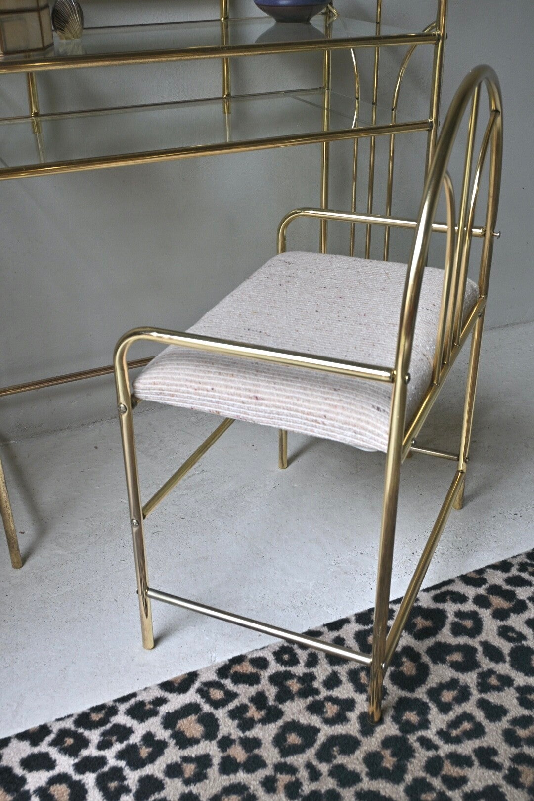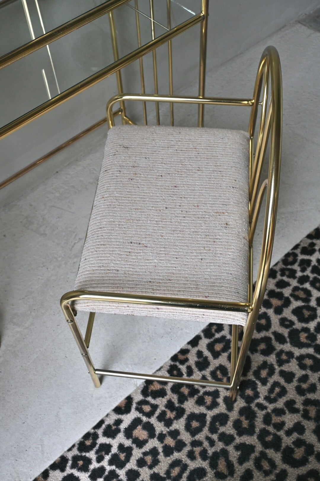 Bij de spiegel zit een bijbehorende messing stoel, bekleed met beige stof van grove structuur.