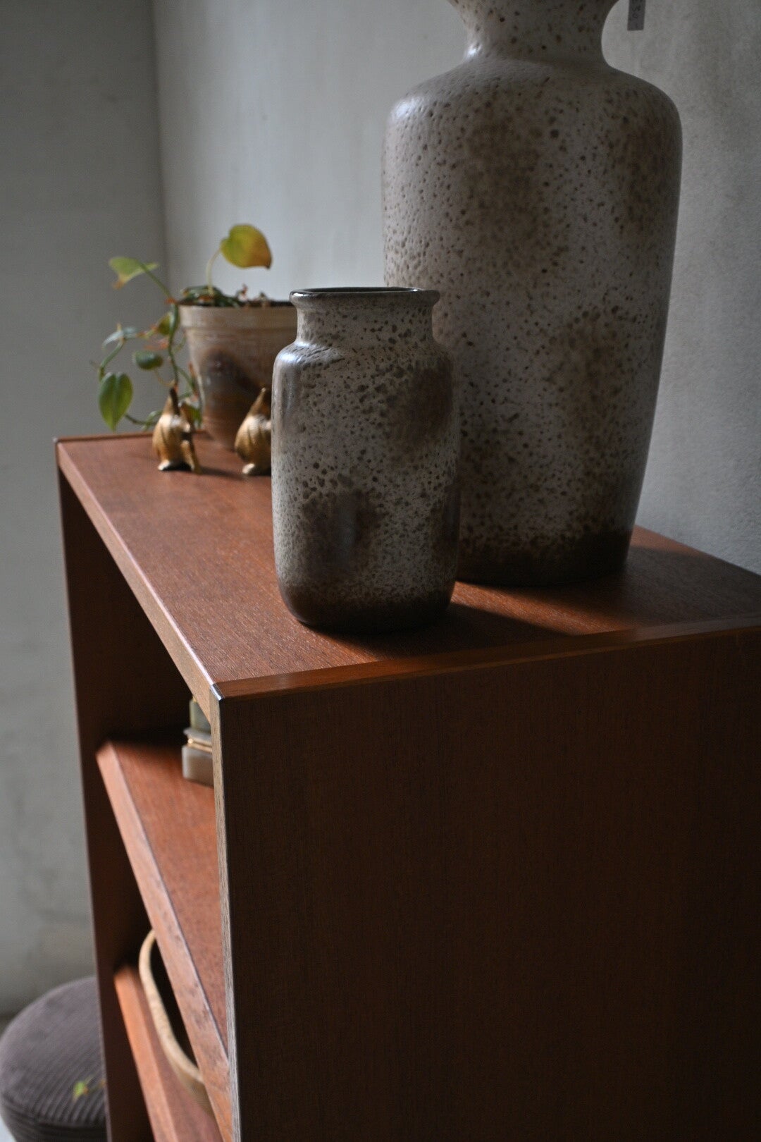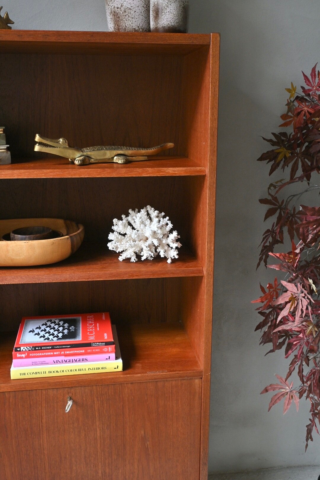 Het ranke hoge wandmeubel bied bergruimte achter de klepkast en genoeg plek voor de boeken elpees of designitems die in het zicht mogen blijven.