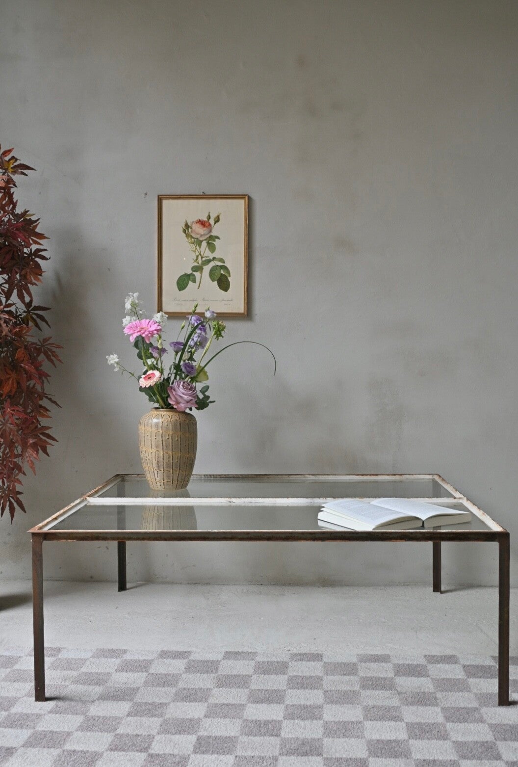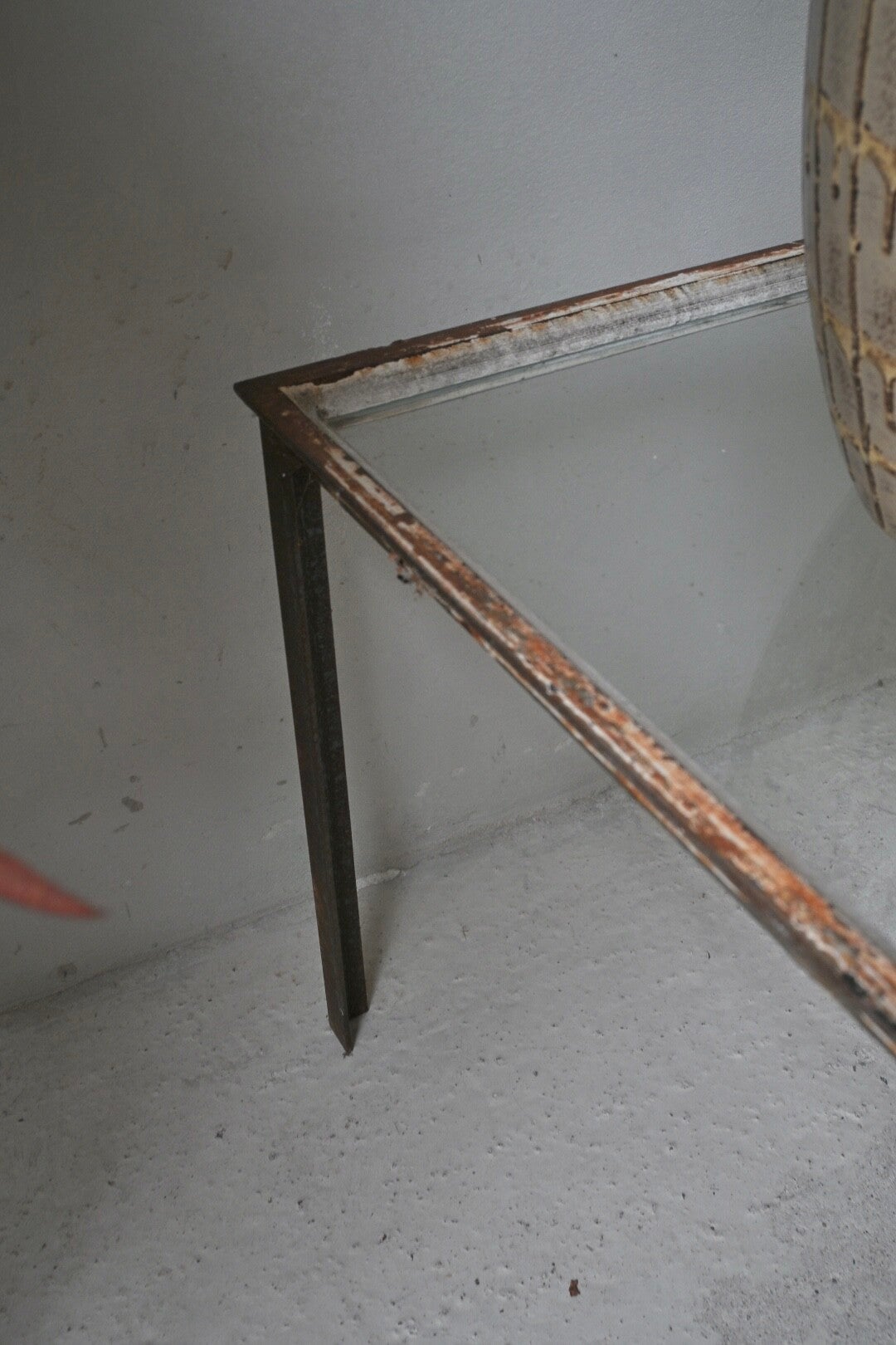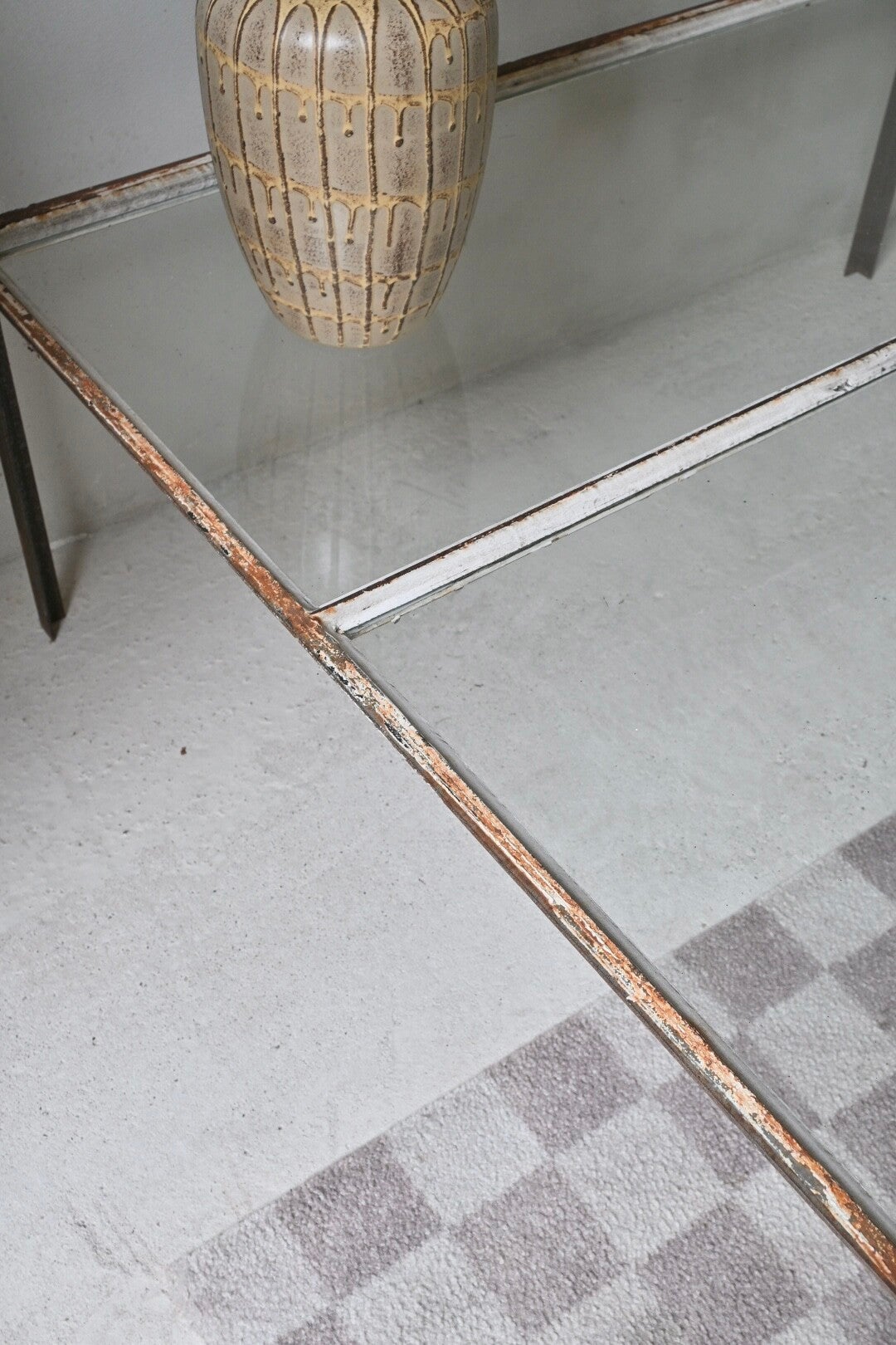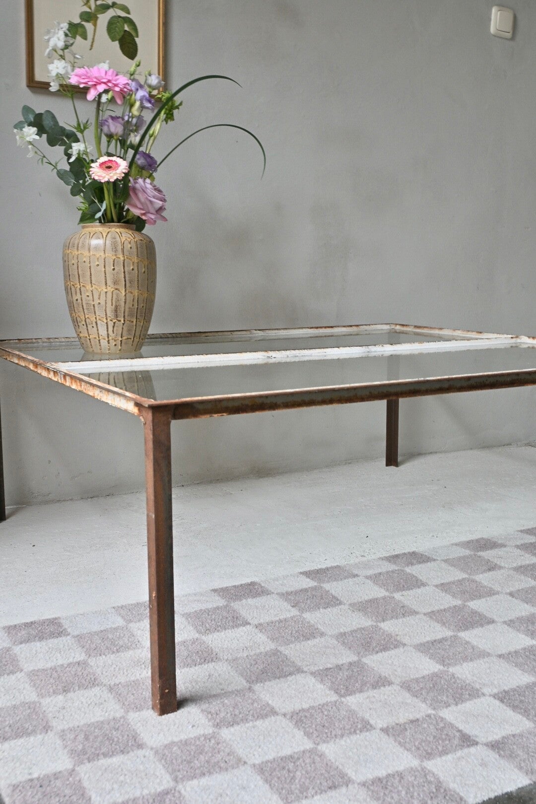 Unieke industriële salontafel. Met de hand vervaardigd van hoekijzer waarin als een oud kozijn vensterglas is geplaatst met stopverf. Een echt conversationpiece.