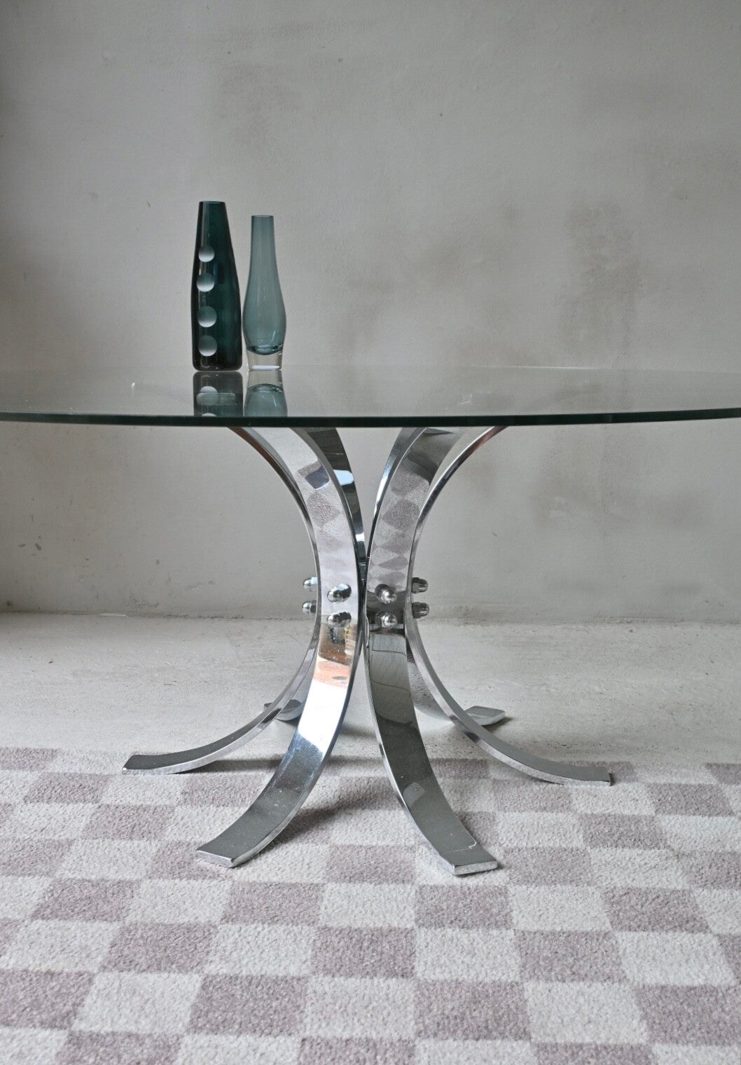 Prachtige ronde glazen salontafel met rvs onderstel.