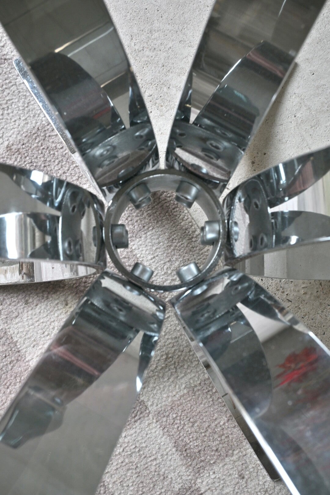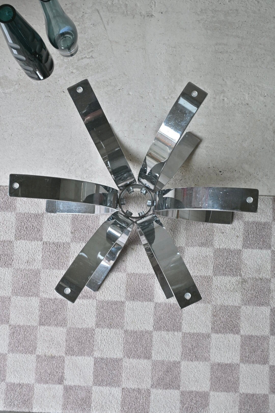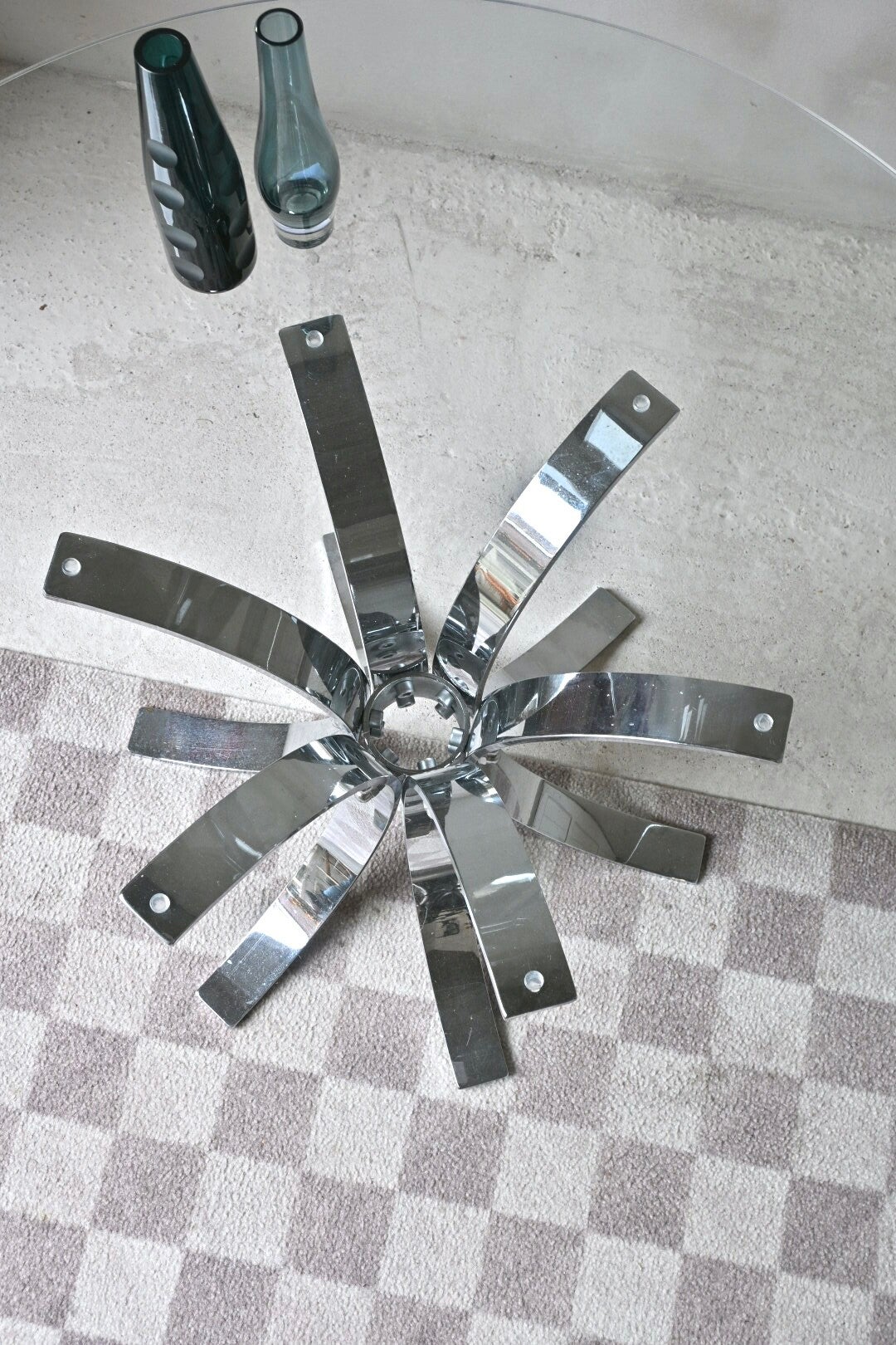 Mooi contrast tussen het zware glanzende metalen onderstel en het transparante blad.