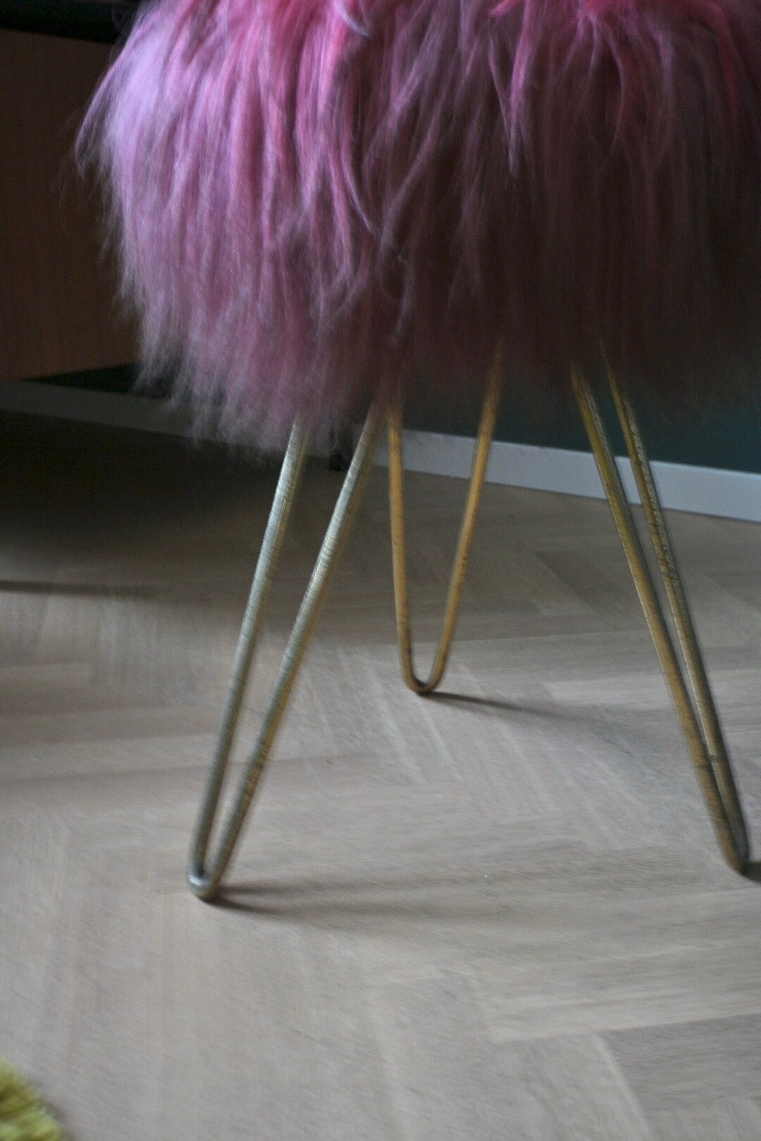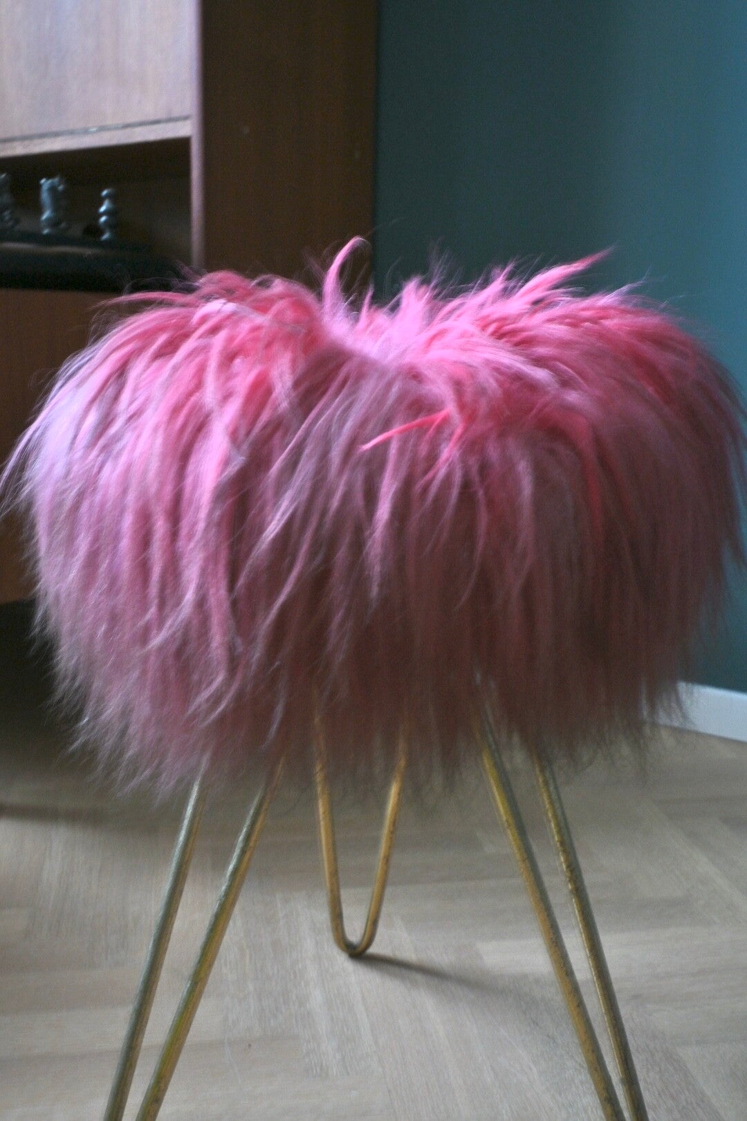 Het krukje staat op drie goudkleurige metalen hairpin poten, de zitting is bekleed met zacht, langwerpig imitatiebont.
