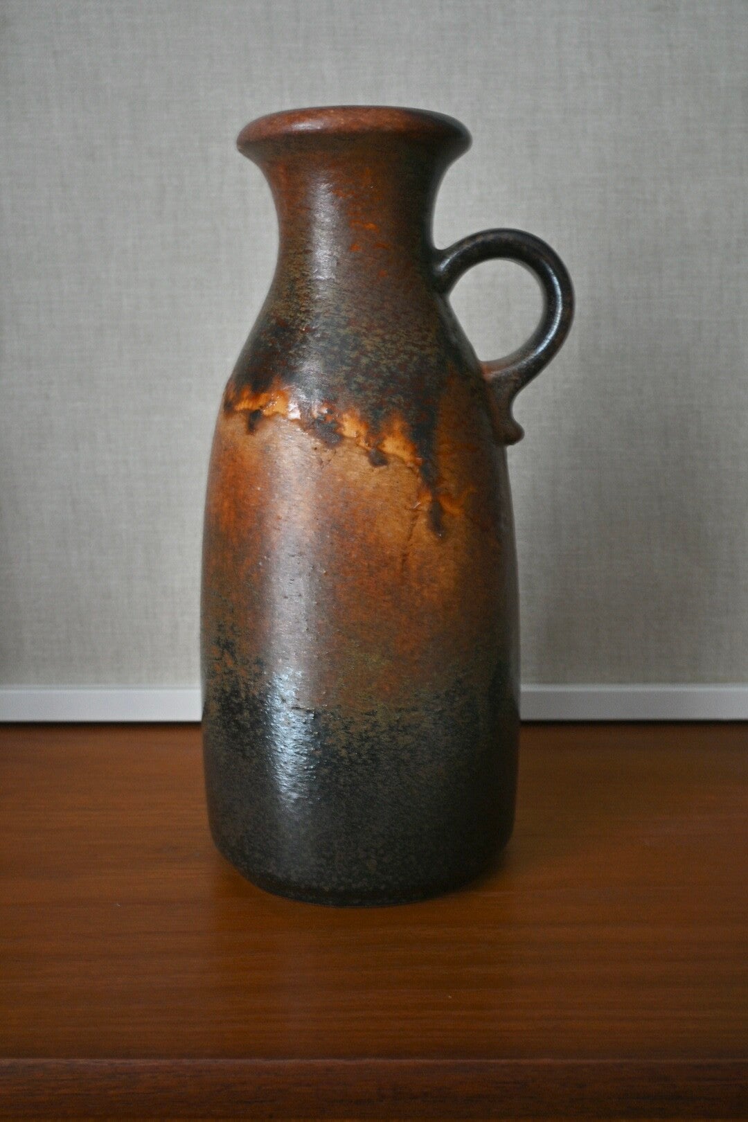 Kenmerkend voor de "Fat Lava" stijl, populair in de jaren '60 en '70. De vaas heeft een opvallend bruin glazuur dat overgaat van een donkere, glanzende basis naar een lichtere, gestructureerde (lavastijl) bovenkant.