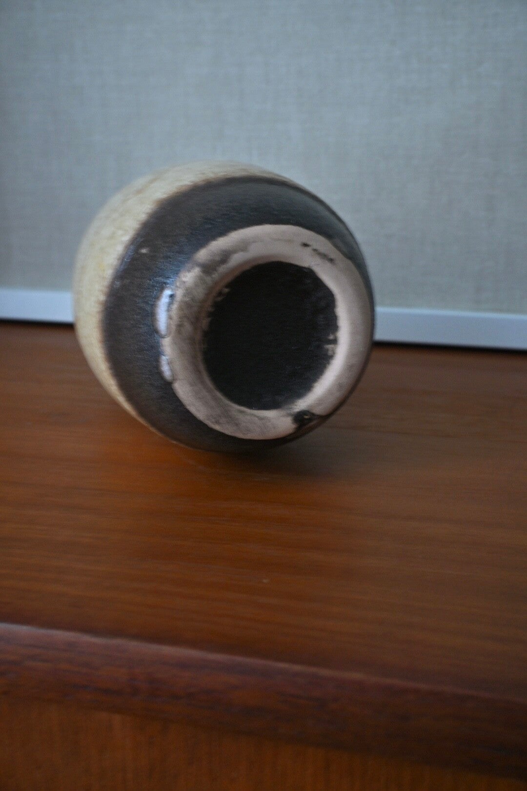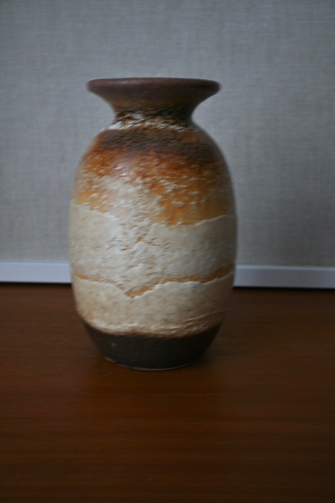 Scheurich 'Fat Lava' vaas uit West-Duitsland model 229-15. De vaas heeft een kenmerkend 'Fat Lava' glazuur, populair in de jaren 60 en 70. Het glazuur is dik aangebracht, wat een ruwe, gestructureerde afwerking creëert die contrasteert met de strakke vorm. De kleuren variëren van donkerbruin aan de onderkant tot lichtere crème- en oranjeachtige tinten naar boven toe.