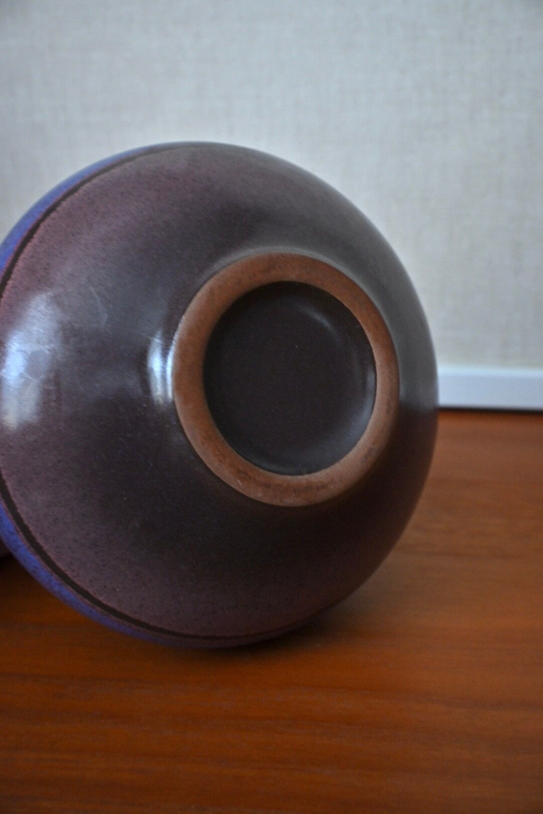 Keramieken vaas uit de populaire 'Viola'-serie van de West-Duitse fabrikant KMK Kupfermühle. Geglazuurd in een paarsblauwe kleur met bladvormige decoraties in blauw-groen en roze. Dit is een klassieker binnen de Duitse keramiekproductie.
