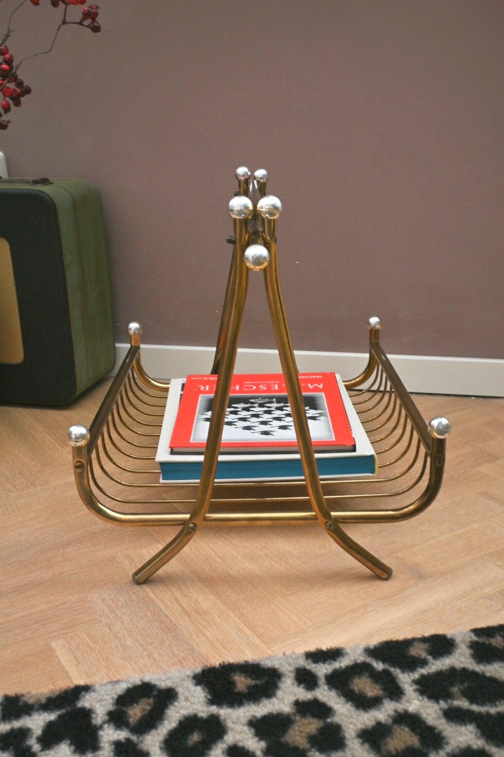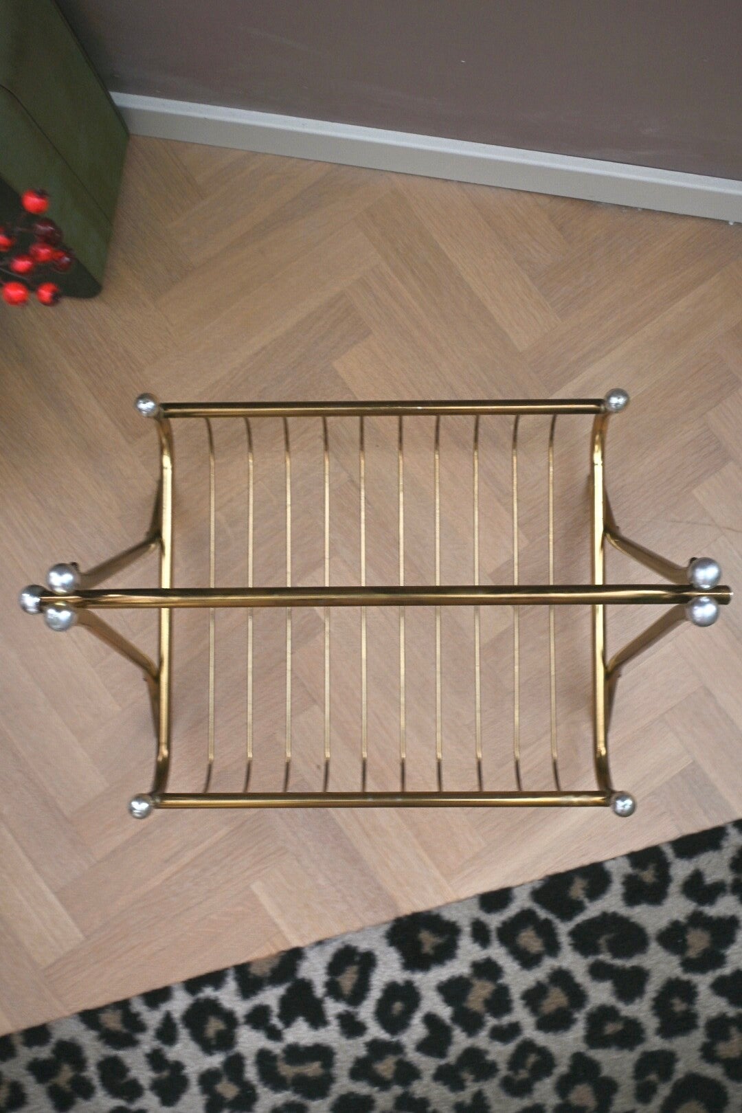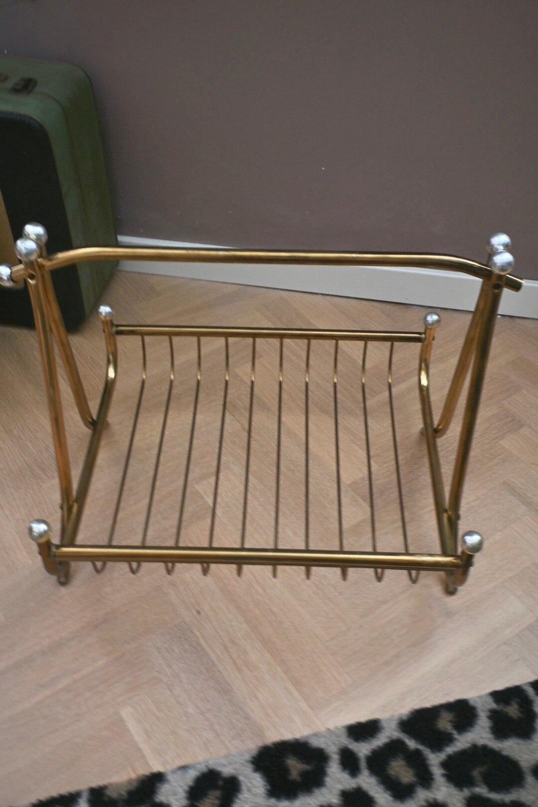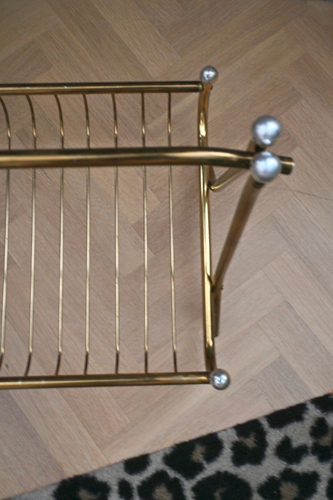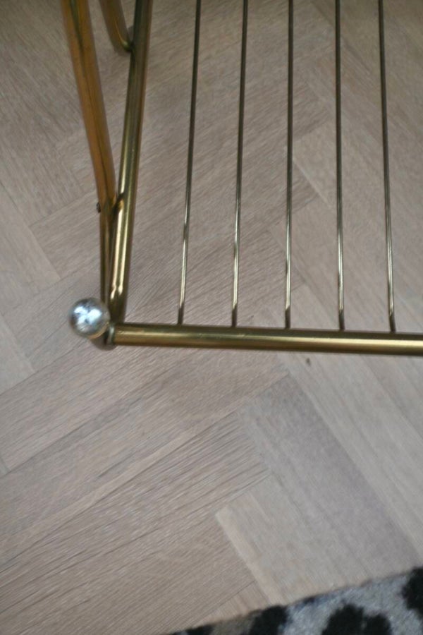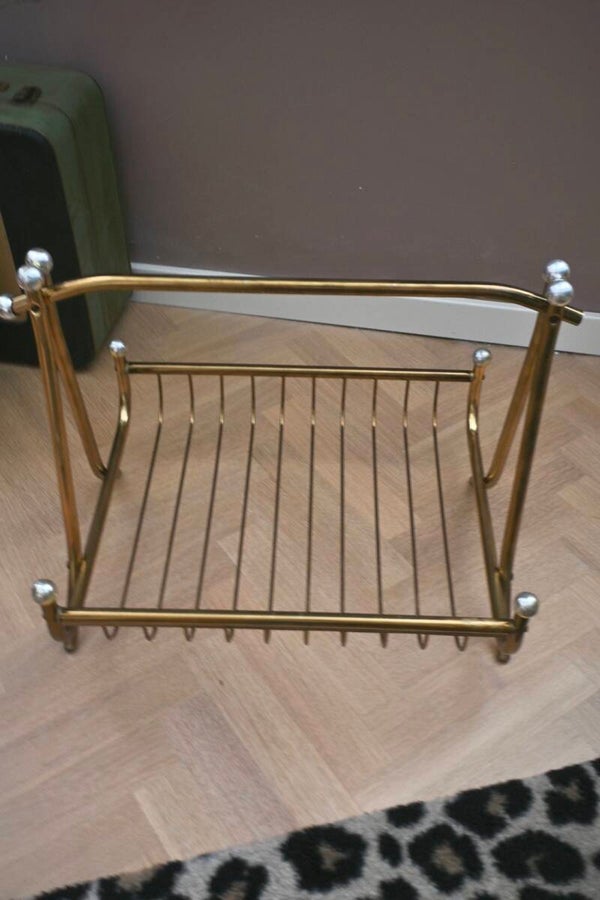 Hollywood Regency-stijl messing tijdschriftenrek afkomstig uit de jaren 60. Mooi groot messing rek met zilverkleurige knopjes. Het rek zal goed tot zijn recht komt in vrijwel ieder interieur.