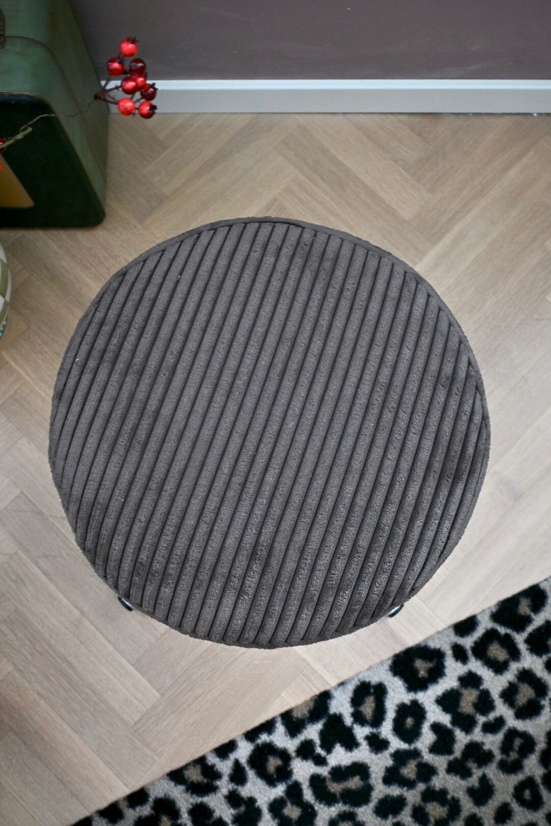 De zitting is bekleed met corduroy ribstof wat zorgt voor een comfortabele zitervaring. Het metalen onderstel met de vier poten biedt stabiliteit en is typisch voor die periode.