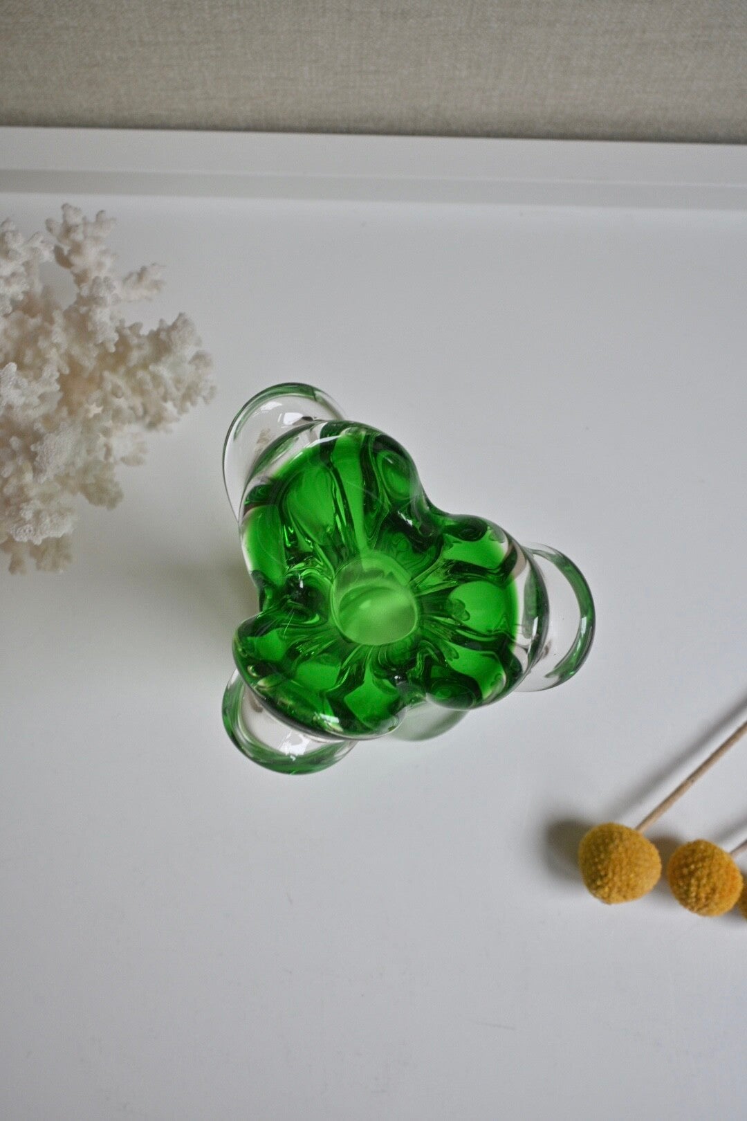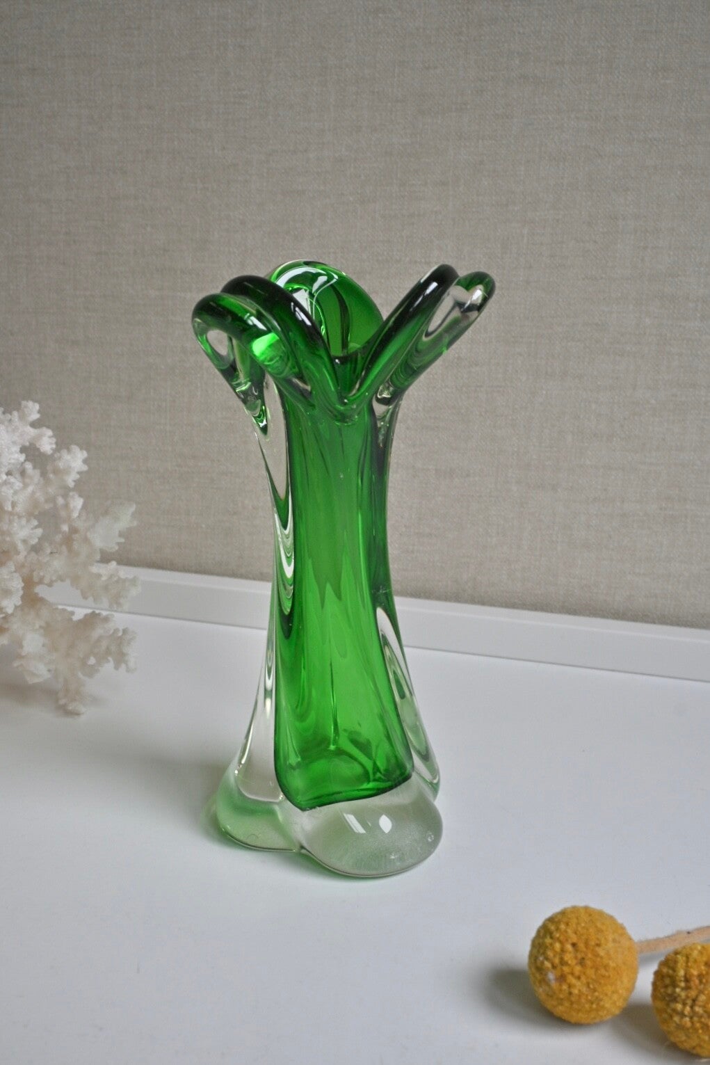 Prachtige groene vaas in Murano-stijl. De vaas heeft een bloemig, ontwerp, mogelijk afkomstig uit de jaren 50 tot 70.De vaas verkeert nog in een goede staat, geen chips o.i.dH:16,5cm
