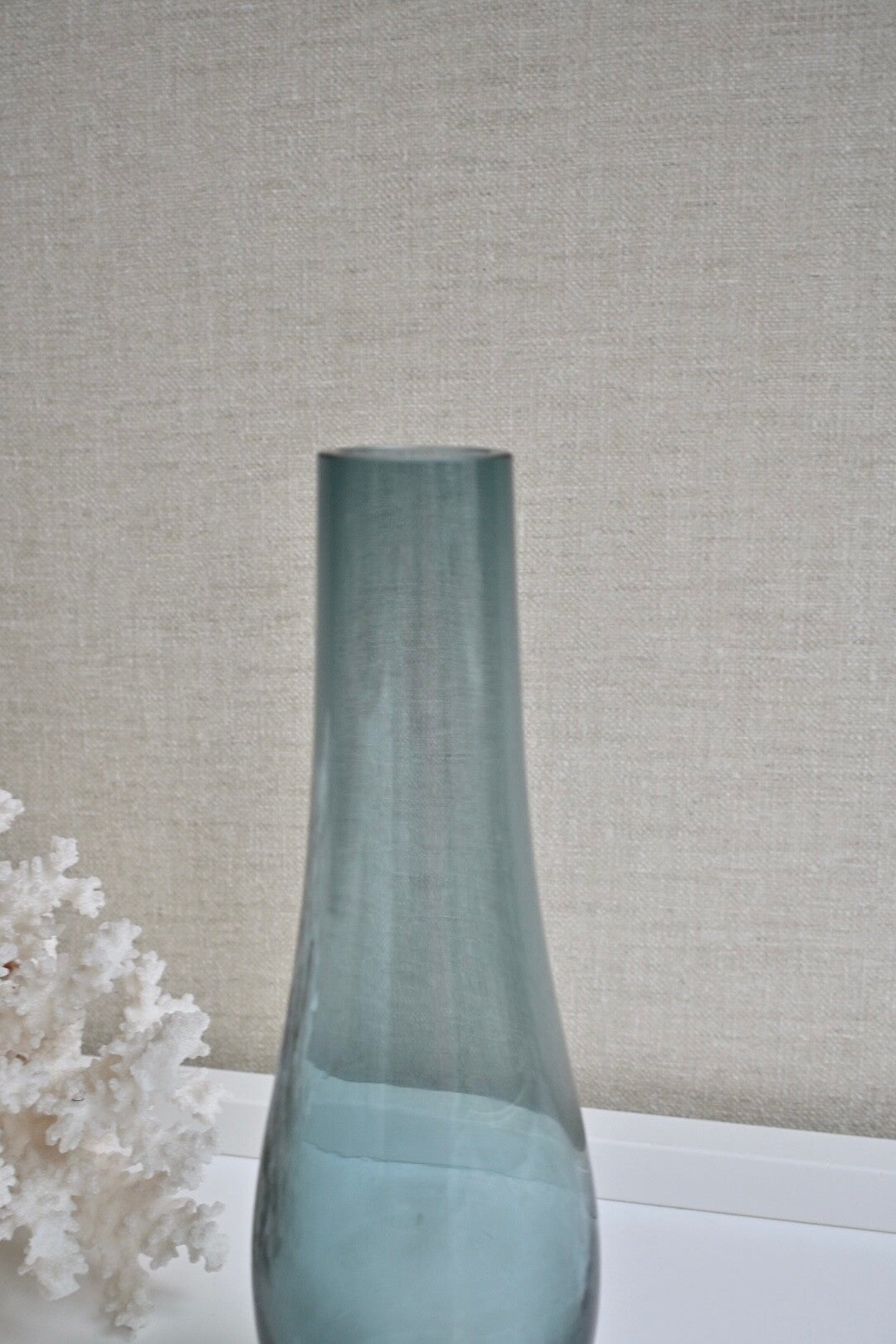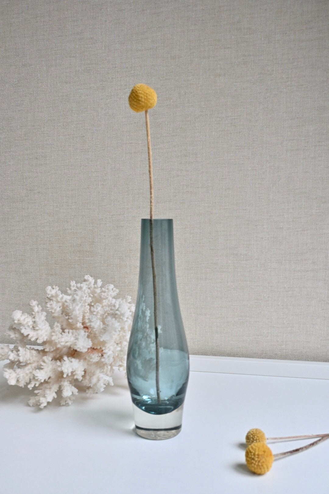 Scandinavisch design vaasje, elegante taps toelopende vorm met een dikke heldere glazen voet en een gekleurd bovenstuk, in dit geval een grijs-blauwe of "teal" tint. Het vaasje verkeert nog in een mooie staat geen chipjes o.i.dH:21cm