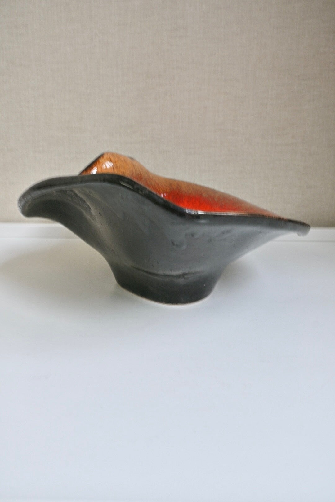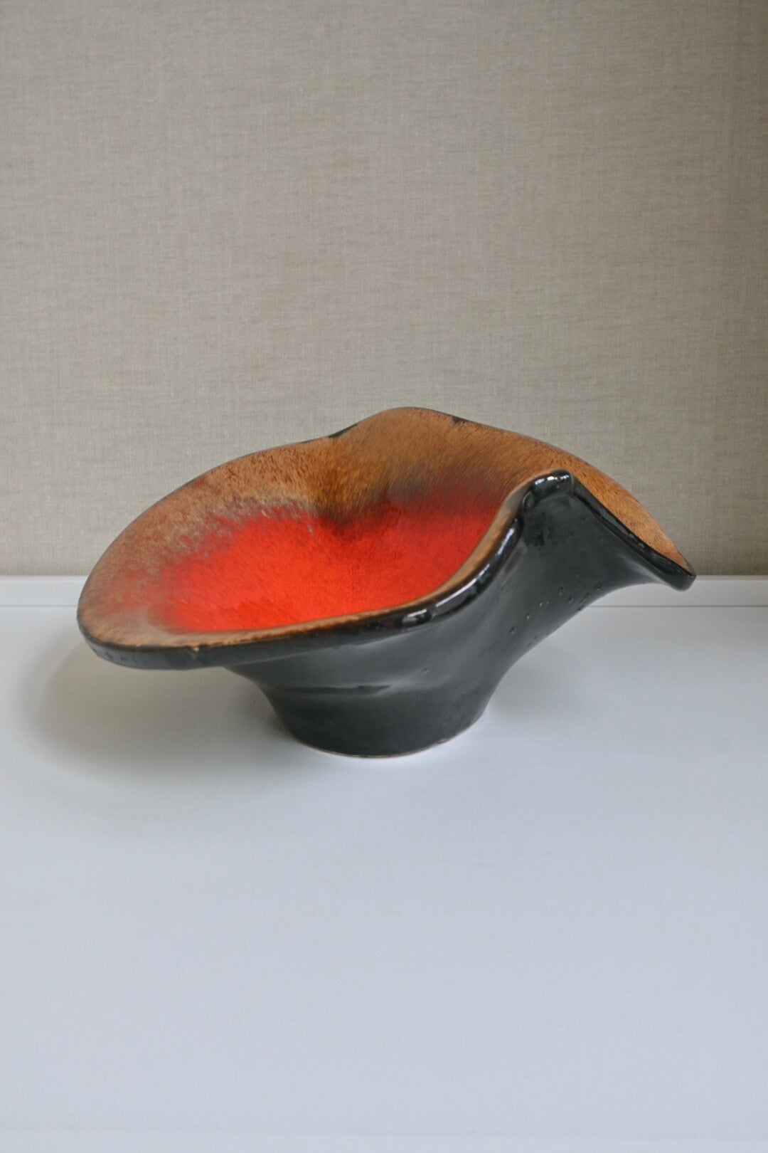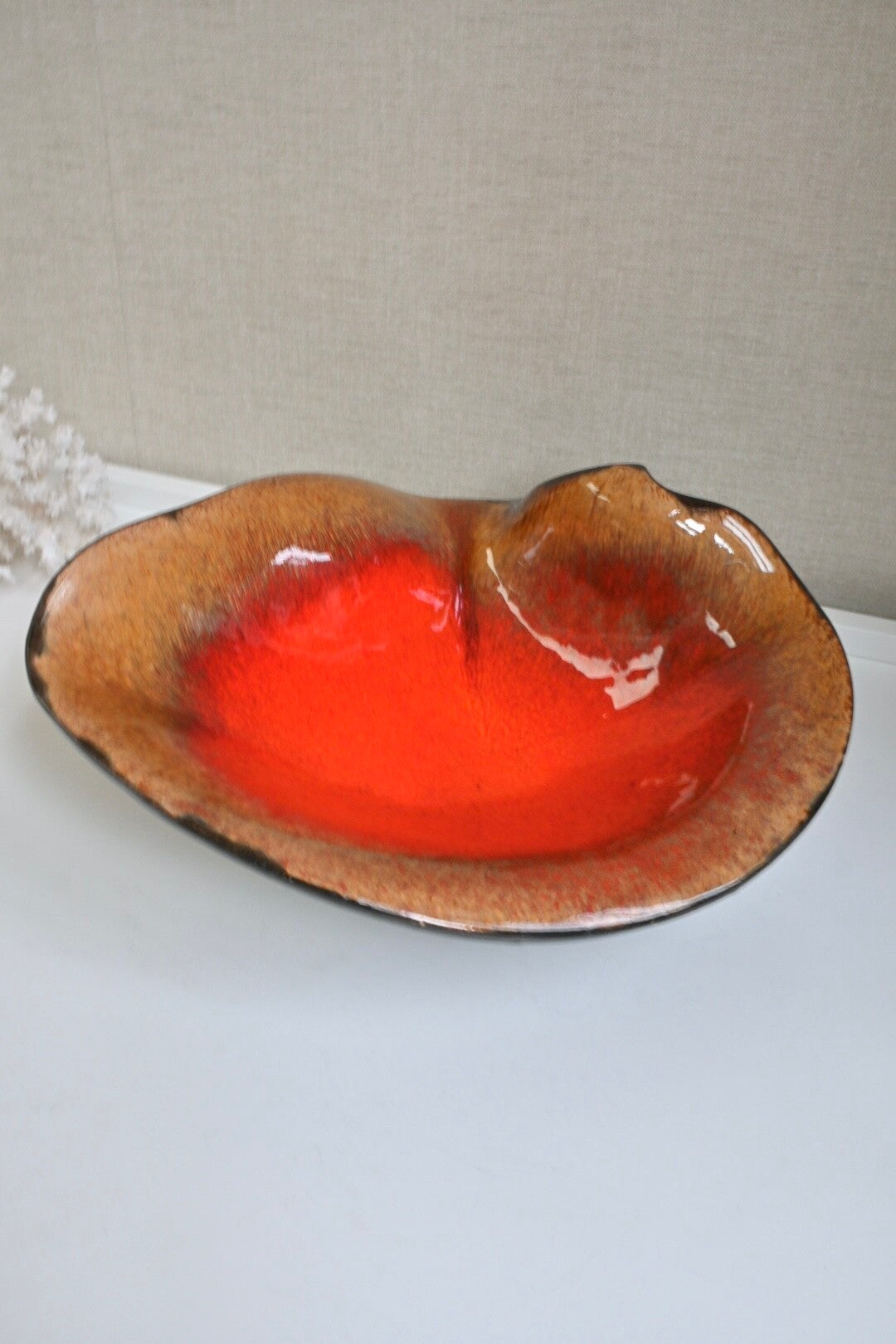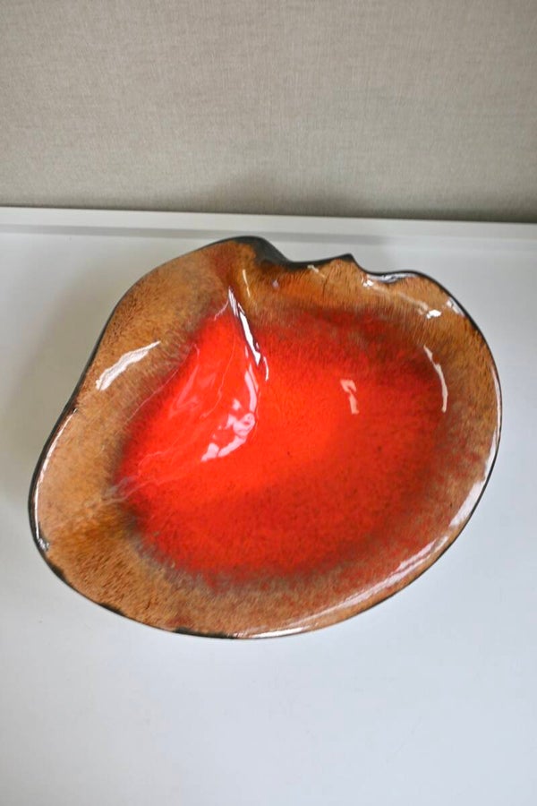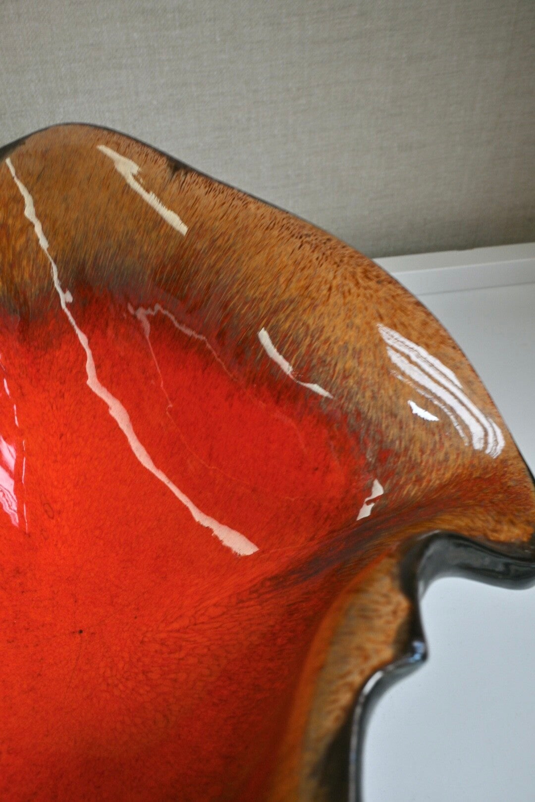 De binnenkant is afgewerkt met druppelglazuur dat overgaat van een helder oranje-rood in het midden naar een bruin-beige aan de randen. Afkomstig uit de jaren 60.