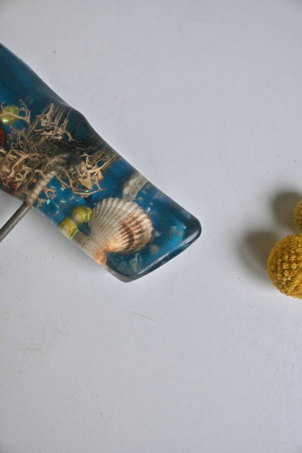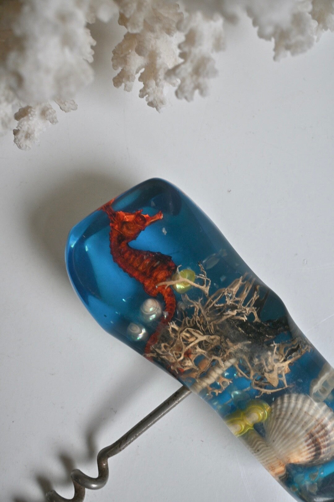 Leuke vintage kurkentrekker met een transparant hars handvat dat een onderwater/zee-thema bevat. Binnenin zitten miniatuur zee-elementen zoals een rood zeepaardje, schelpen en gedroogd zeewier. Afkomstig uit de jaren 70 of 80.