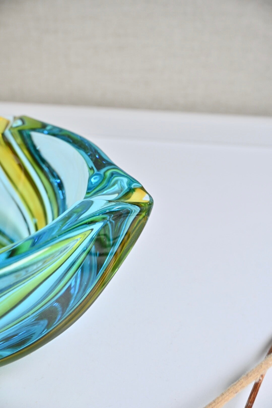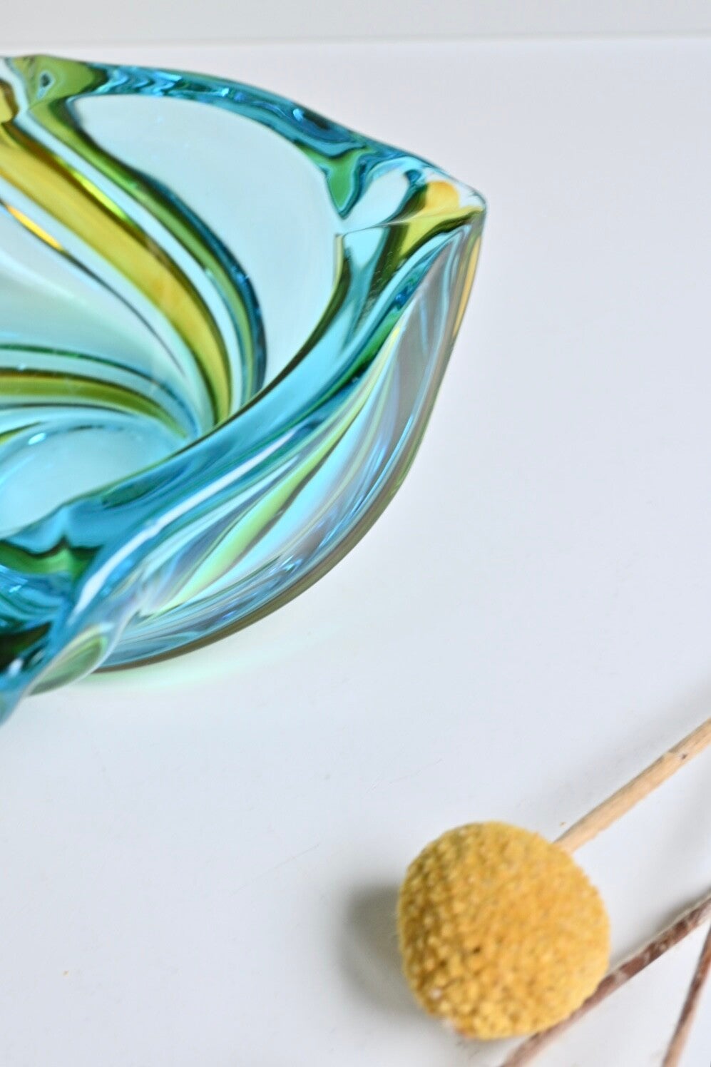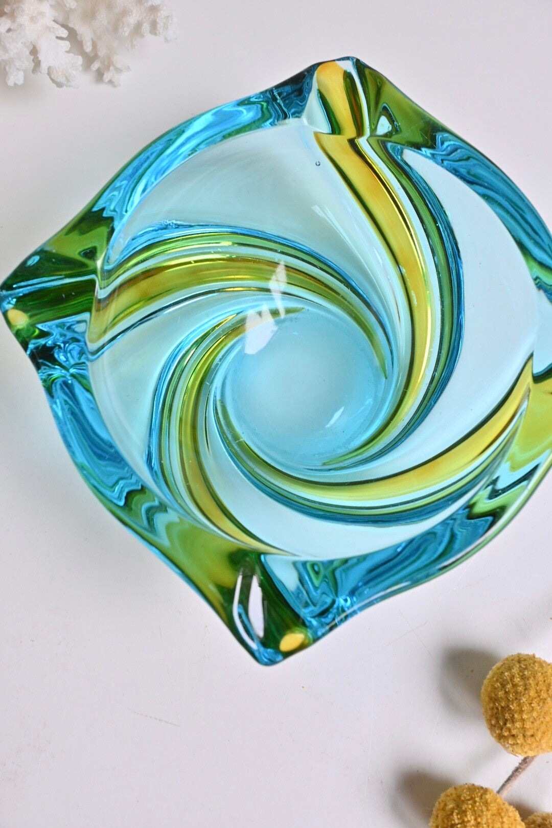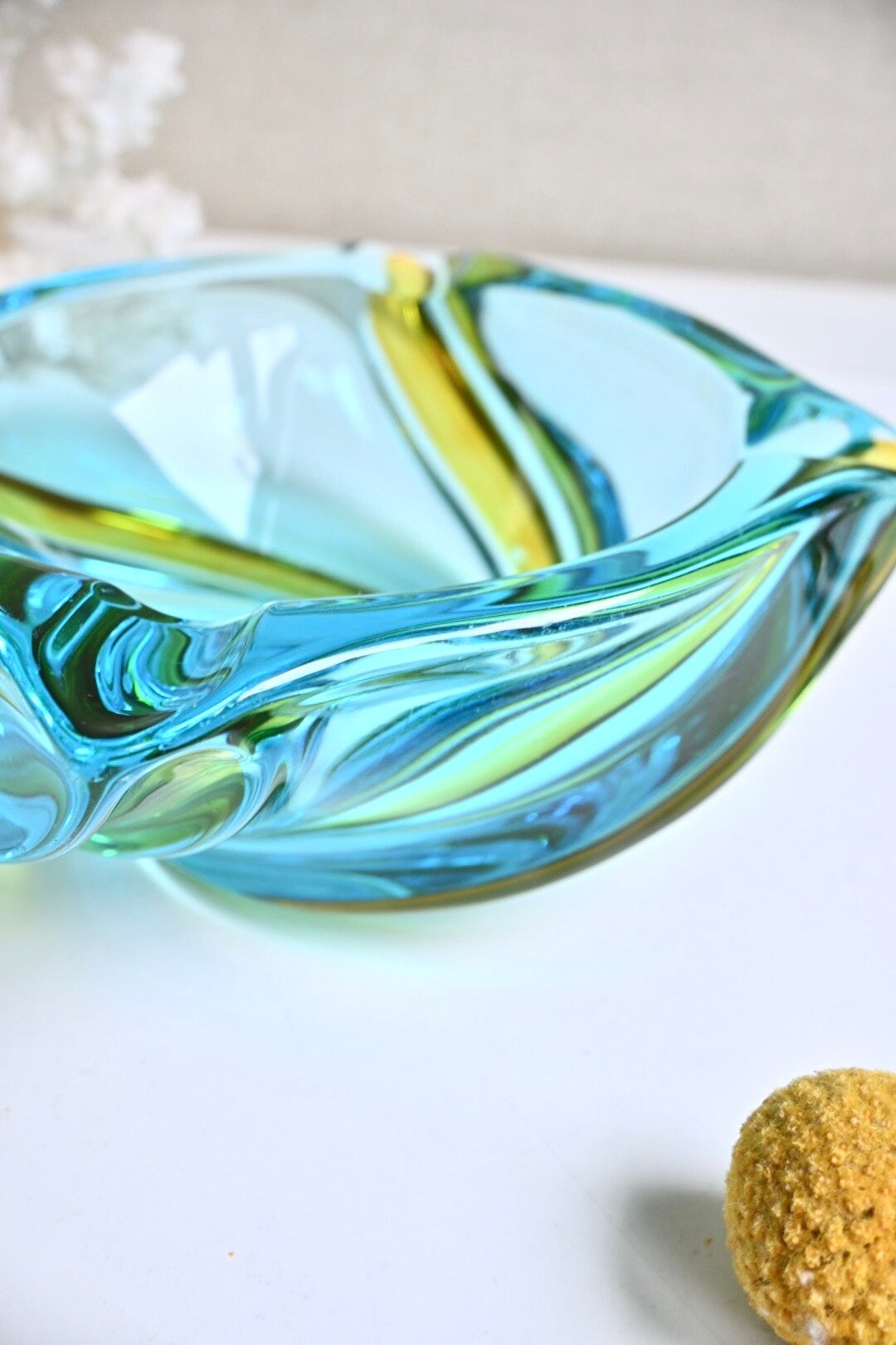 Mooie zware vintage Murano glazen asbak in blauwgroene en gele kleuren. Afkomstig uit de jaren 70.De asbak verkeerd in een goede staat passend bij de leeftijdH:6cm Dia:13cm
