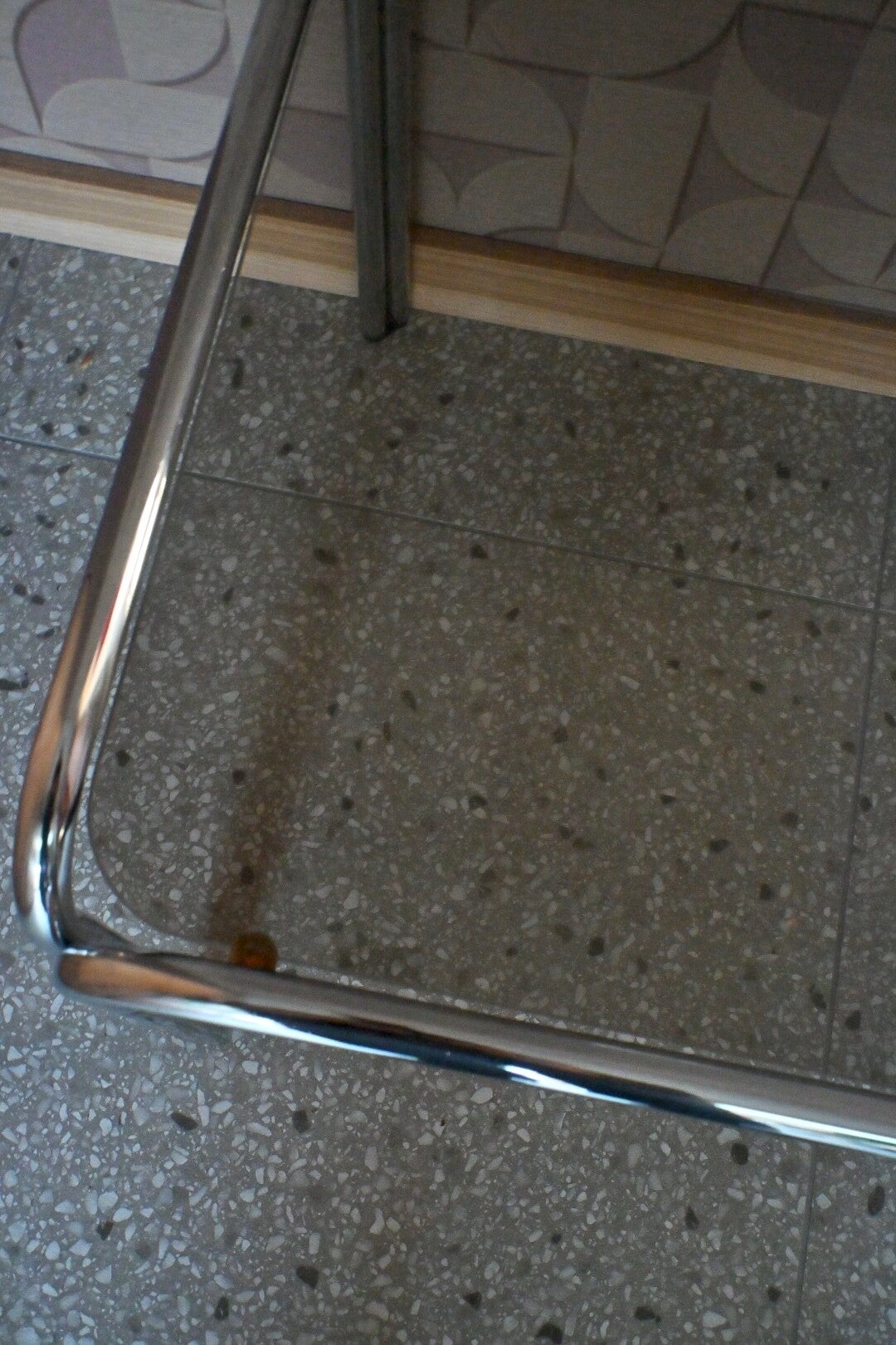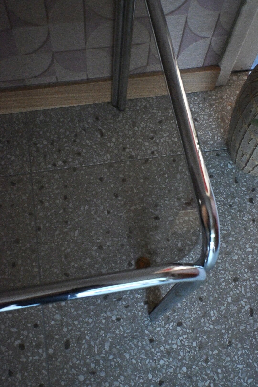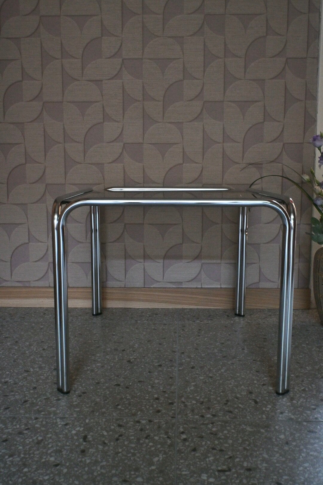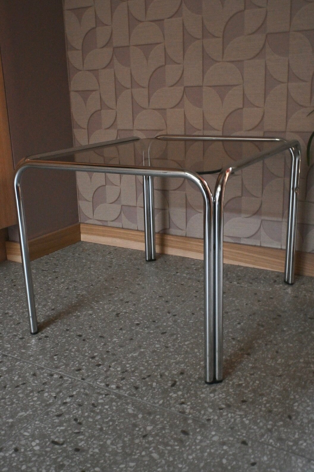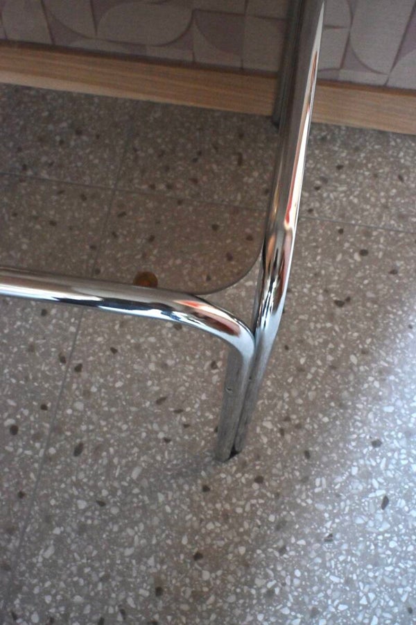 Mooie vintage Buizenframe bijzettafel met rookglazen blad. Afkomstig uit de jaren 70. In nette vintage staat met enkele gebruikerssporen conform leeftijd en gebruik, zoals krasjes op het blad. H:42cm B:60cm D:50cm