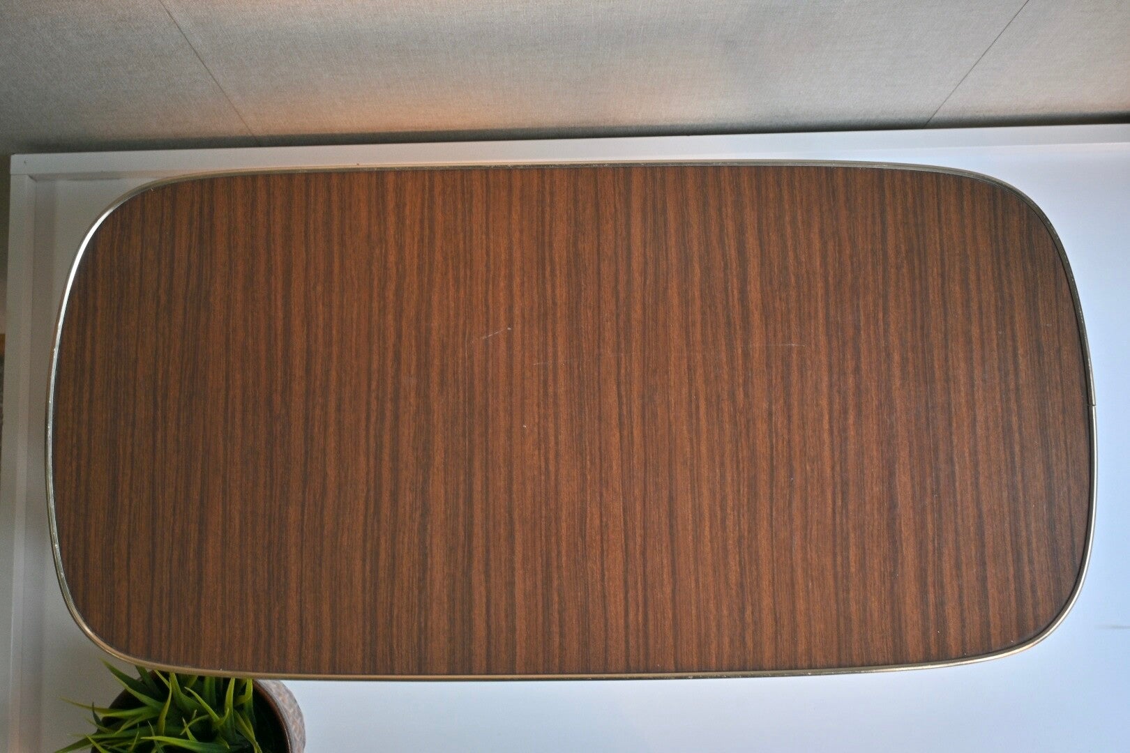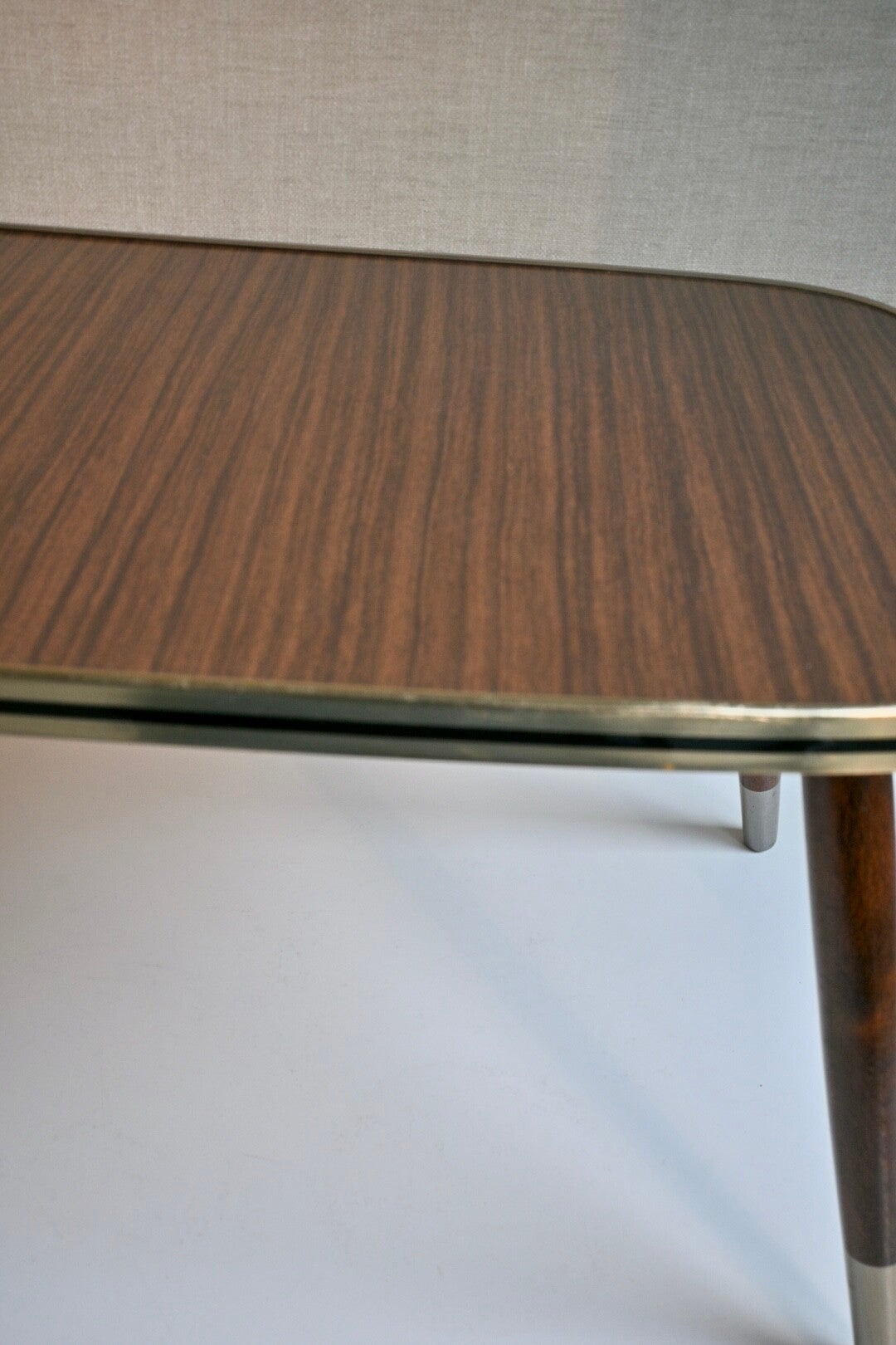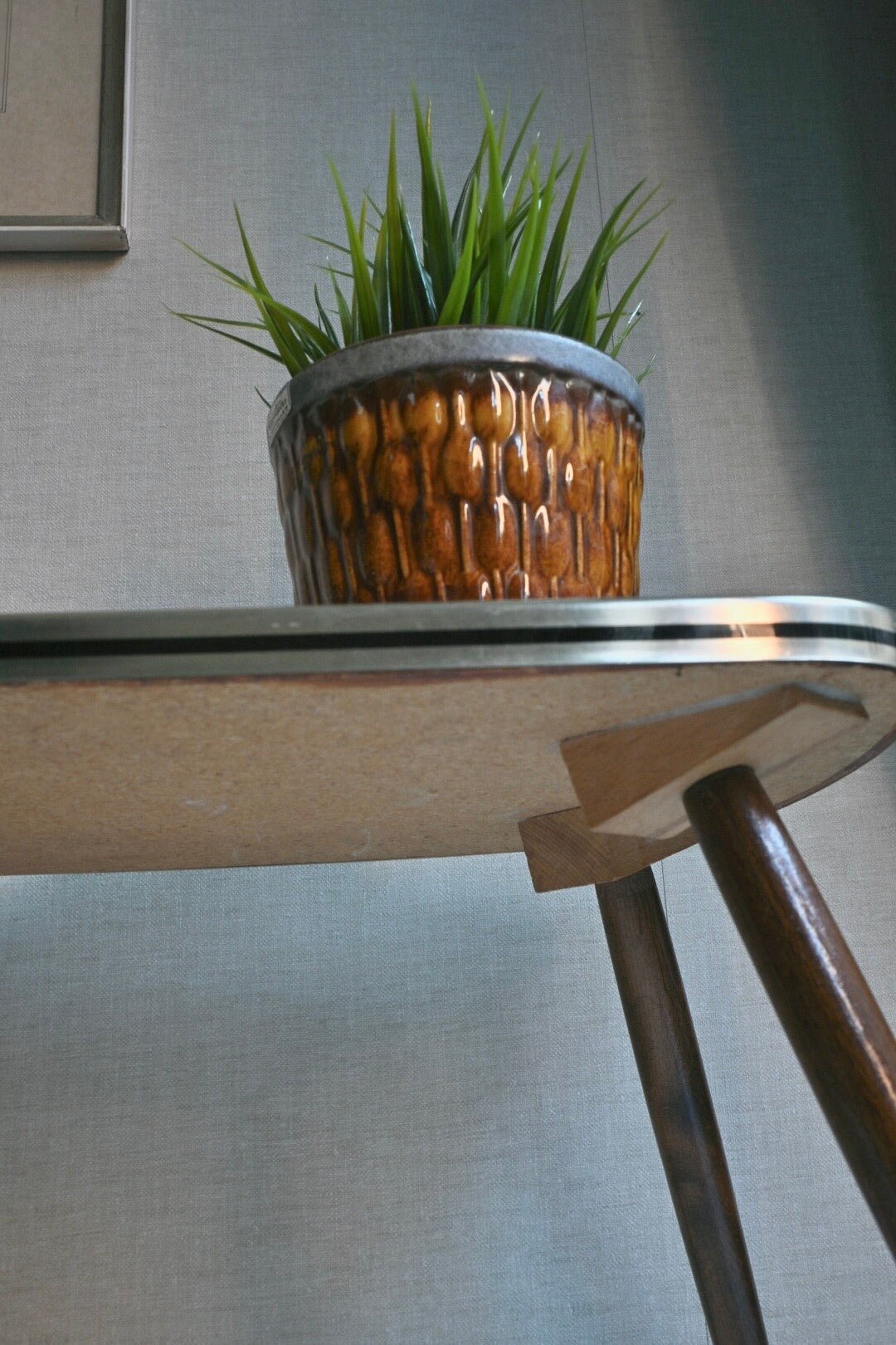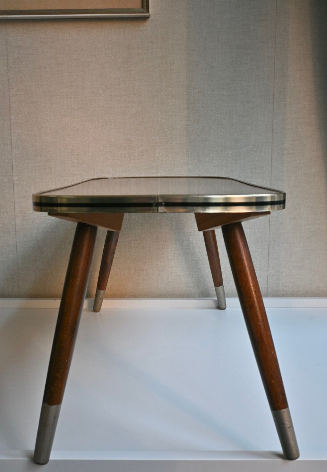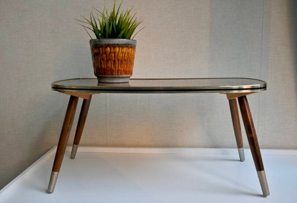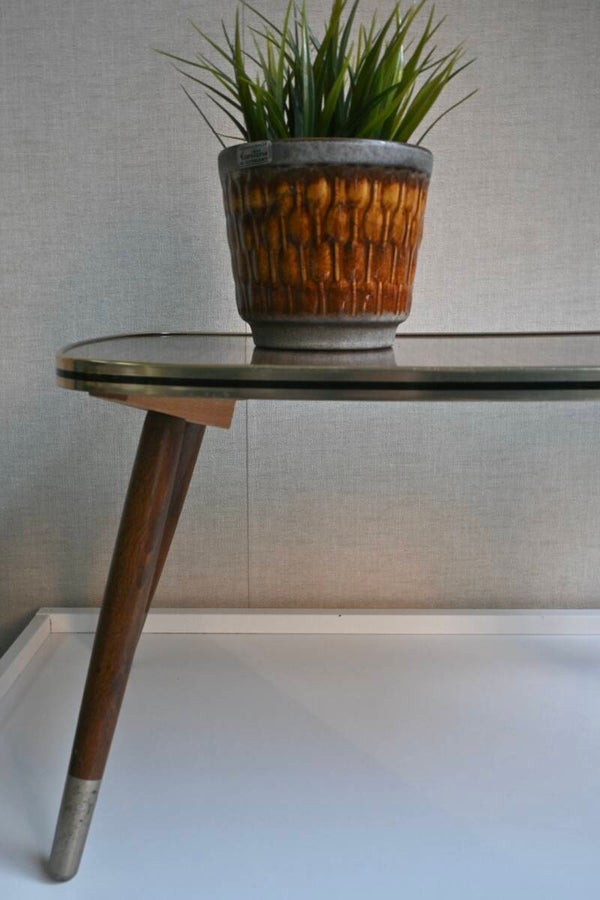 Leuk vintage bijzettafeltje of plantentafeltje met een formica blad, messing bies en conische houten pootjes.Verkeert nog in een goede vintage staat.H:27cm B:55cm D:28cm