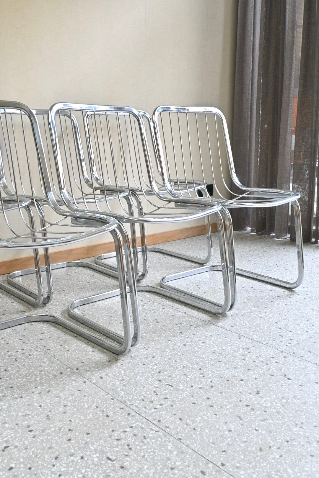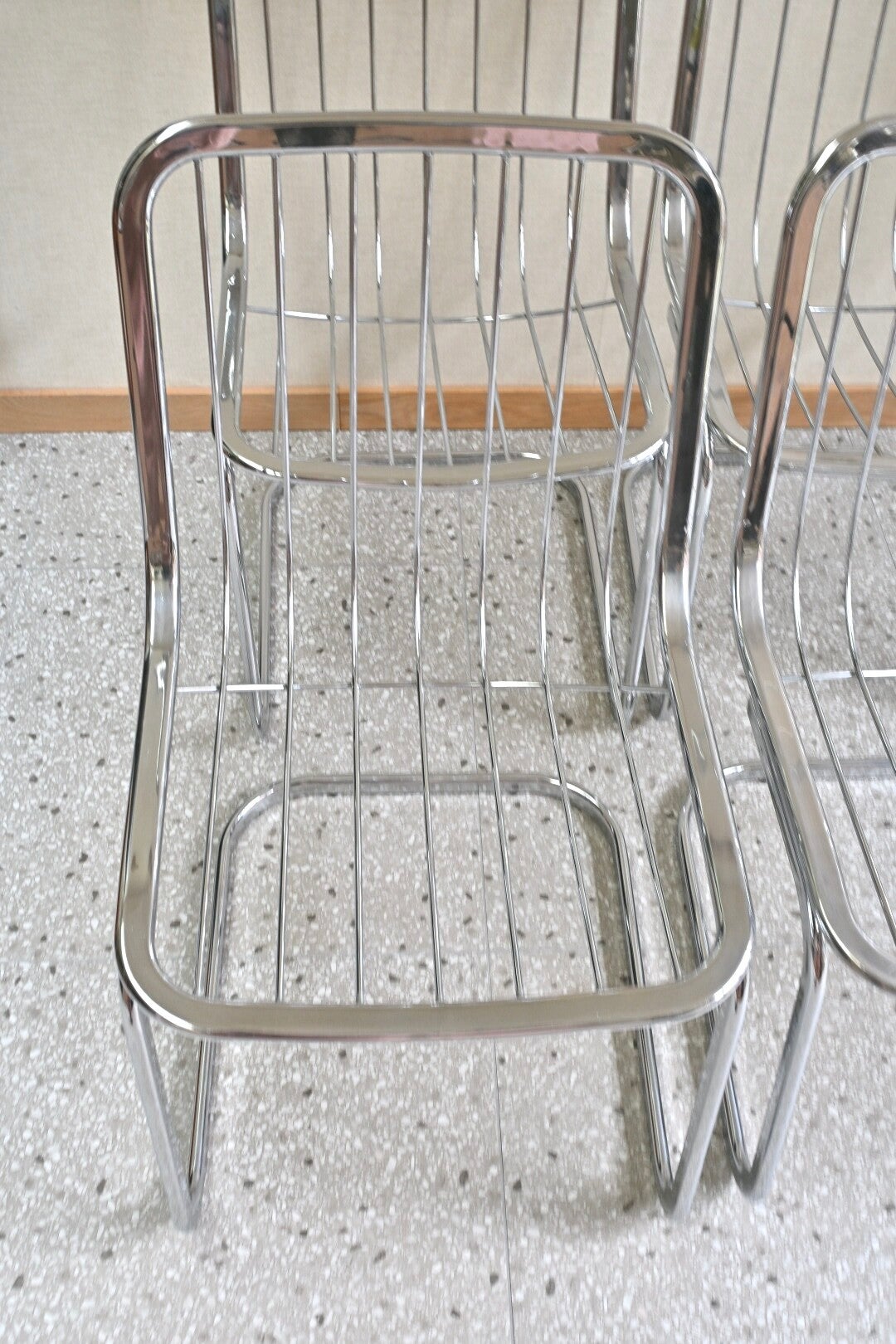 De zwaar verchroomde stoelen verkeren in vintage maar goede staat, met minimale gebruikssporen horend bij de leeftijd.