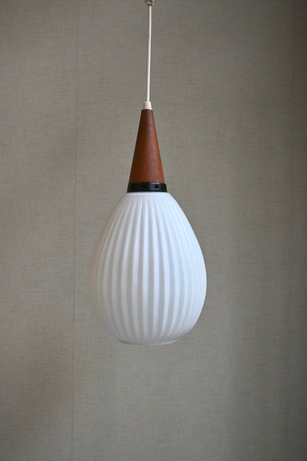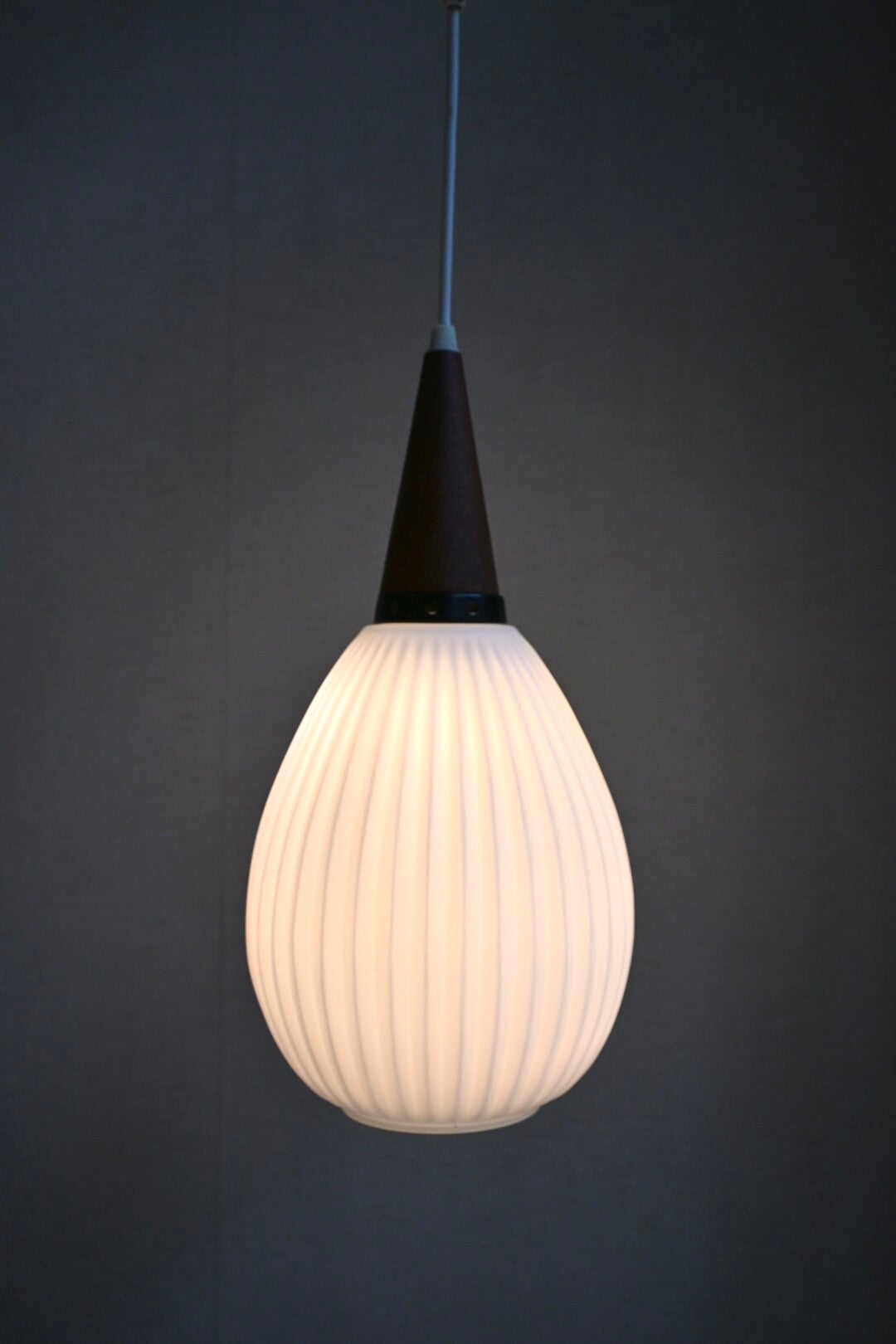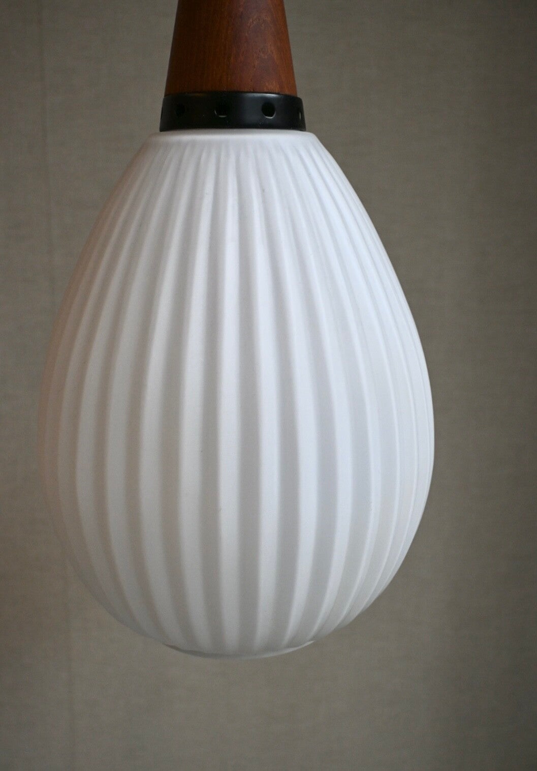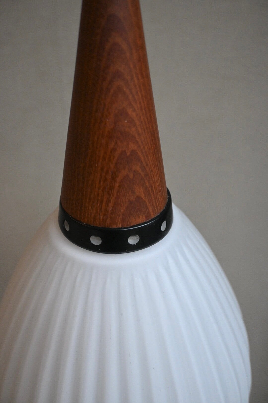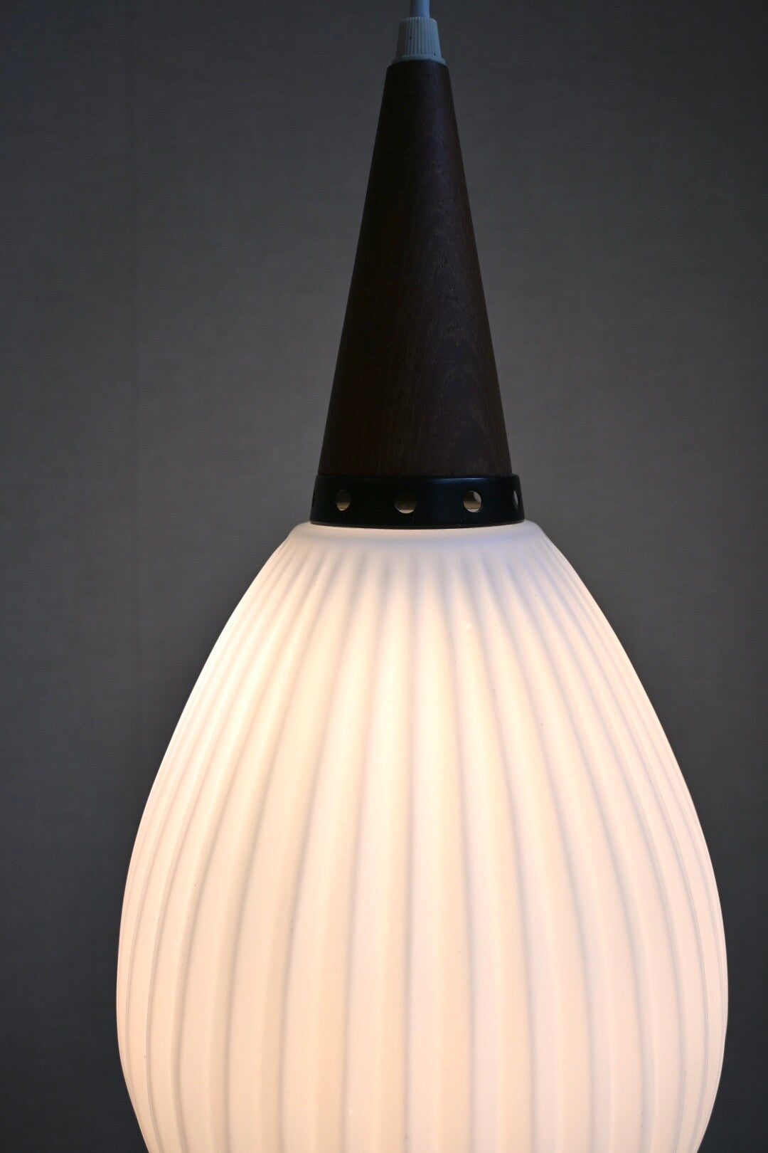 Vintage hanglamp in Mid-Century Modern stijl van de Nederlandse ontwerper Louis Kalff voor Philips uit de jaren 60. De lamp kenmerkt zich door een druppelvormige kap van geribbeld opaline (melk)glas en een kegelvormig houten armatuur van teakhout.