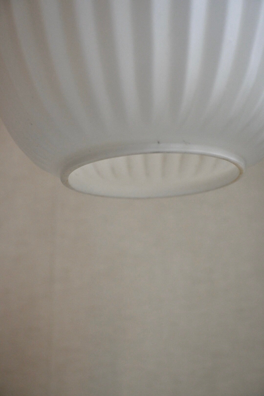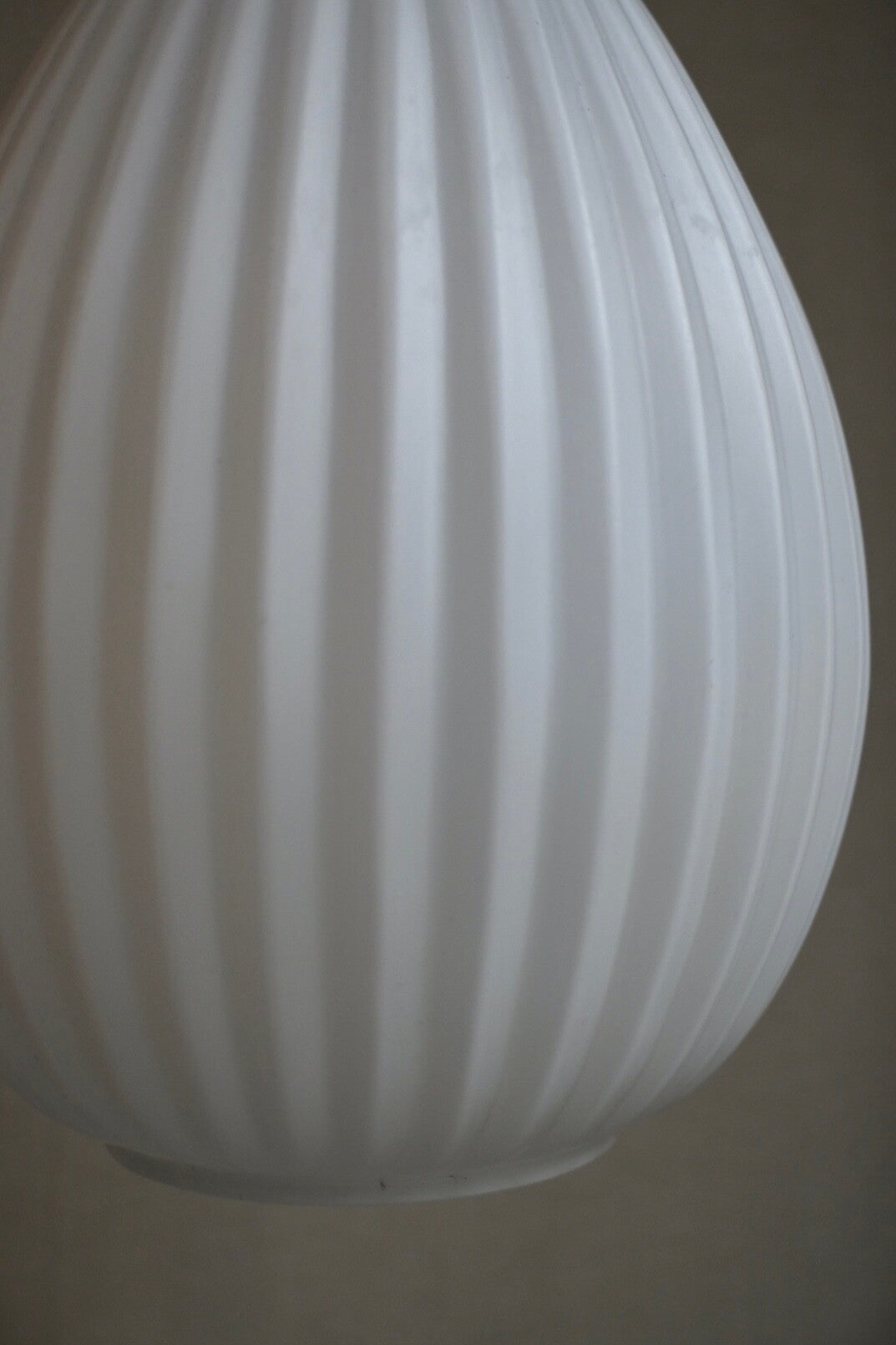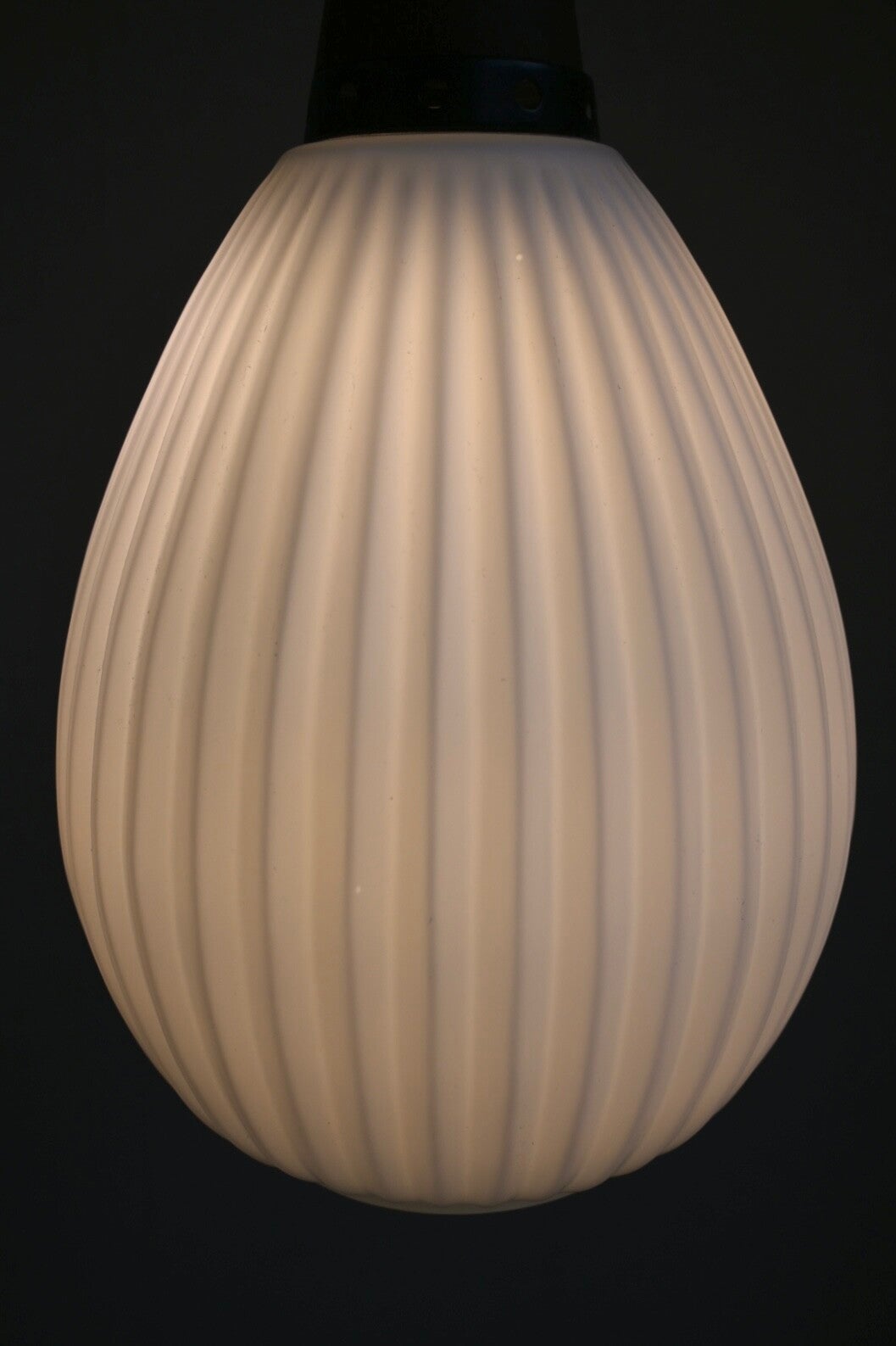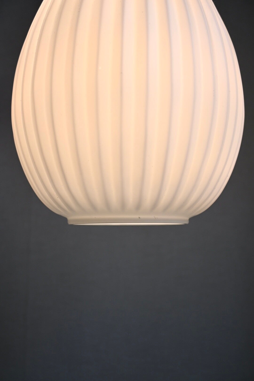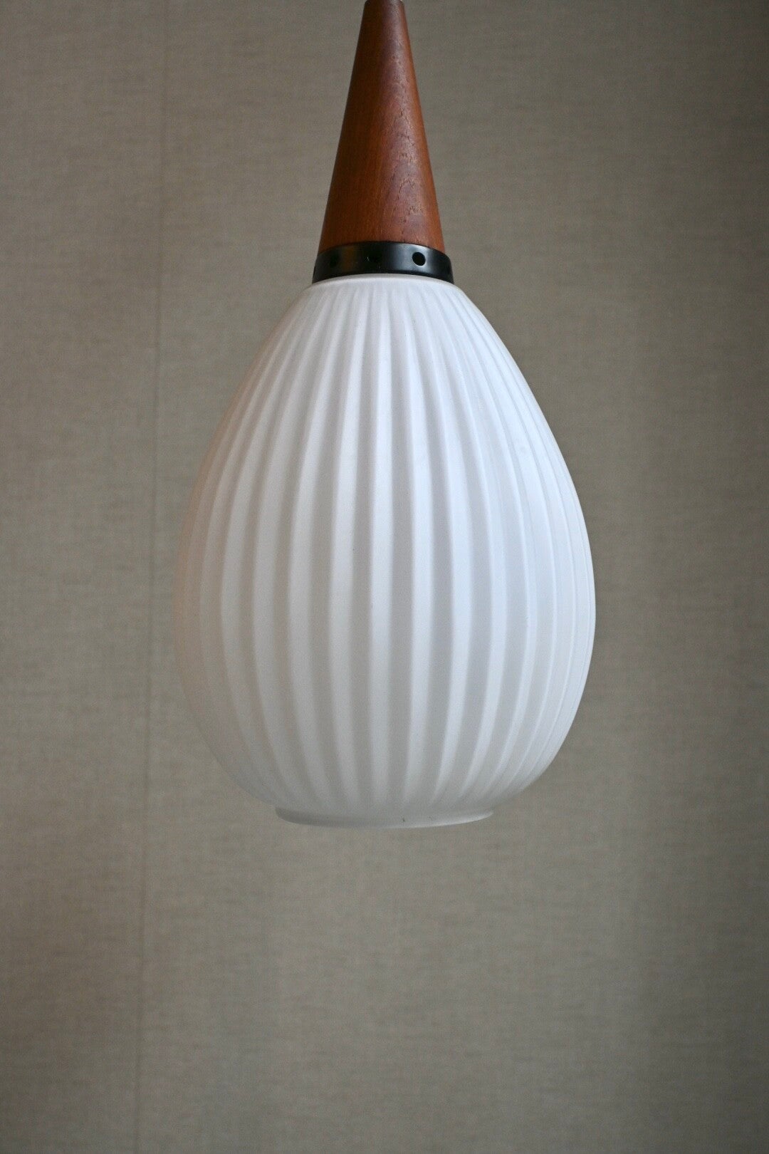 Vintage hanglamp in Mid-Century Modern stijl van de Nederlandse ontwerper Louis Kalff voor Philips uit de jaren 60. De lamp kenmerkt zich door een druppelvormige kap van geribbeld opaline (melk)glas en een kegelvormig houten armatuur van teakhout.