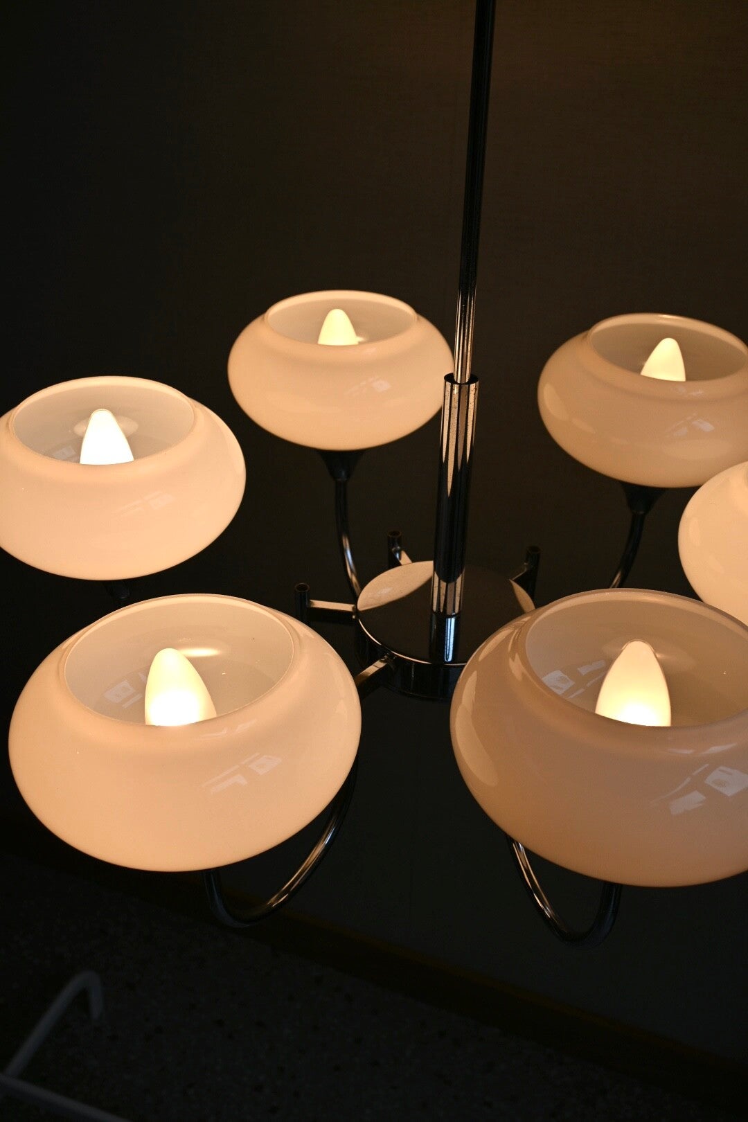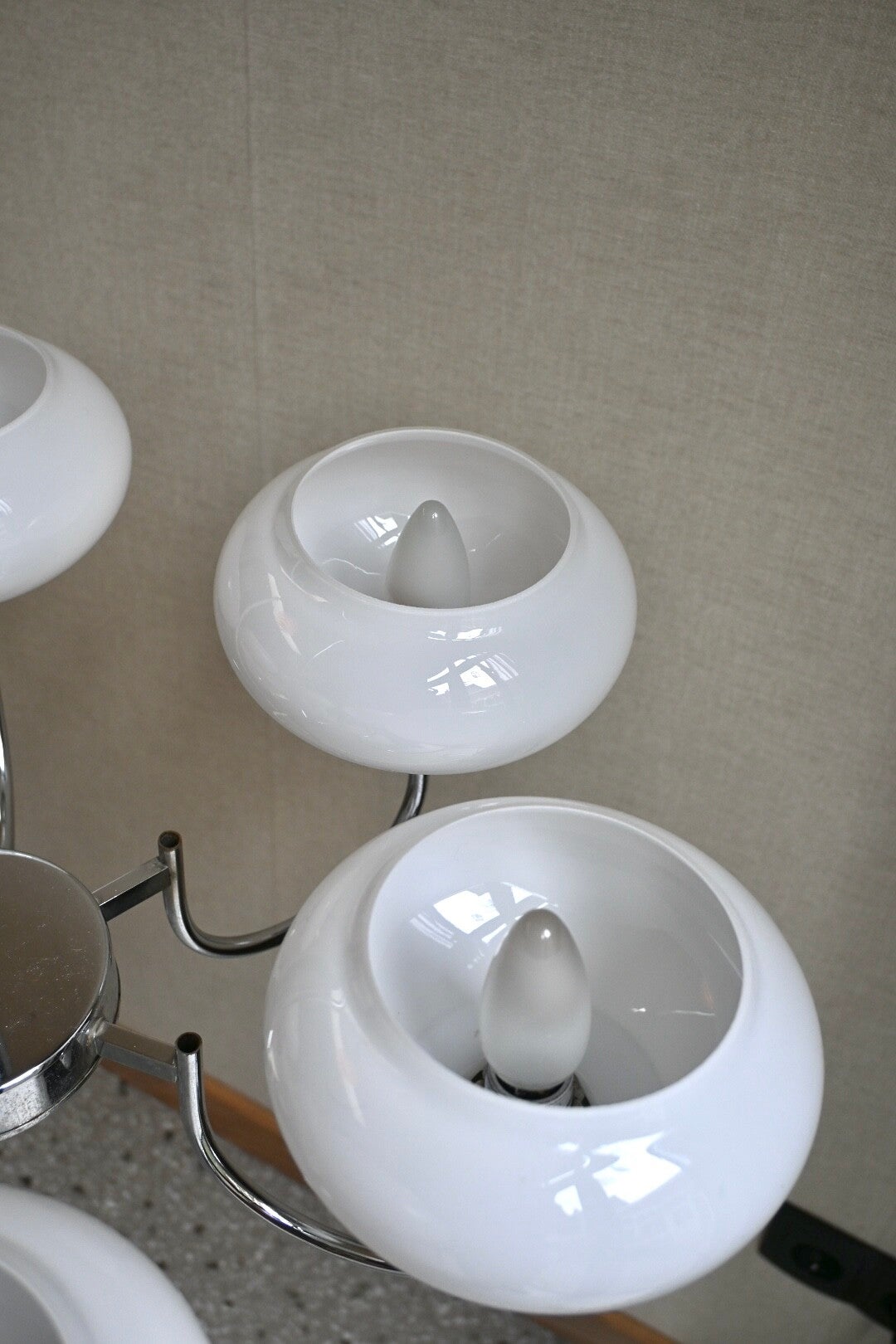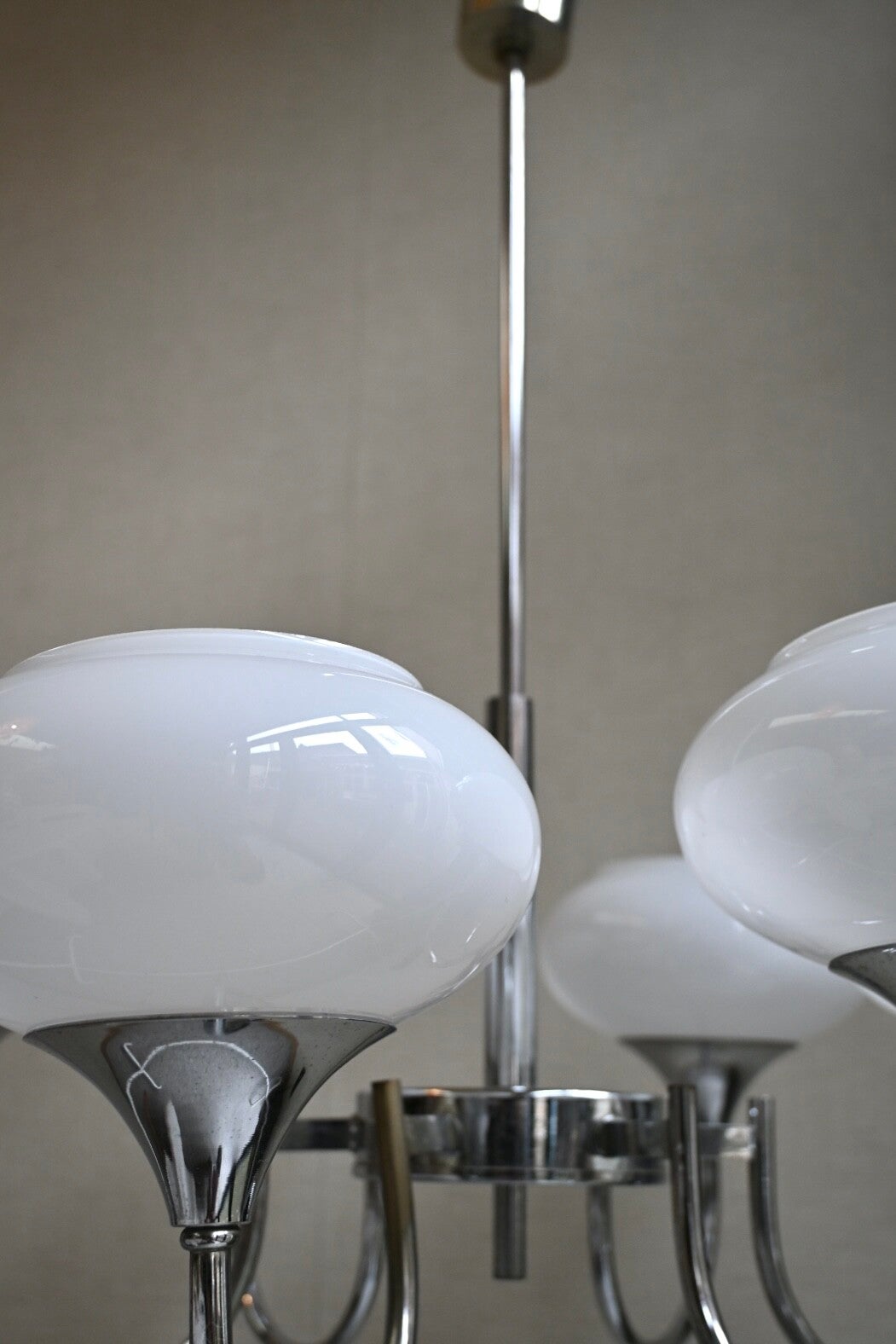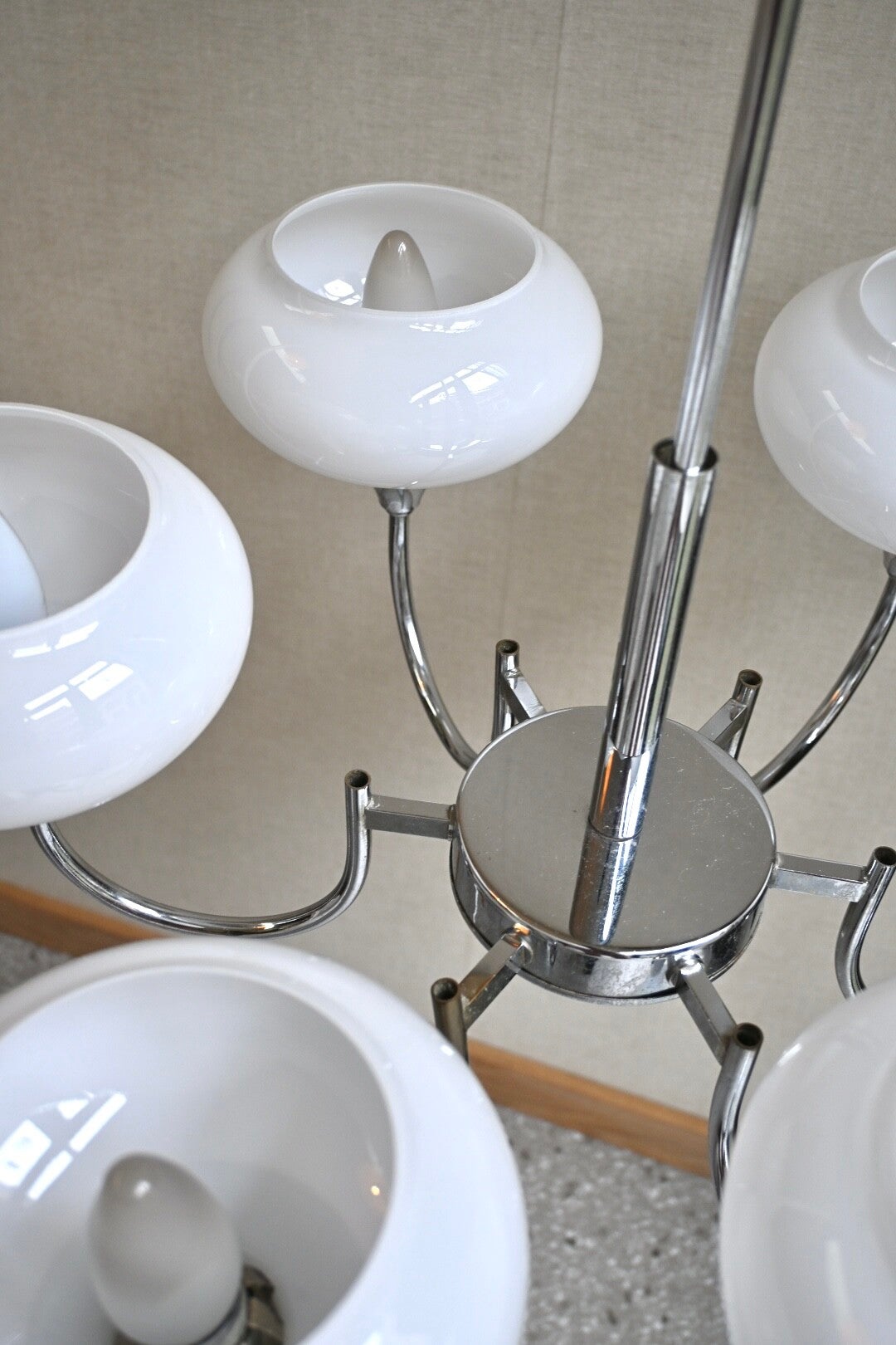 Toffe vintage kroonluchter uit het midden van de 20e eeuw, vaak aangeduid als een "Space Age" of mid-century modern ontwerp uit de jaren 60 of 70. De lamp kenmerkt zich door zes verchroomde armen die elegante witte glazen lampenkappen ondersteunen in een kenmerkende ovale of "persimmon" (vrucht)vorm.