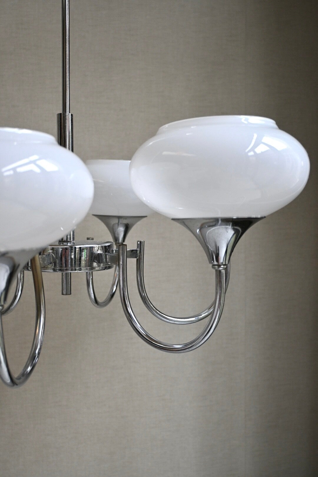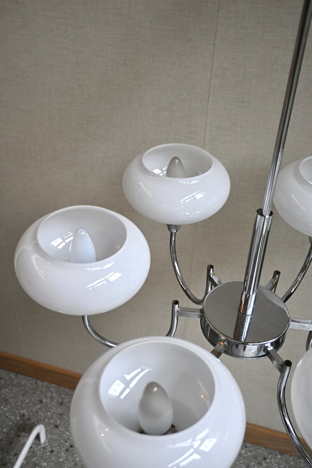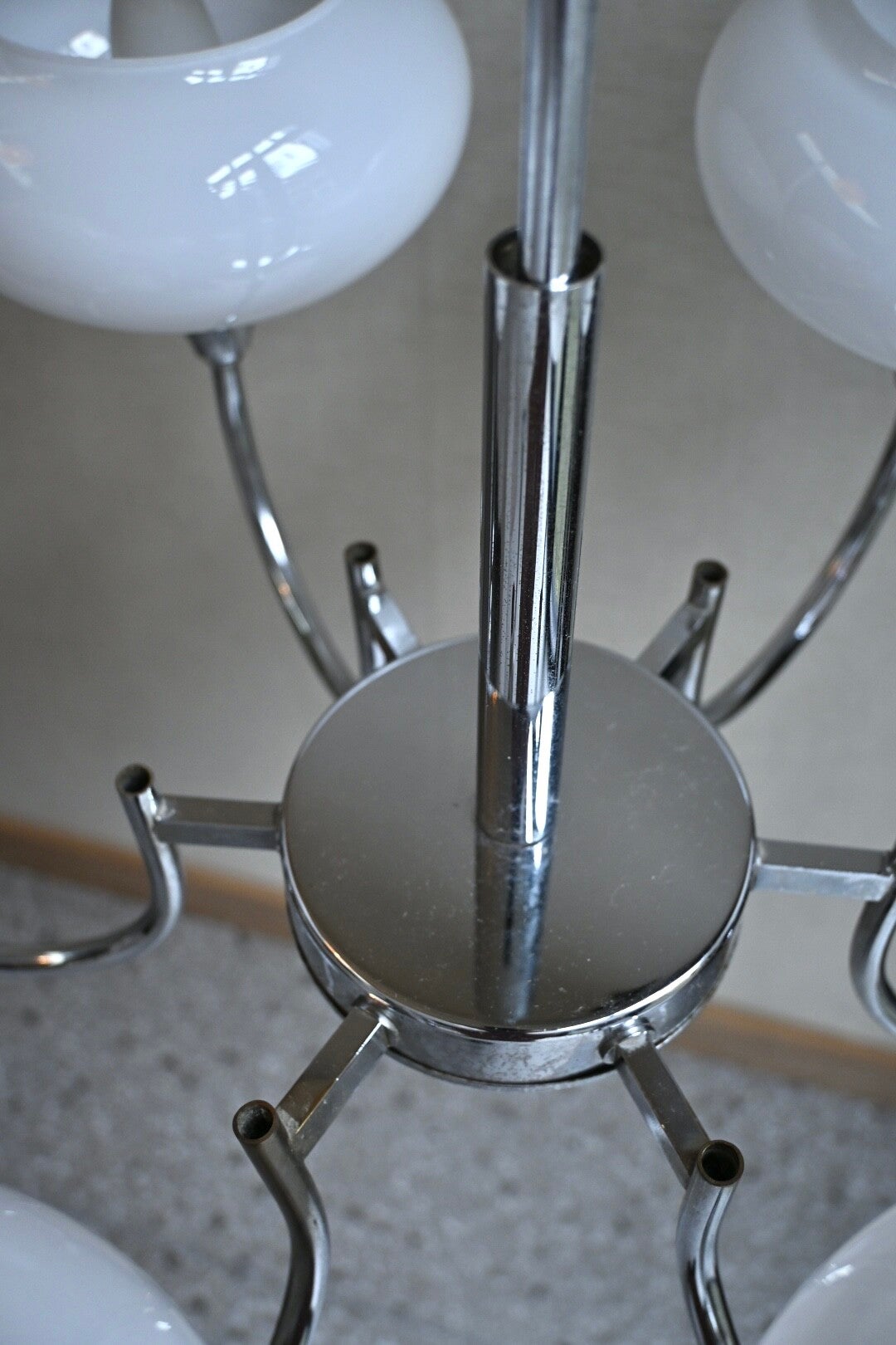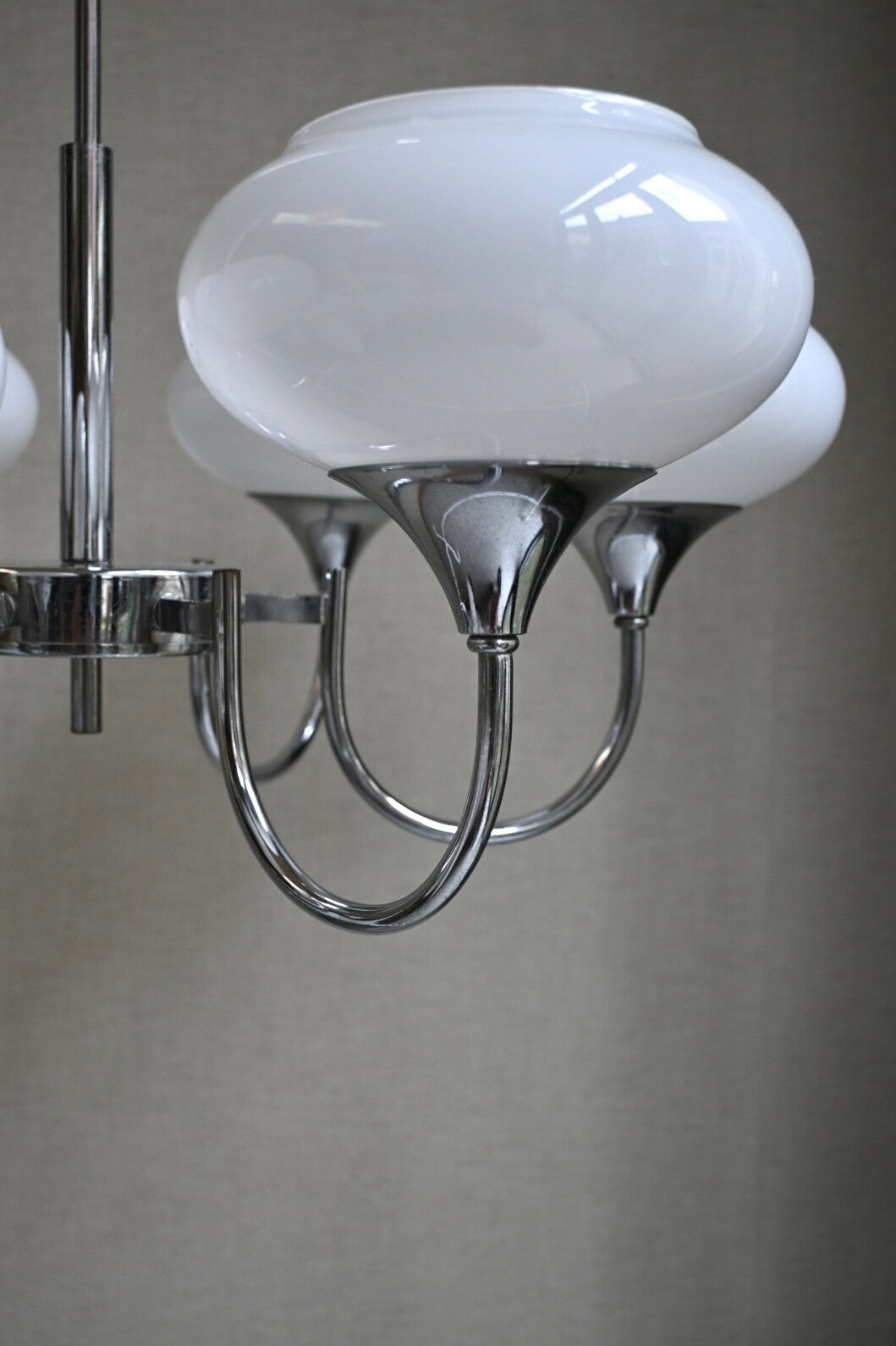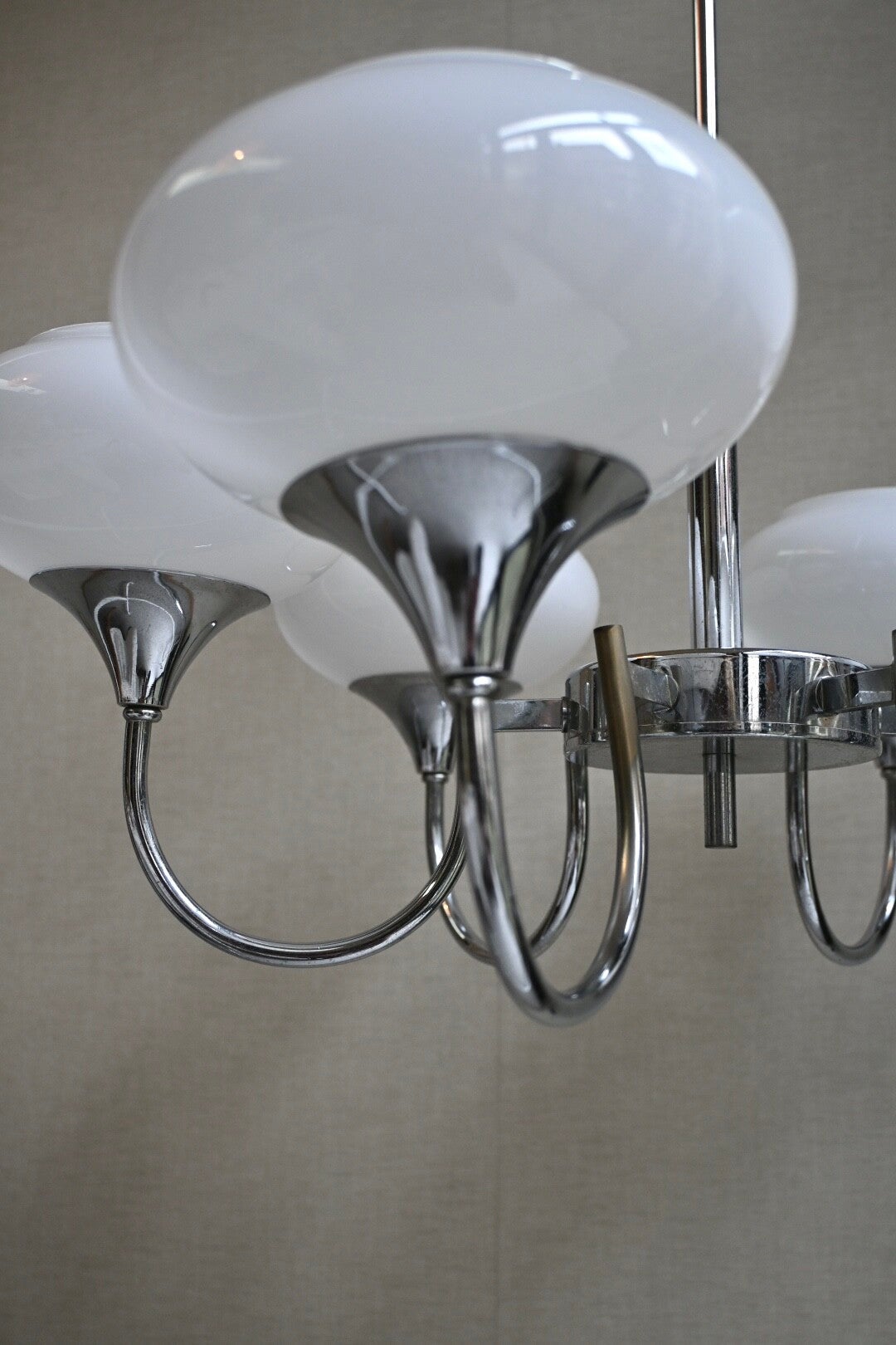 Toffe vintage kroonluchter uit het midden van de 20e eeuw, vaak aangeduid als een "Space Age" of mid-century modern ontwerp uit de jaren 60 of 70. De lamp kenmerkt zich door zes verchroomde armen die elegante witte glazen lampenkappen ondersteunen in een kenmerkende ovale of "persimmon" (vrucht)vorm.