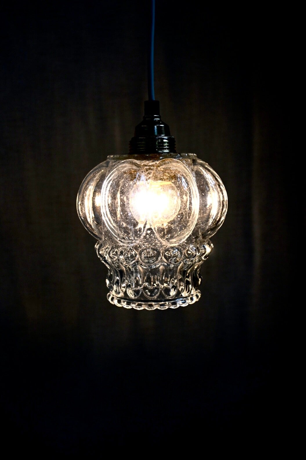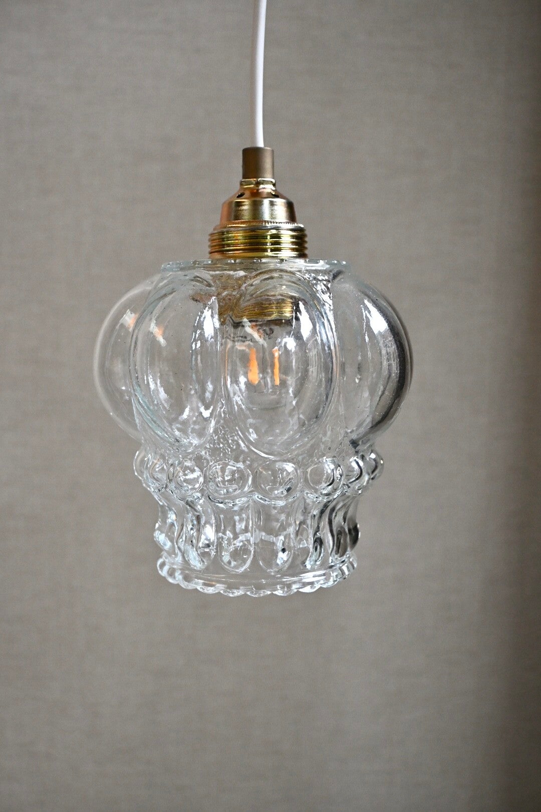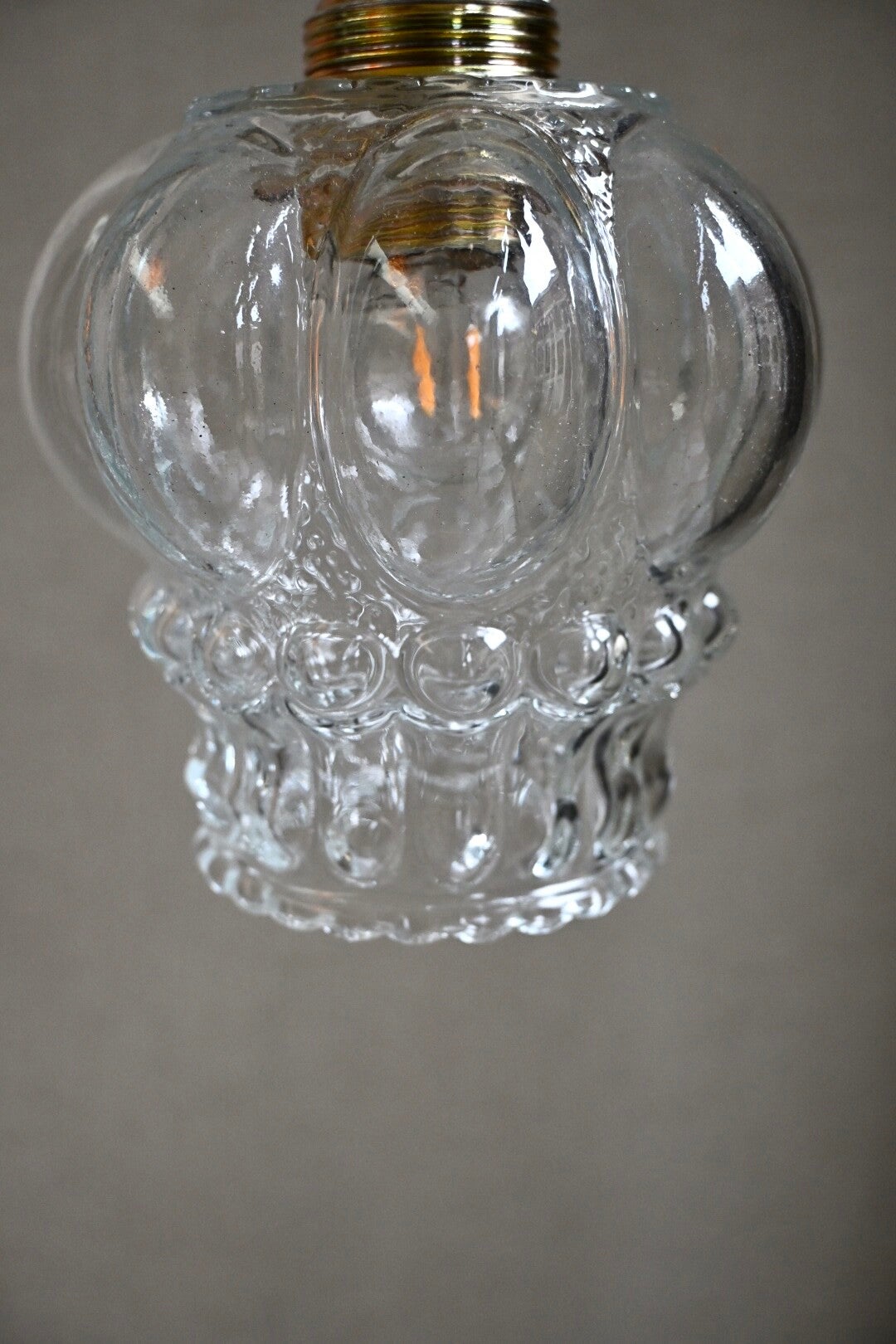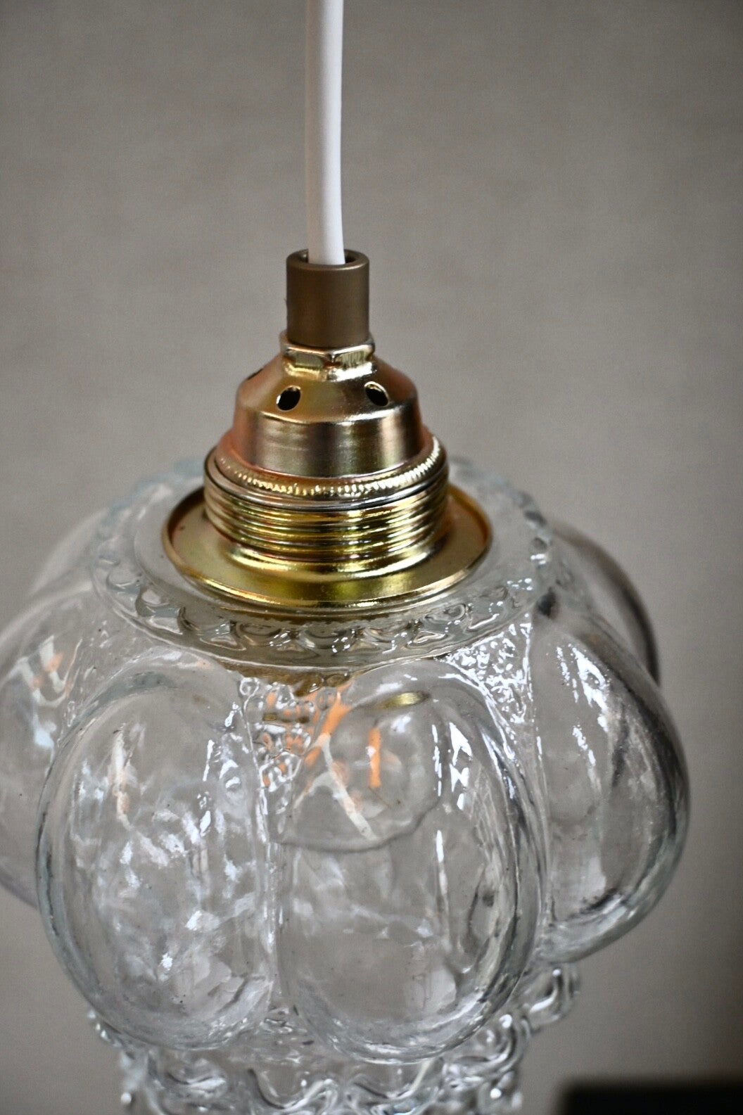 Vintage glazen hanglamp, ook wel bekend als een "Bubble" lamp, die typerend is voor de Mid-century Modern stijl uit de jaren 50 en 60. De lampenkap is gemaakt van dik, transparant glas met een opvallende bubbel/reliëfstructuur.