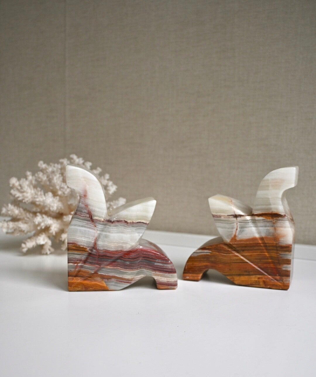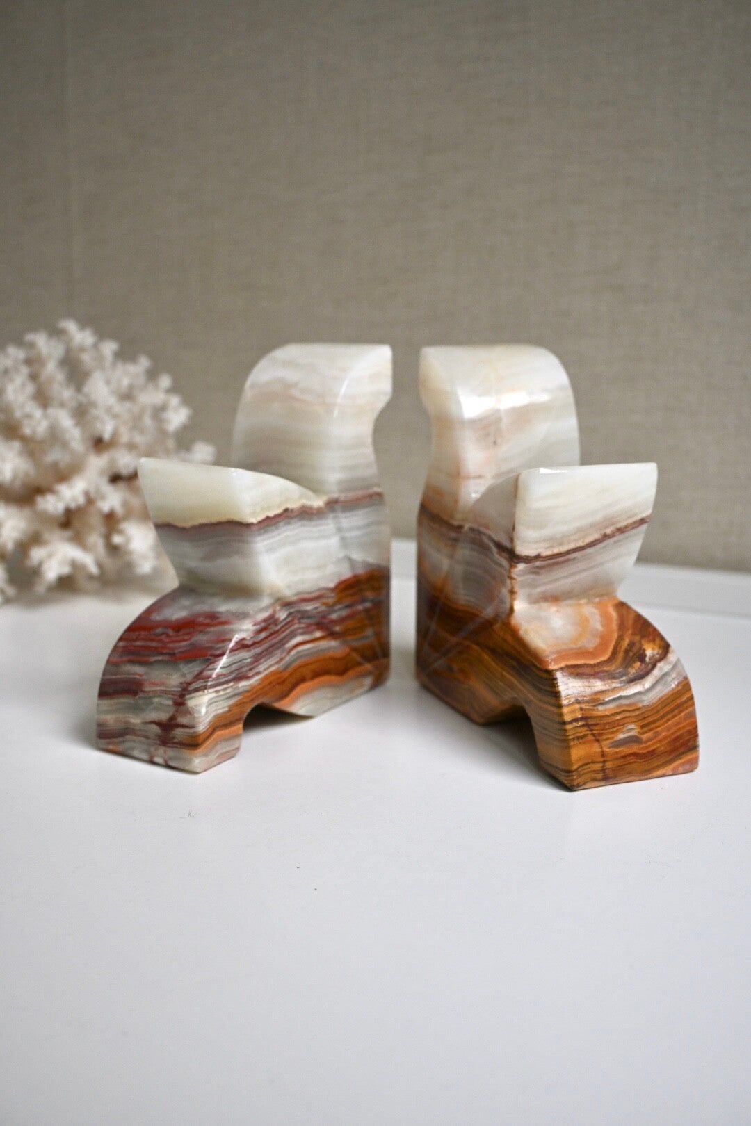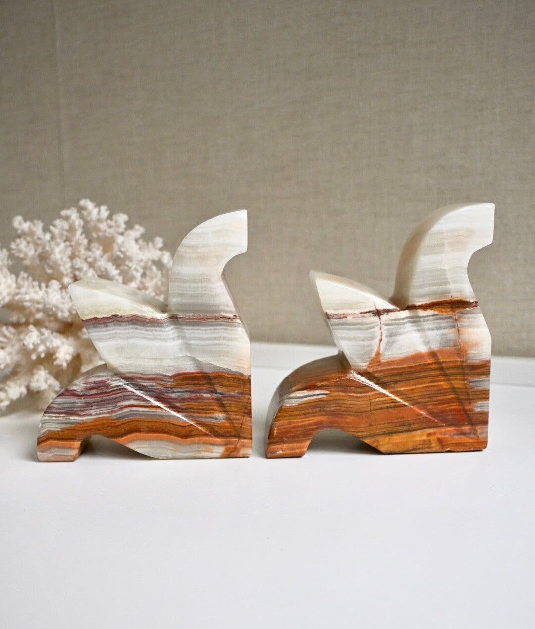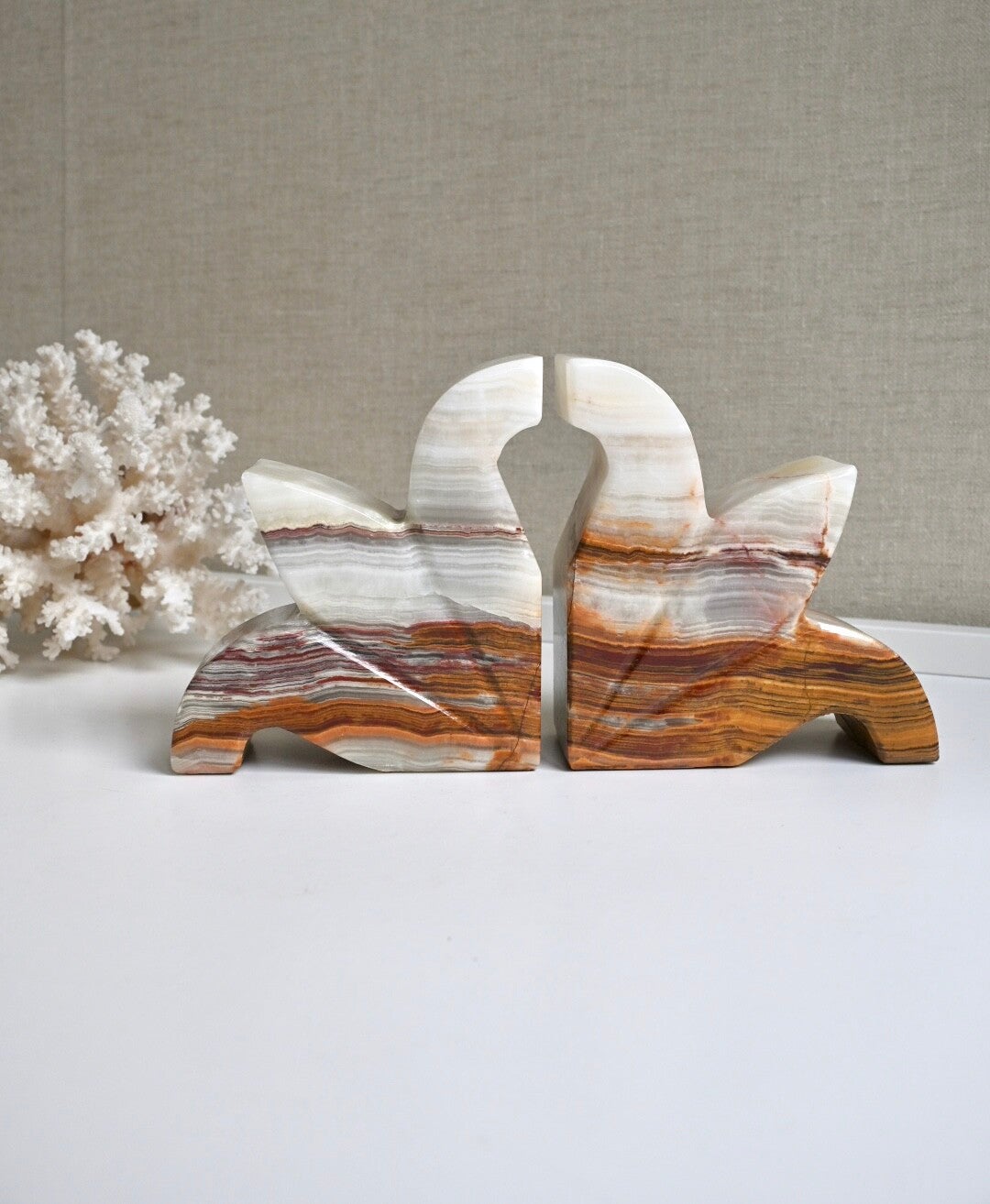 Breng karakter en een vleugje luxe in je interieur met deze prachtige set vintage boekensteunen. Deze boekensteunen zijn niet zomaar functioneel, het zijn ware natuurlijke kunstwerken. Ze zijn met de hand gesneden uit hoogwaardig onyx marmer.