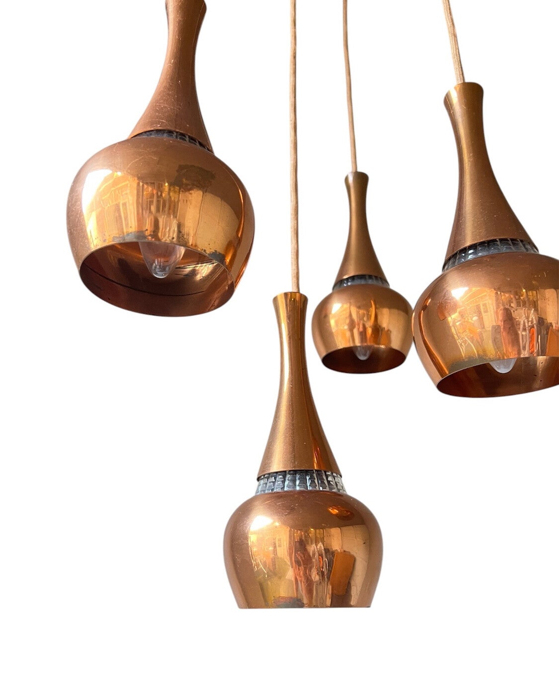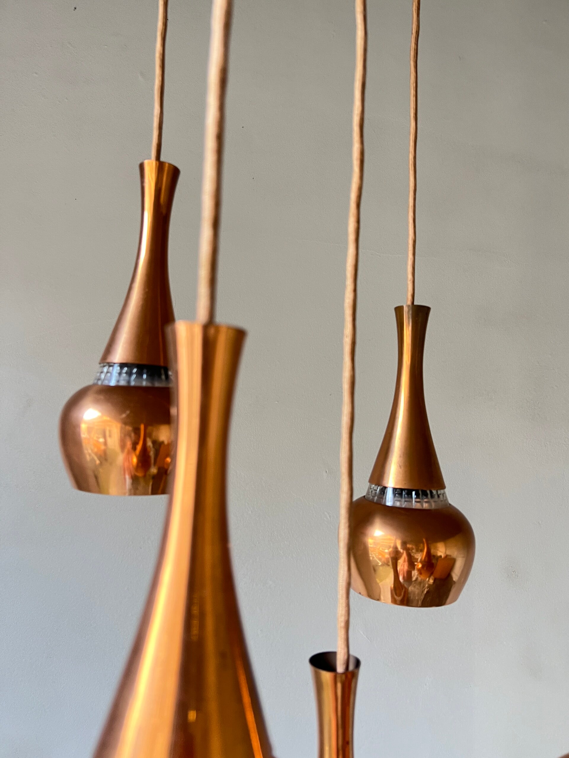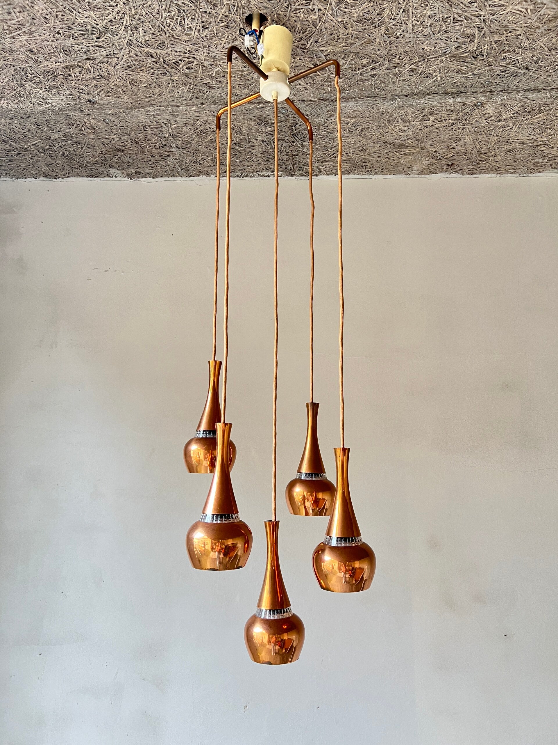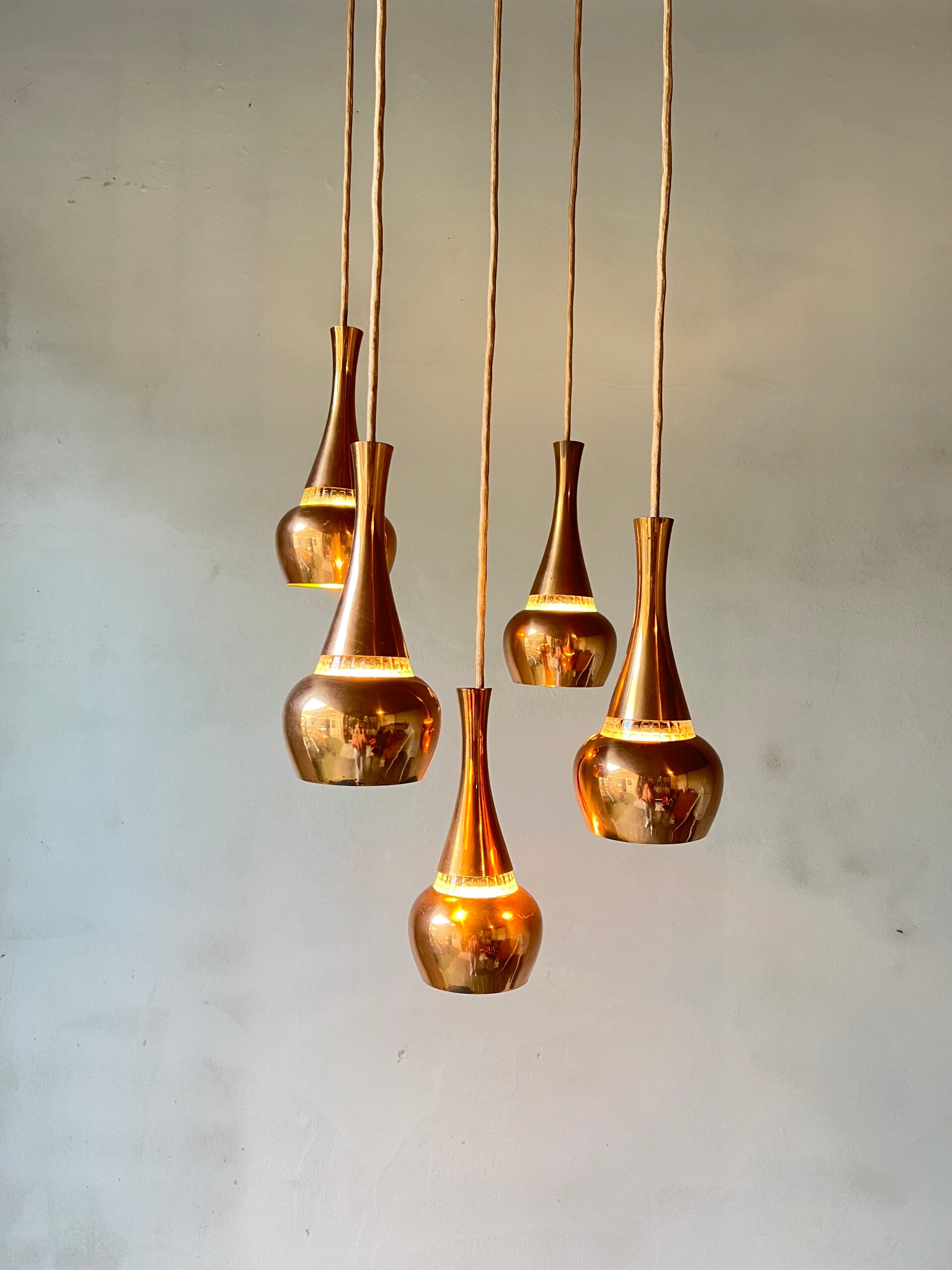 Mooie eyecatcher is deze vintage design koperen cascade hanglamp met maar liefst 5 messing kelken in verschillende hoogtes. Niet gemerkt maar een prachtig design in een mooie vintage conditie.