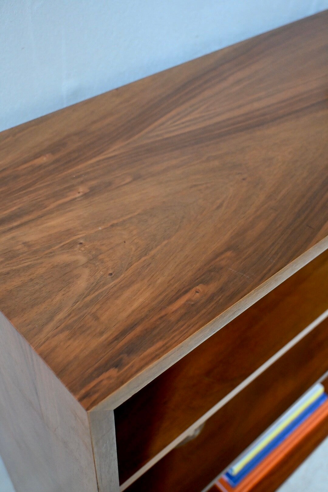 Stijlvolle mid-century boekenkast uitgevoerd in warm teak fineer. Het ontwerp kenmerkt zich door strakke lijnen, conische houten poten en een open indeling. Perfect voor het tentoonstellen van keramiek, boeken of verzamelobjecten. Een tijdloos meubelstuk dat zowel functioneel als decoratief is.