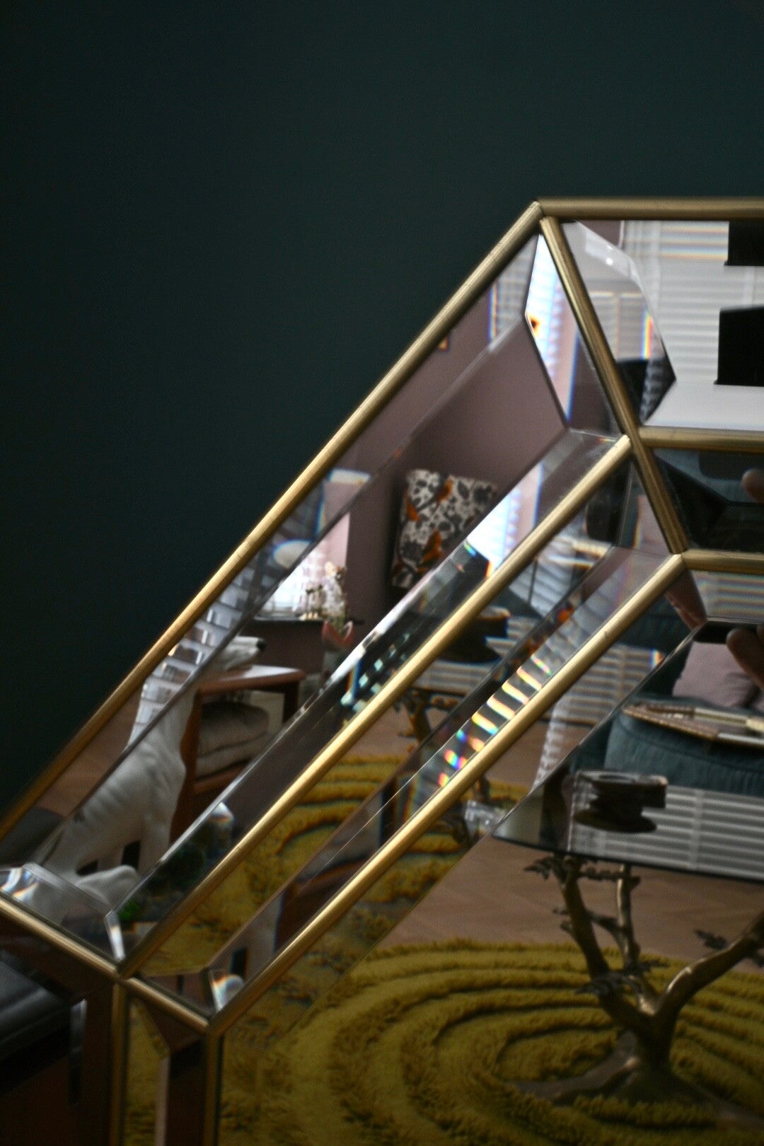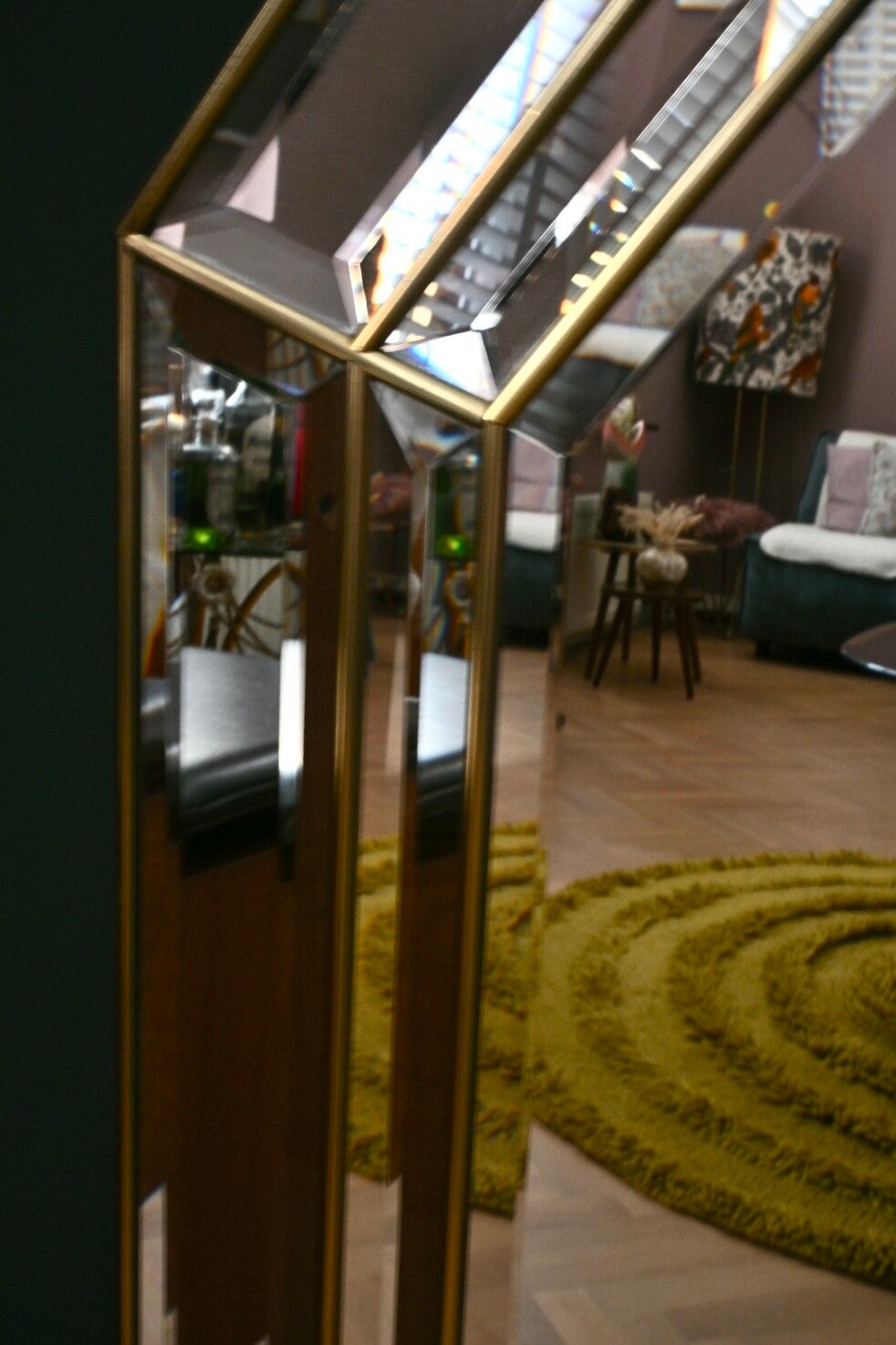 Deze grote spiegel is een ware eyecatcher voor in je interieur, de individueel geslepen randen fungeren als prisma's, waardoor de spiegel vanuit elke hoek een andere schittering geeft. Subtiele, goudkleurige lijnen tussen de glaslagen accentueren de achthoekige vorm en geven het geheel een warme, luxe uitstraling.