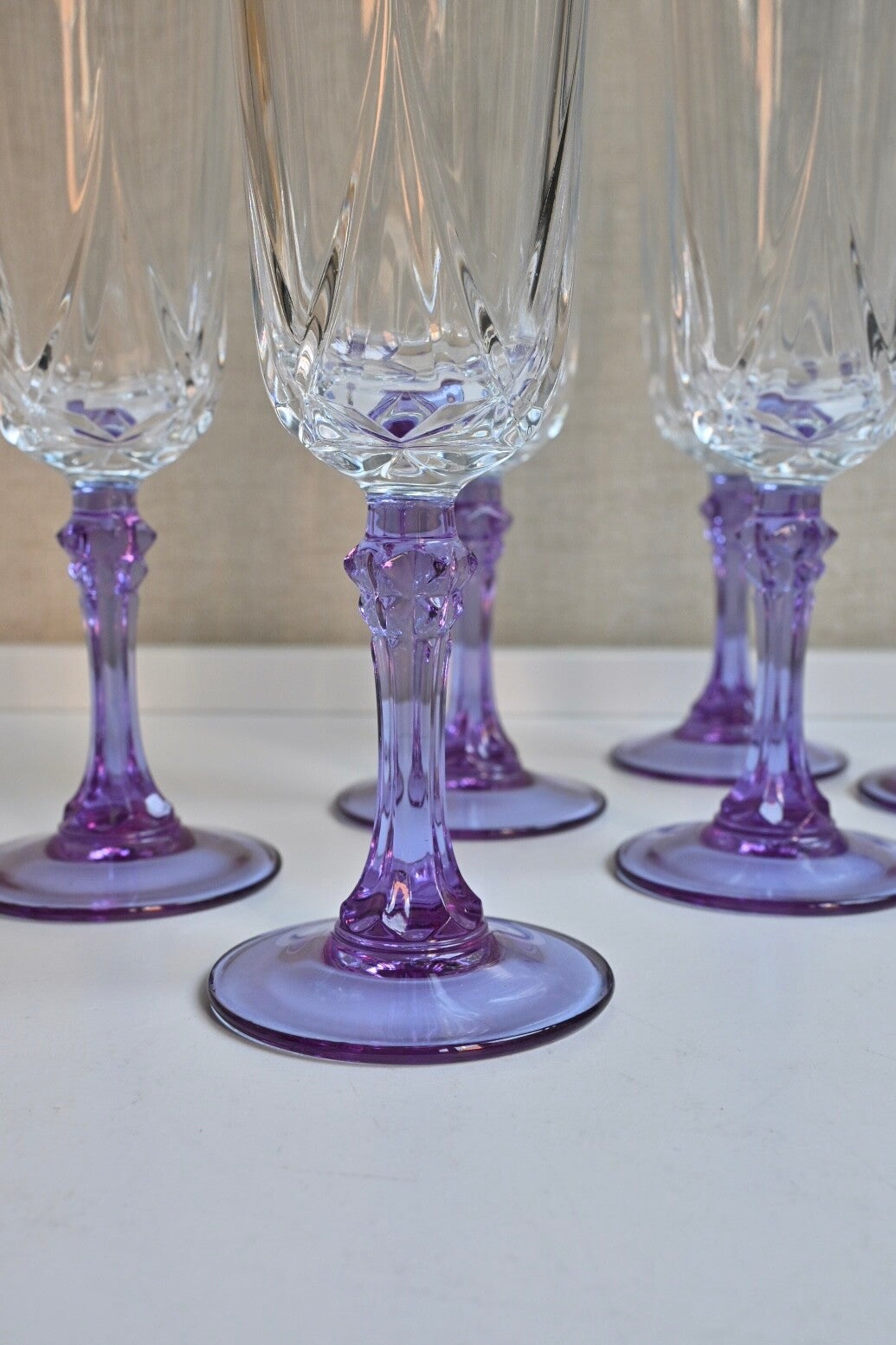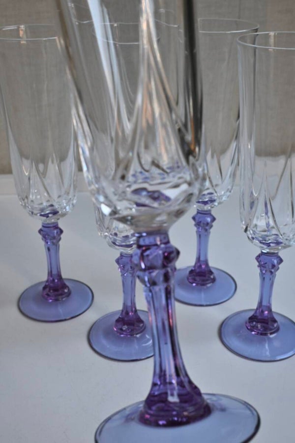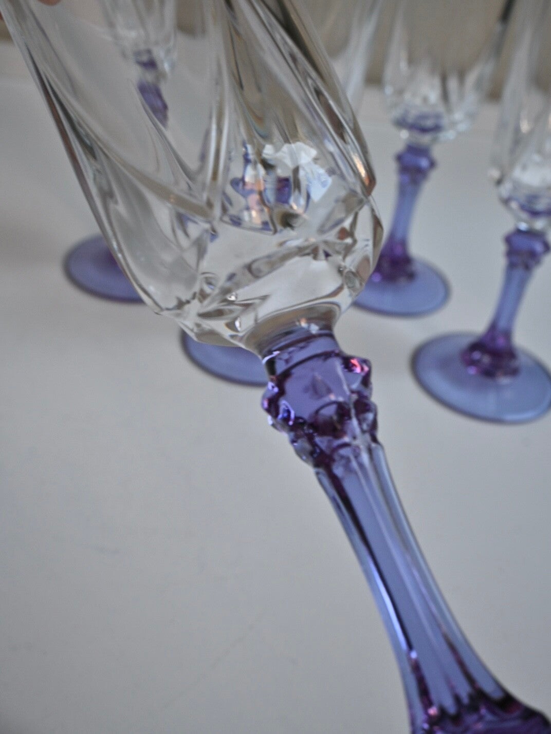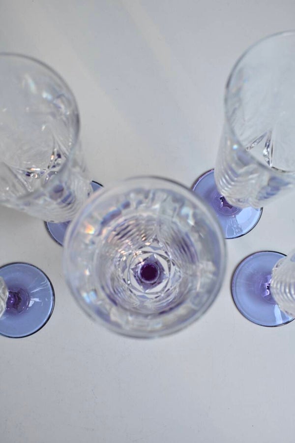 De glazen hebben een heldere kelk met een gefacetteerd patroon dat overloopt in een paarse steel en zijn vervaardigd uit kristalglas.