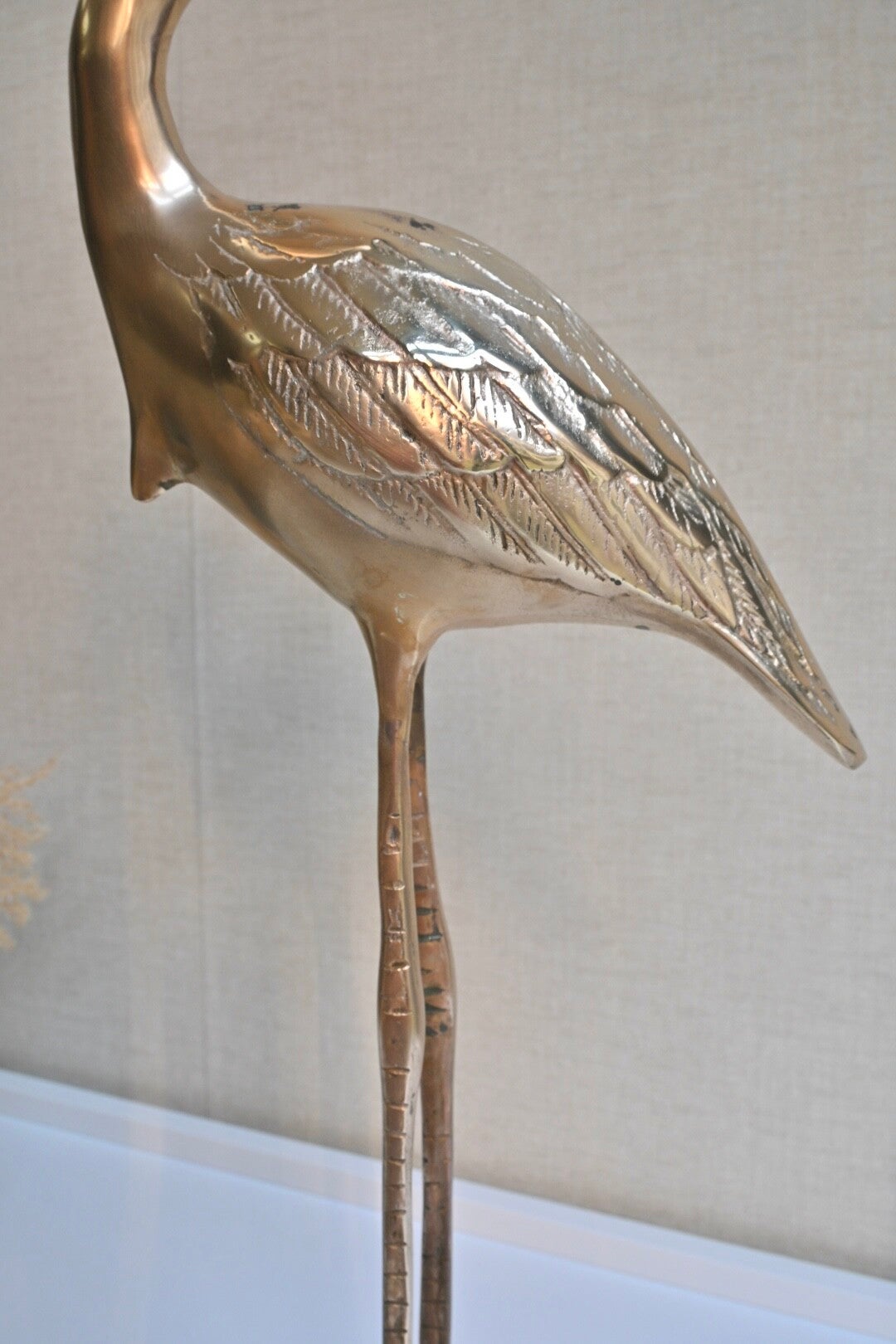 Vintage XL messing kraanvogel, dit stijlvolle object is gemaakt van messing en verkeert in een mooie staat. Hier en daar zitten kleine plekjes patina. Dankzij de slanke vorm en de warme goudglans is het een echte blikvanger op een dressoir, in een vakkenkast of gewoon op de vloer.