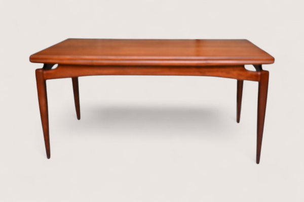Prachtige vintage design XXL eettafel ontworpen door Louis van Teeffelen in de jaren 60 in Nederland. Bijzonder zeldzame uitvoering. Het lijkt wel het blad zweeft boven de stijlvol rank gevormde poten. De tafel bestaat uit massief teak hout en teak fineer en is verlengbaar. Deze tafel bevindt zich in zeer goede vintage staat.