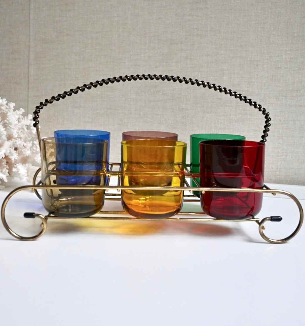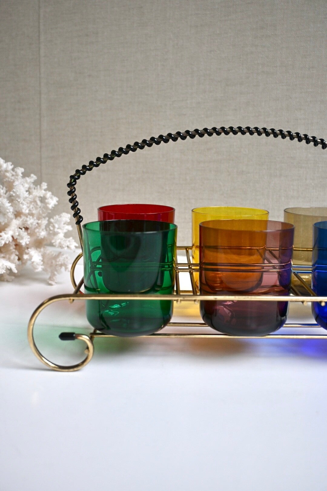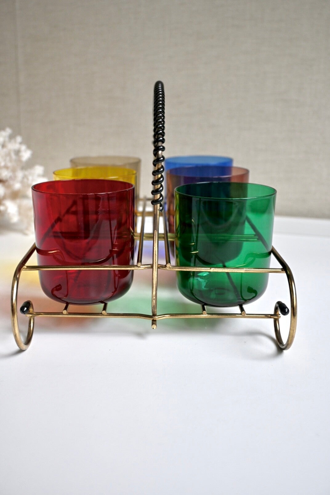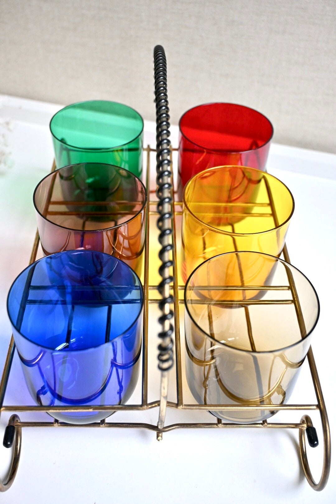 Deze set van zes gekleurde glazen in een bijbehorend rekje is een typisch voorbeeld van een vintage barset uit de jaren 50/60. Dergelijke sets worden vaak omschreven als "harlekijn" drinkglazen vanwege de verschillende kleuren. Alles is nog tip top in orde geen chips!