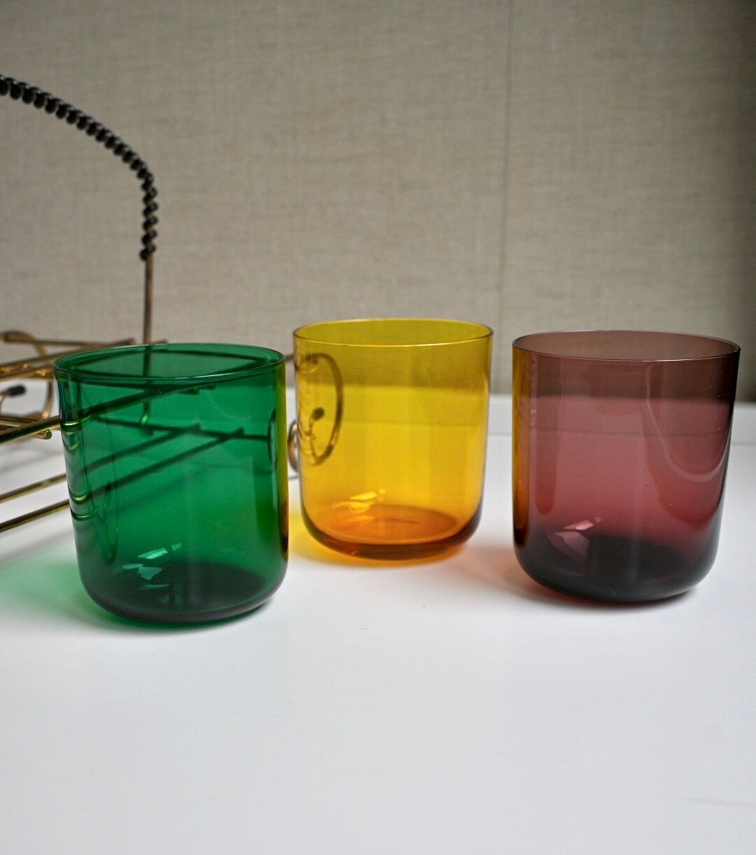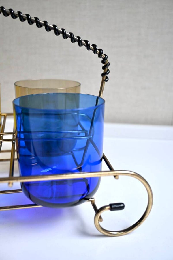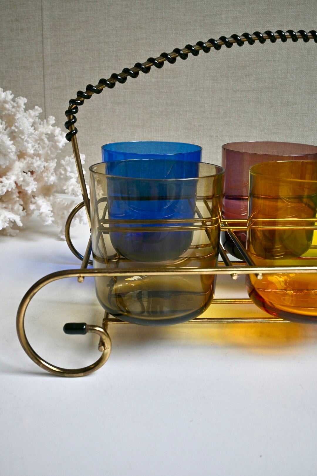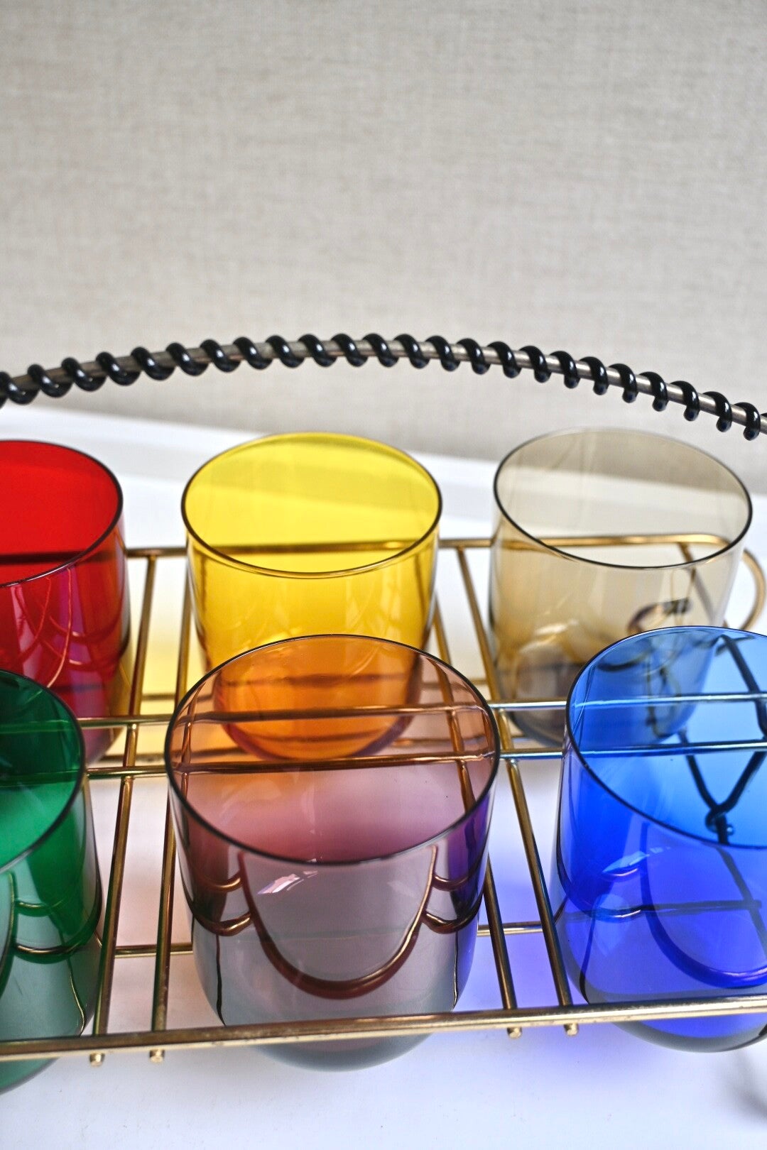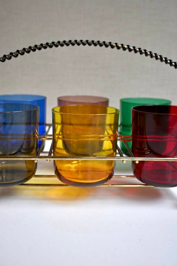 Deze set van zes gekleurde glazen in een bijbehorend rekje is een typisch voorbeeld van een vintage barset uit de jaren 50/60. Dergelijke sets worden vaak omschreven als "harlekijn" drinkglazen vanwege de verschillende kleuren. Alles is nog tip top in orde geen chips!