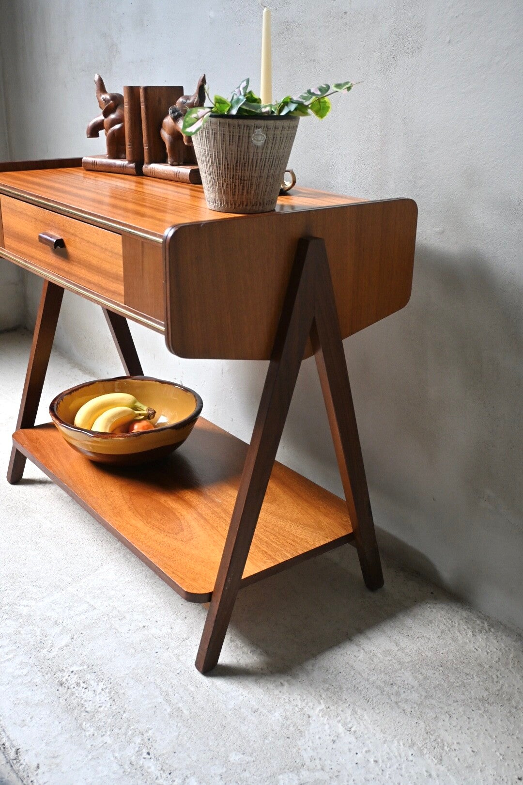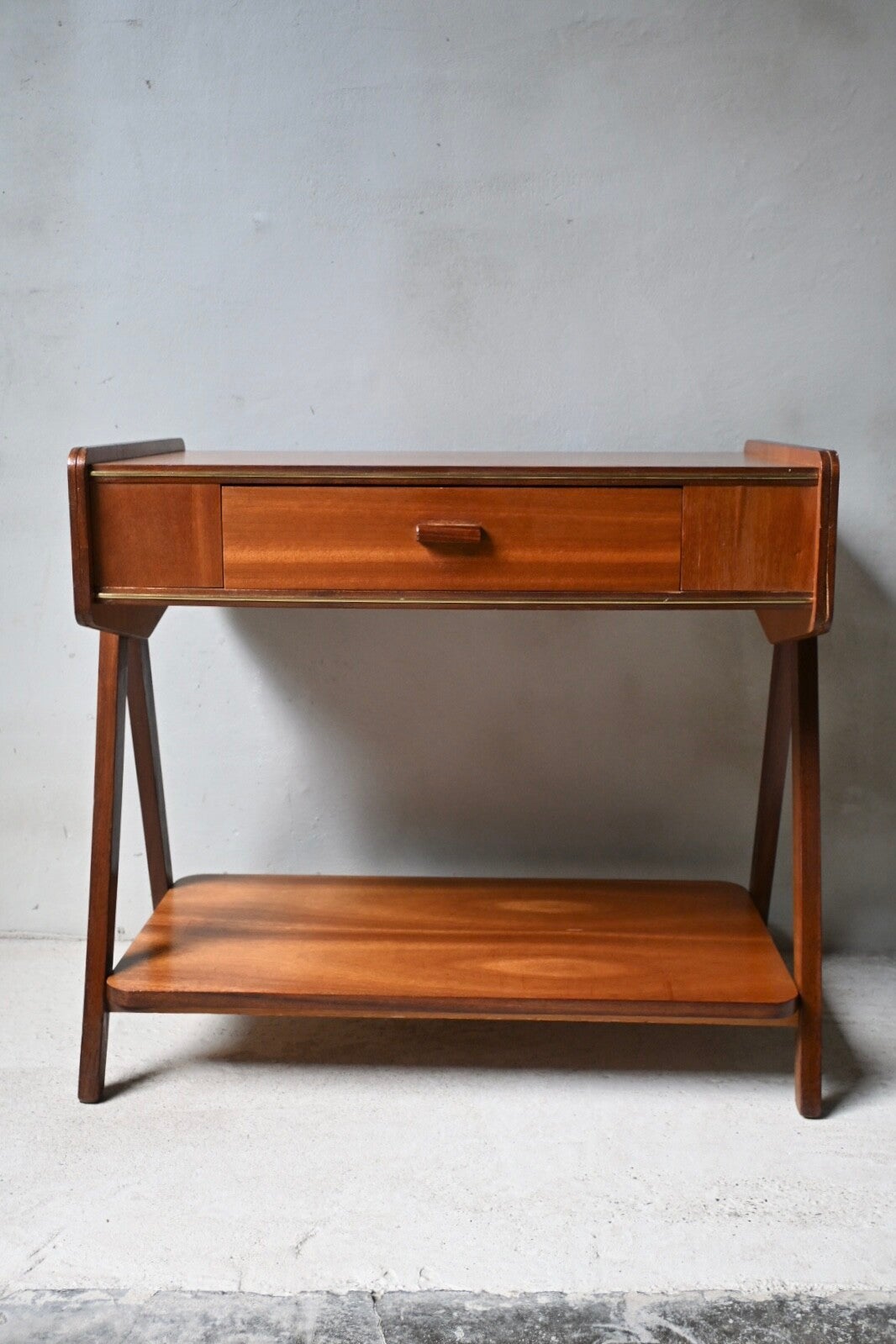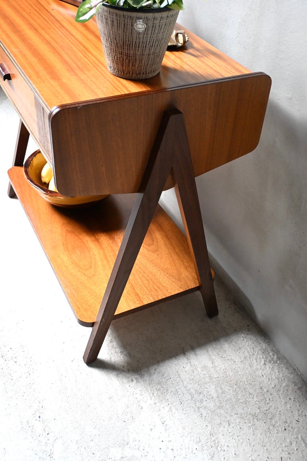 Mid-century bijzettafel massief hout en teakfineer. Het ontwerp is kenmerkend voor het mid-century modern design, met strakke lijnen en schuine poten. Extra handig is de lade die in het tafeltje verwerkt zit.